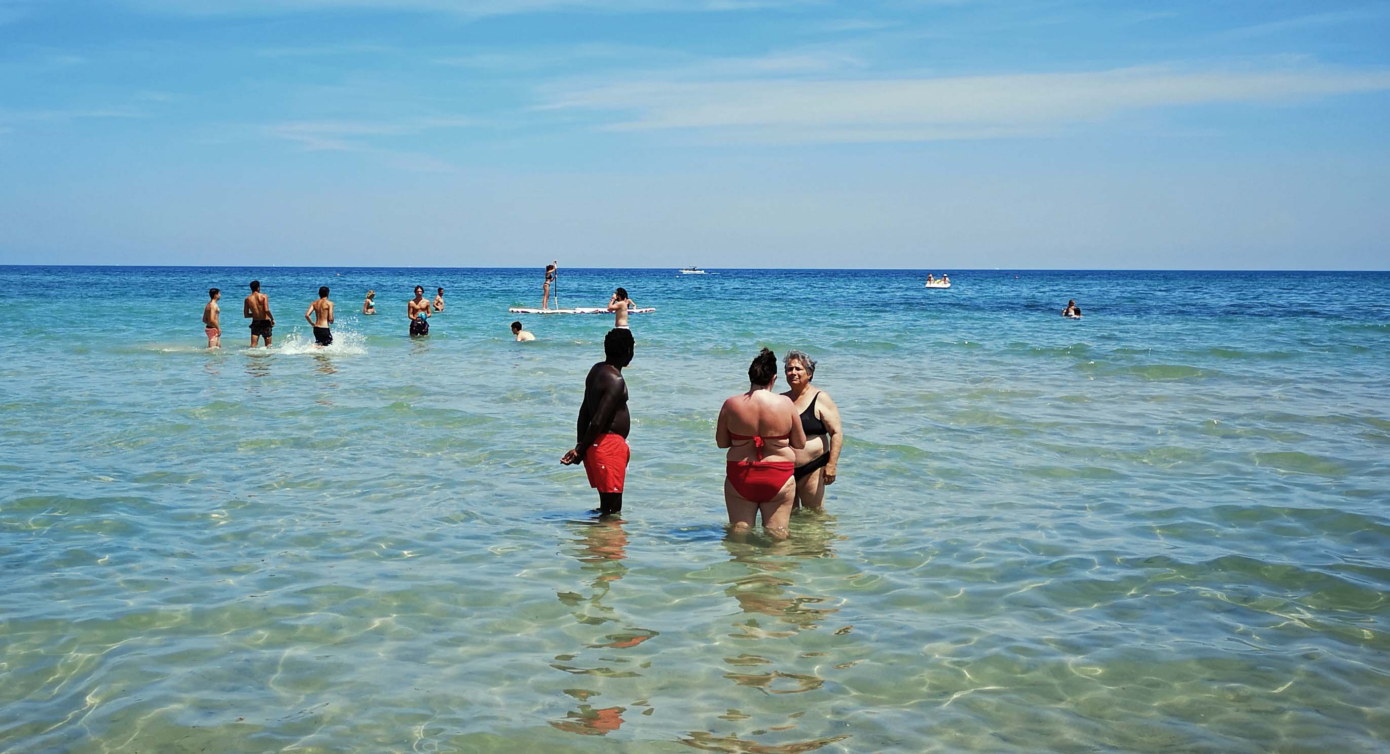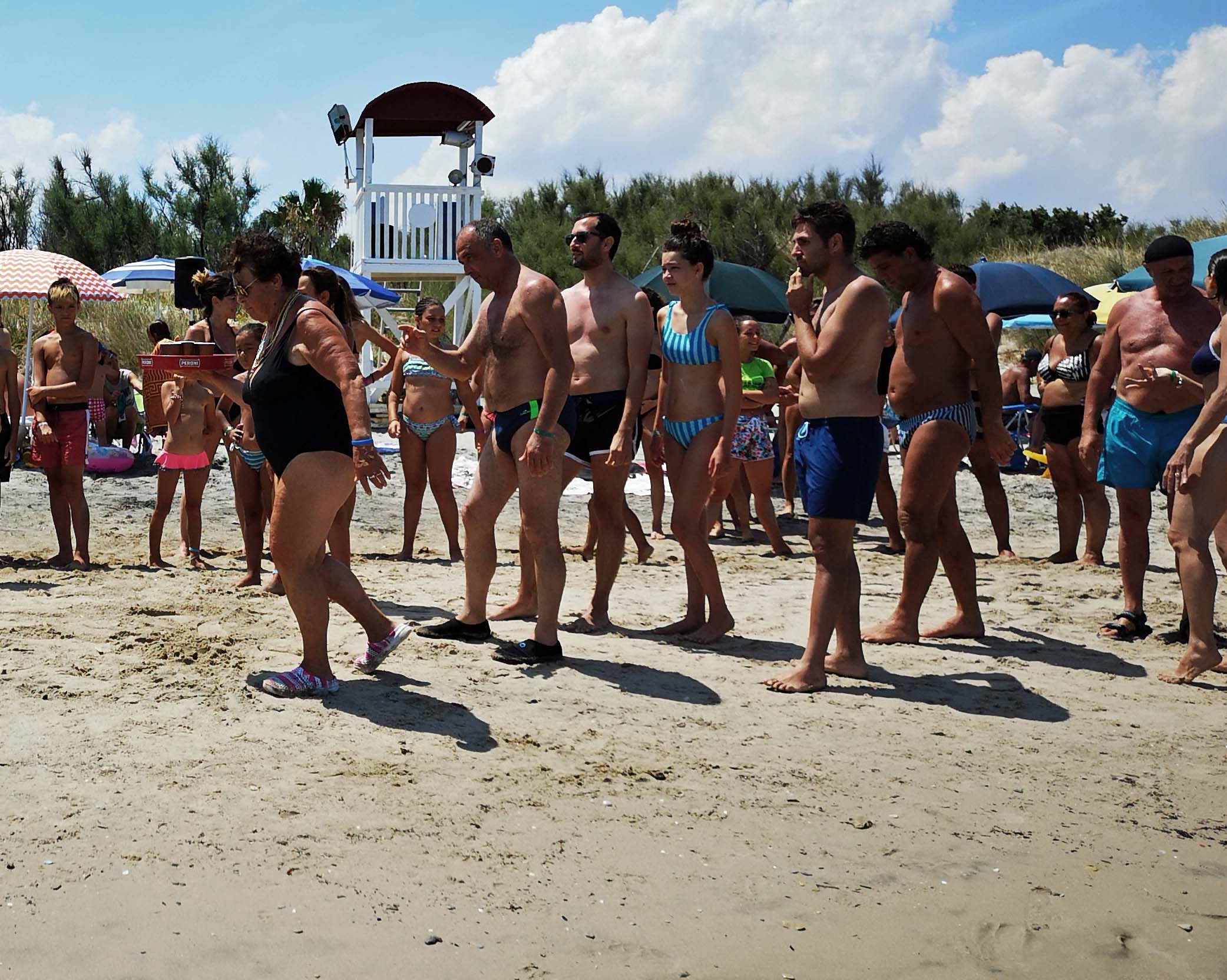 Jetzt sehe ich mir doch mal die Animation aus der Nähe an und mische mich unter das Badegast-Gewühl. Laut, lauter, am lautesten. Jung, älter, am Ältesten. Fast jeder macht irgendwie mit, auch wenn es nur mit einer wippenden Fußspitze ist, und jeder fühlt sich offensichtlich pudelwohl. Und das geht nun bis zum 28. August! Jeden Tag! Großfamilien haben neben den Wahnsinns-Lautsprechern ihr Lager aufgeschlagen, und die, die Geld haben, mieten sich Liegen und Sonnenschirme. Nervig sind die zahllosen fliegenden Händler, die noch schlimmere Sachen anbieten, wie in den Touriläden der Städte. Ein No, grazie aber reicht aus, und sie laufen zielstrebig zum nächsten Opfer. Und trotz alledem ist es schön!