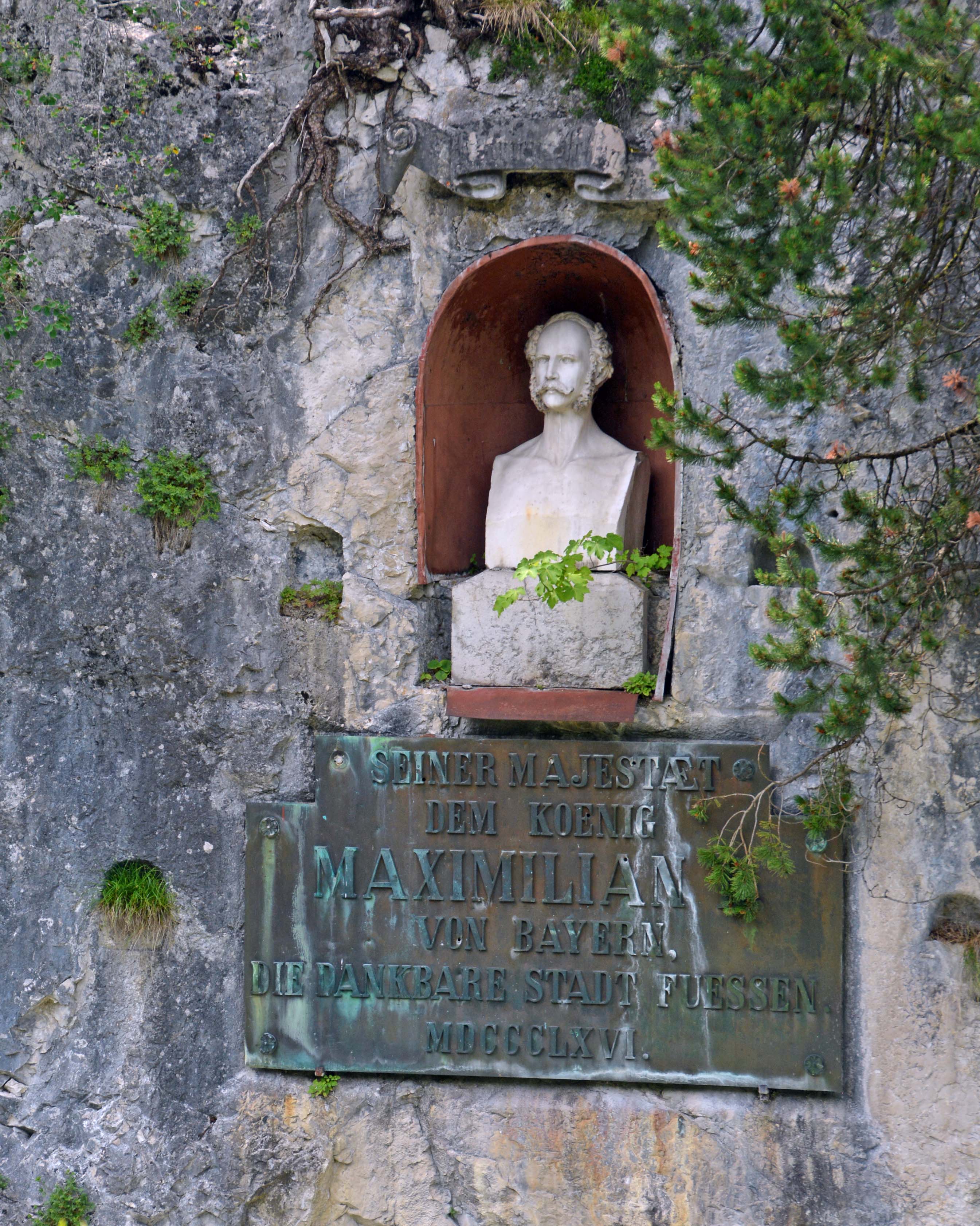 Der Lechfall ergießt sich fünfstufig über eine im 18. Jhd. angelegte Staustufe in eine enge Klamm, die vom ‚Max-Steg‘ überspannt wird. Von einer Aussichtsplattform entdecke ich die in eine Felswand eingelassene Büste von König Maximilian II. von Bayern. Ganz in der Nähe führte auch hier die römische Staatsstraße Via Claudia Augusta vorbei.