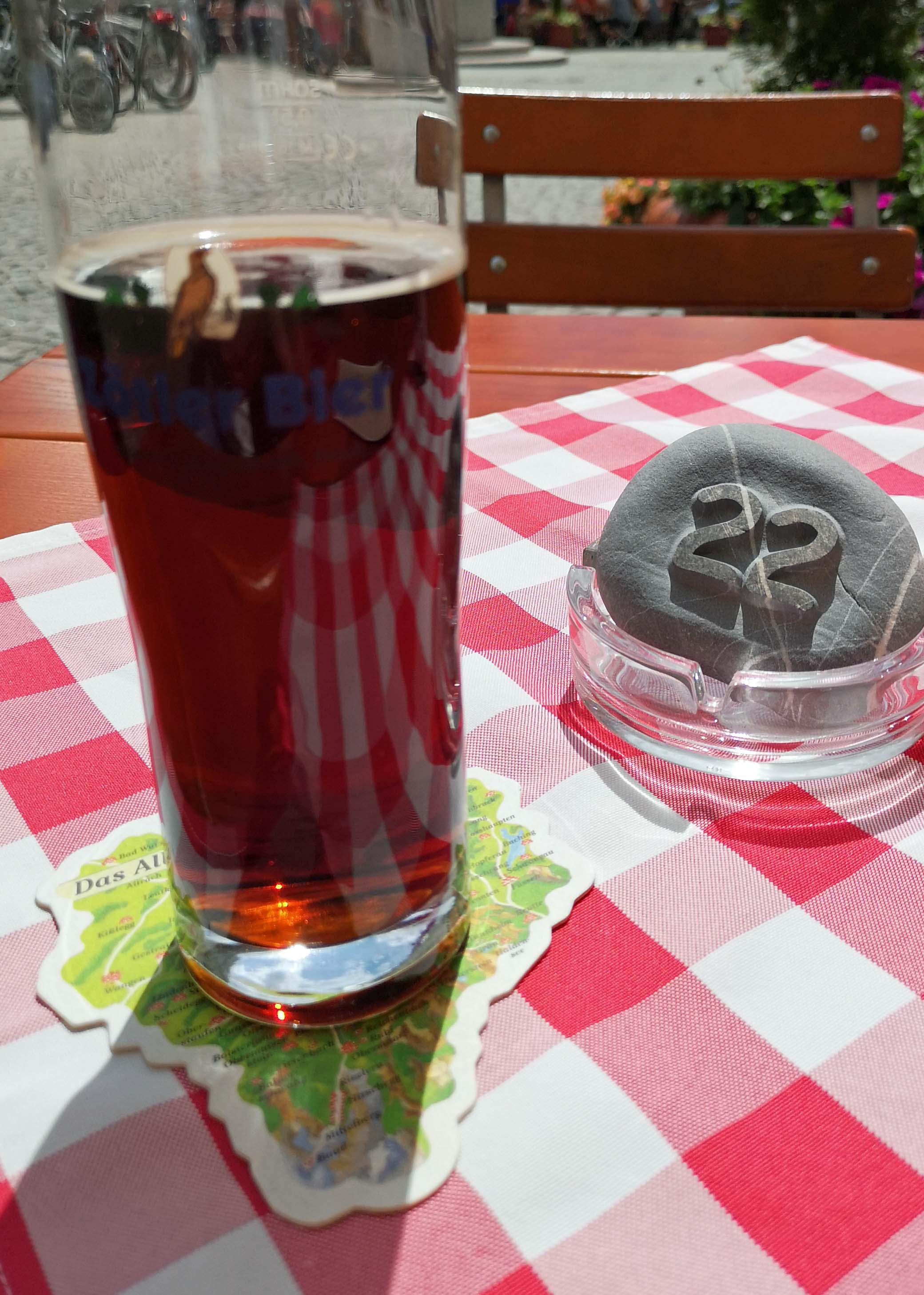 Die Sonne scheint nochmal kräftig für eine Stunde, bis der Himmel fast schwarz wird. Alle räumen in Windeseile Stühle und Tische weg und flüchten in ihre Wohnmobile. Wenige Sekunden später prasselt ergiebiger Regen für die nächsten zwei Stunden herunter. Ich sitze gemütlich im Fiete II, trinke Kaffee und blogge. Nebenbei ziehe ich mir einige italienische Vokabeln rein. Es ist total gemütlich und entspannend. Am Abend – es hat aufgehört zu regnen – unterhalte ich mich mit meiner Nachbarin, die ebenfalls solo unterwegs ist. Danach entschließe ich mich, in der Hütte ‚Zum Platzl‘ auf dem Platzl etwas zu essen. Natürlich einen bayerischen Leberkäs‘ mit Spiegelei und Bratkartoffeln, dazu ein kühles Dunkles einer Privatbrauerei.