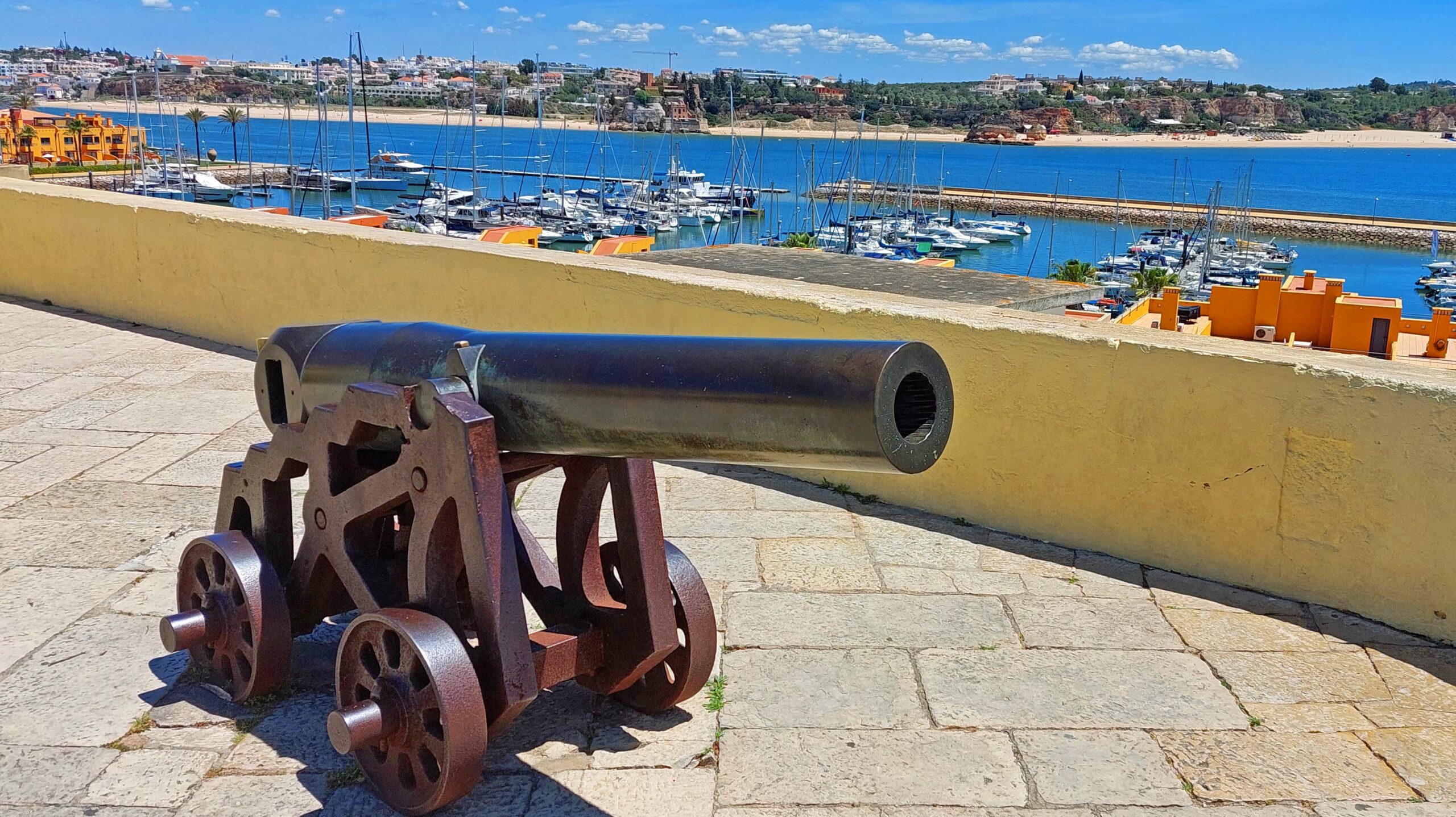 Schon dreihundert Meter weiter führt eine lange Treppe hinauf zum Fortaleza Santa Catarina mit einer großen Terrasse, von der ich eine super Aussicht auf Ferragudo, das Meer, den Yachthafen, den Fluss, den Strand und die Umgebung habe. Das mittelalterliche Gebäude aus dem 17. Jahrhundert diente damals als Verteidigung, um sich vor Piratenüberfällen zu schützen und ist heute ein bisschen verwahrlost.