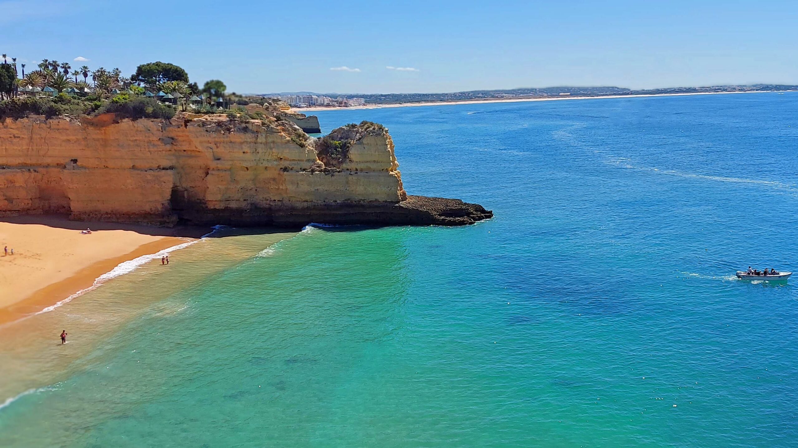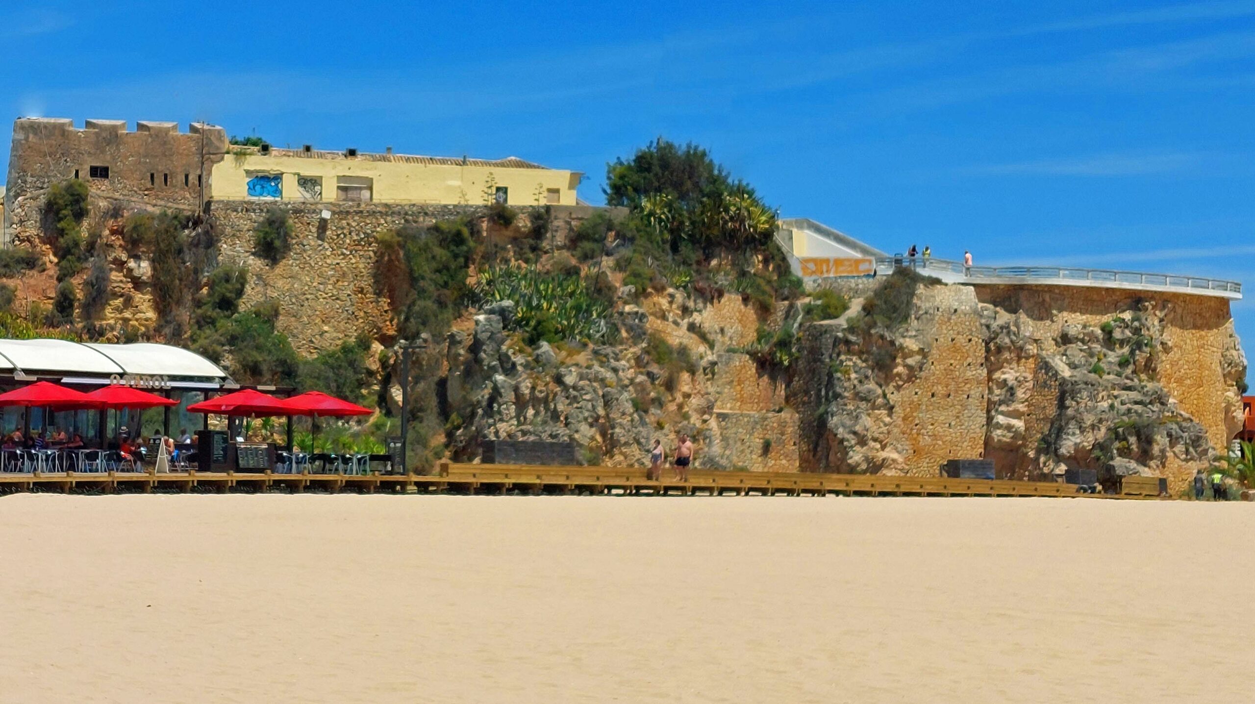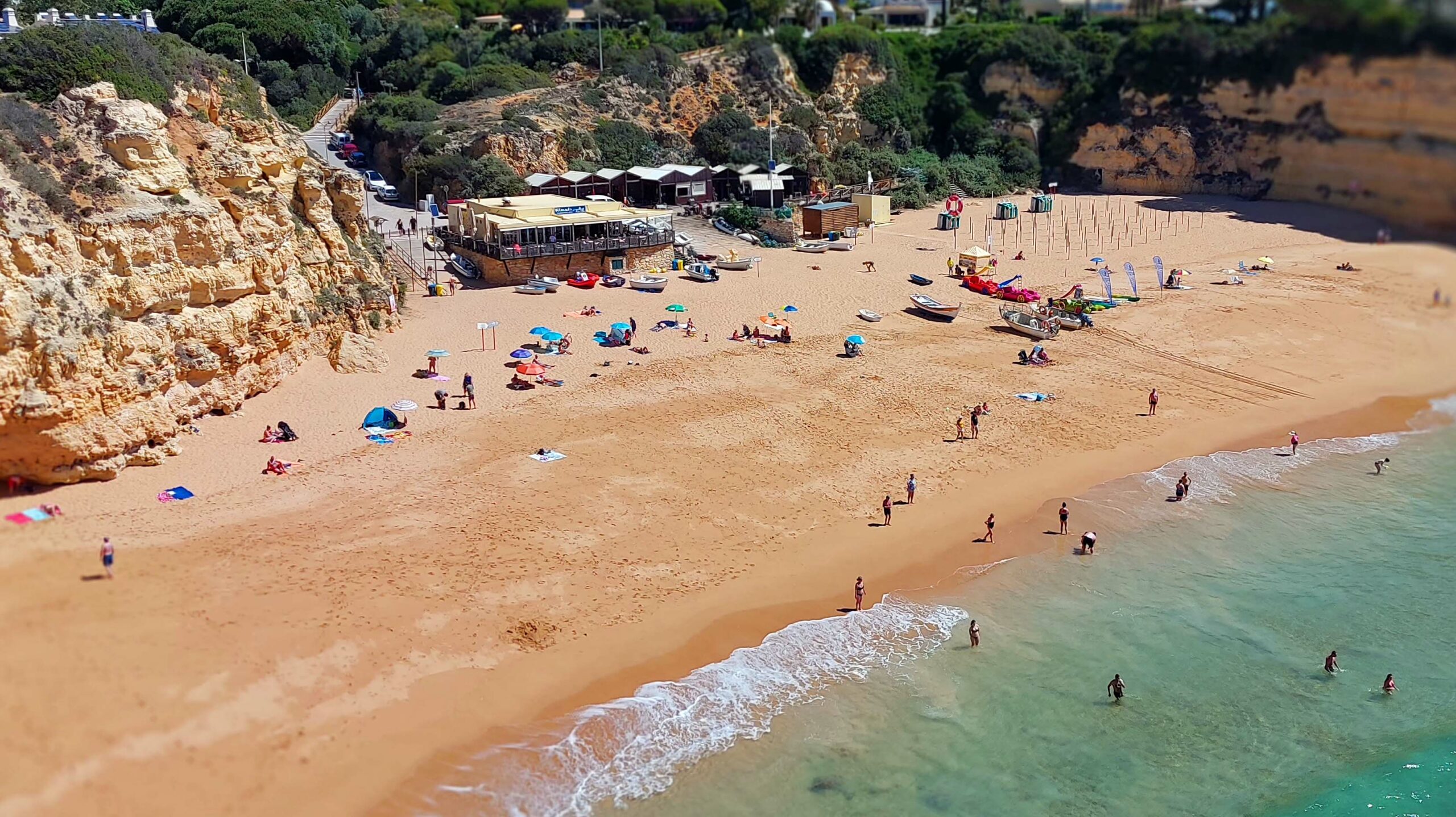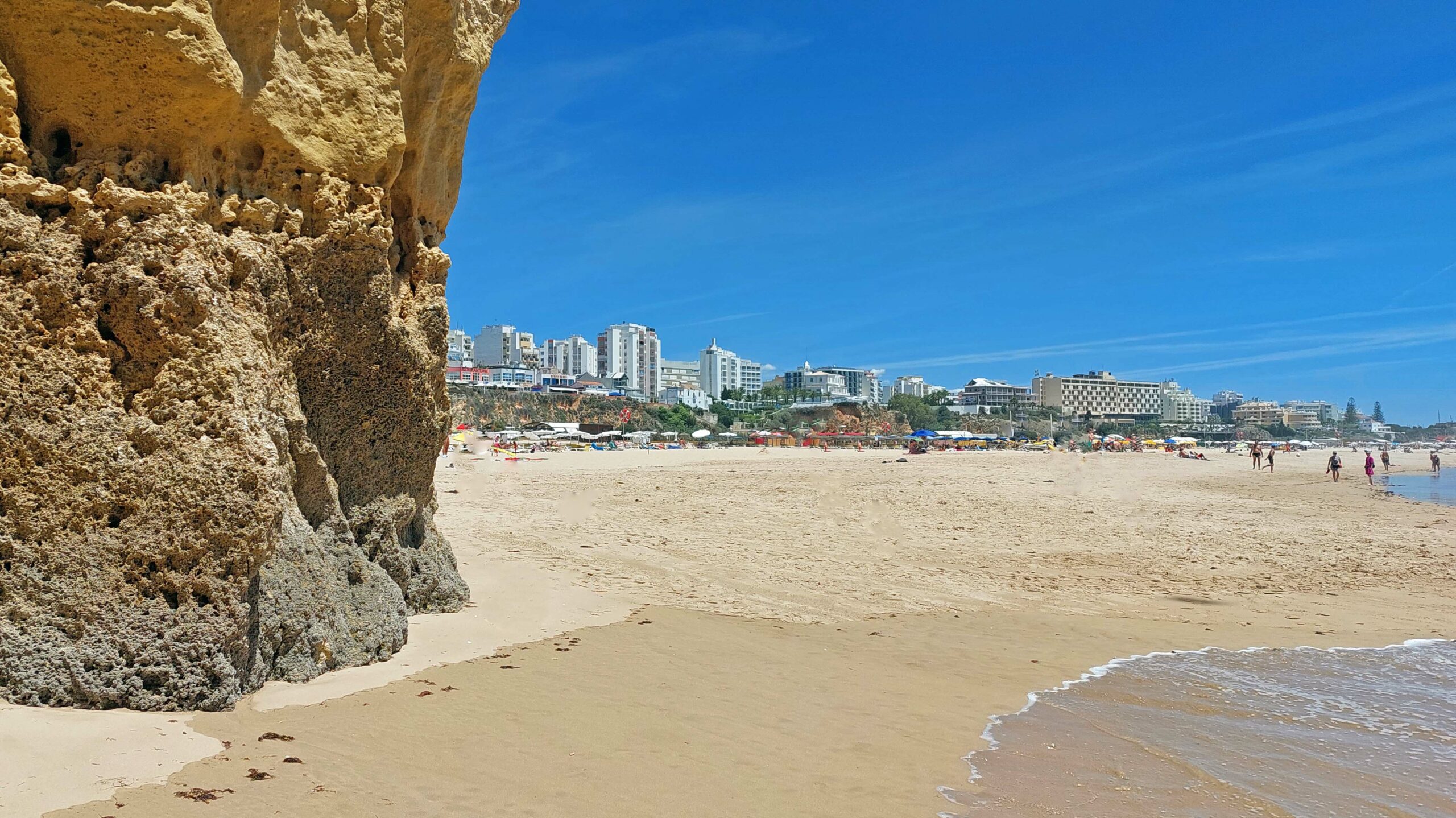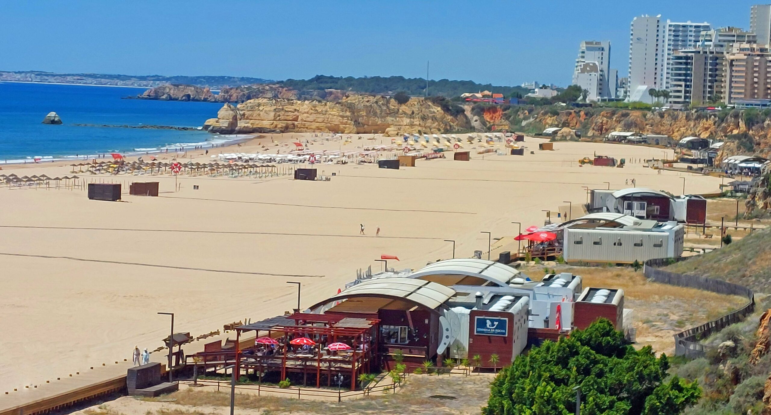 Warum dieser Küstenabschnitt der schönste Strand an der Algarve sein soll, erschließt sich mir nicht wirklich. 🙁 Ja, der Anblick auf den Atlantik und die ockerfarbenen Felsblöcke ist malerisch. Die Landseite allerdings ist für mich eine Katastrophe. Zahlreiche, hässliche Hotelkomplexe, Bretterbuden-Bars und Schnellrestaurants zeugen von den Bausünden der 70er Jahre. Trotzdem gehört er offensichtlich zu den Beliebtesten Stränden der Touris aus Europa und den USA.