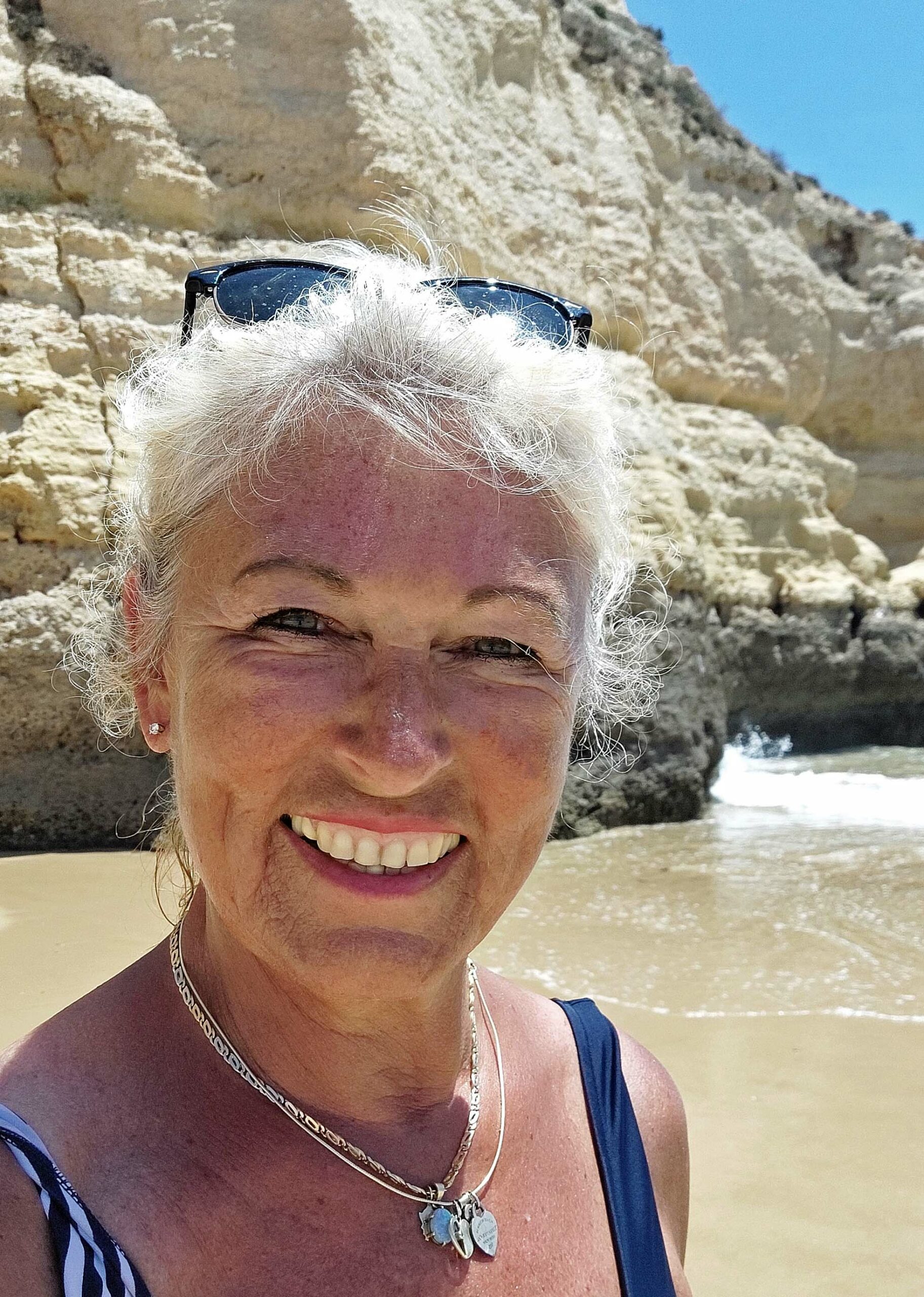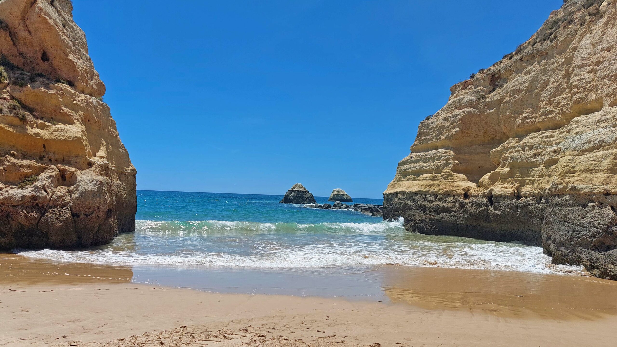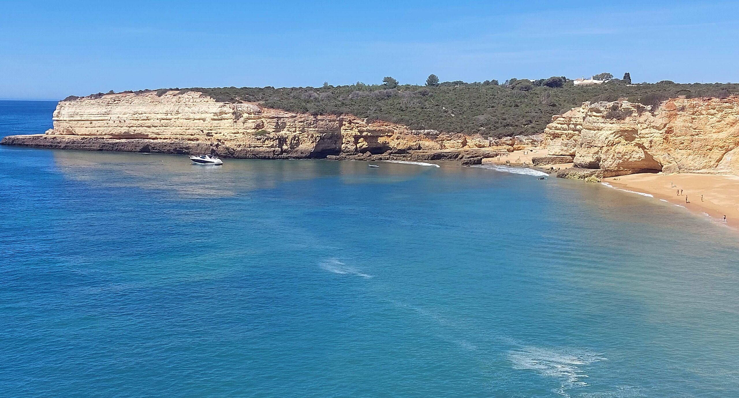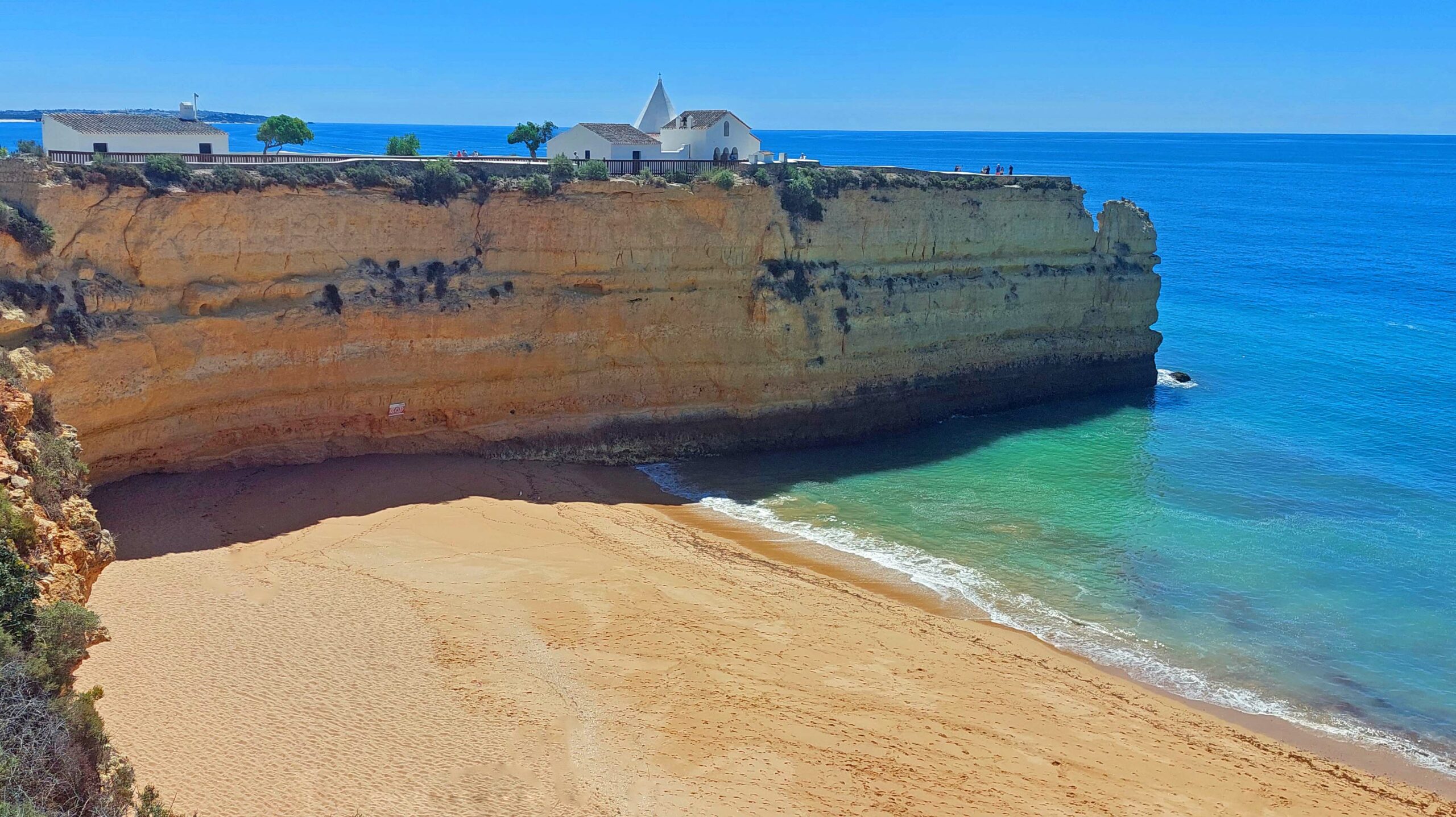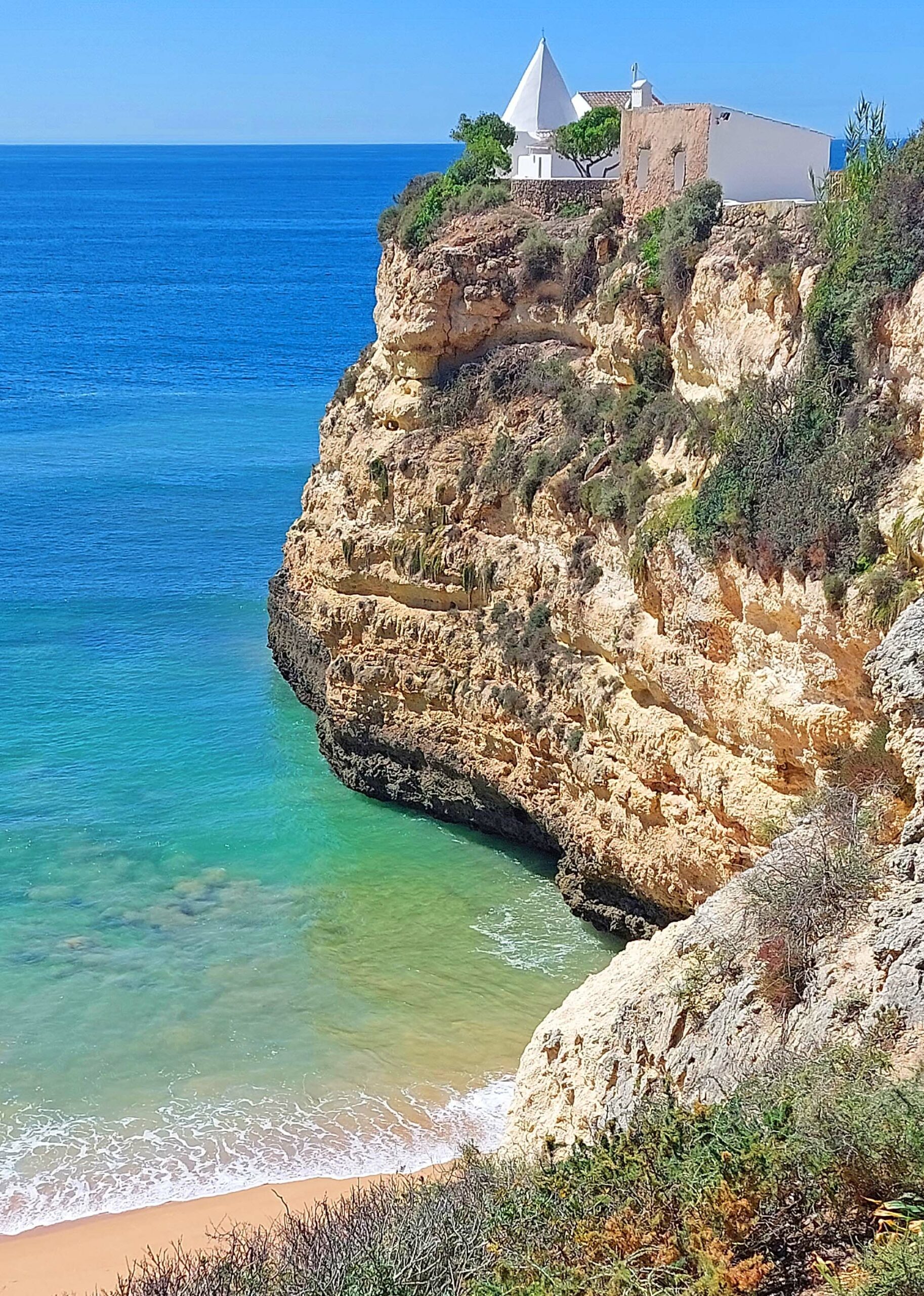 Der Panoramablick von der Klippe über die Bucht von Pera und den weiten Atlantik ist extrem mega, ja sensationell! Zwei Strände liegen rechts und links der Felszunge und sind durch einen vom Meer ausgewaschenen Tunnel miteinander verbunden. Seit einiger Zeit ist dieser gesperrt, da er durch die Verwitterung der Felsküste einsturzgefährdet und zu gefährlich geworden ist. Auch der Aussichtspunkt rechts der Kapelle bietet atemberaubende Ausblicke über die Algarveküste und die beiden Strände Praia da Senhora da Rocha und Praia Nova. Das Wasser ist kristallklar. Es ist tatsächlich ein bisschen was los zwischen den hohen Felstürmen.