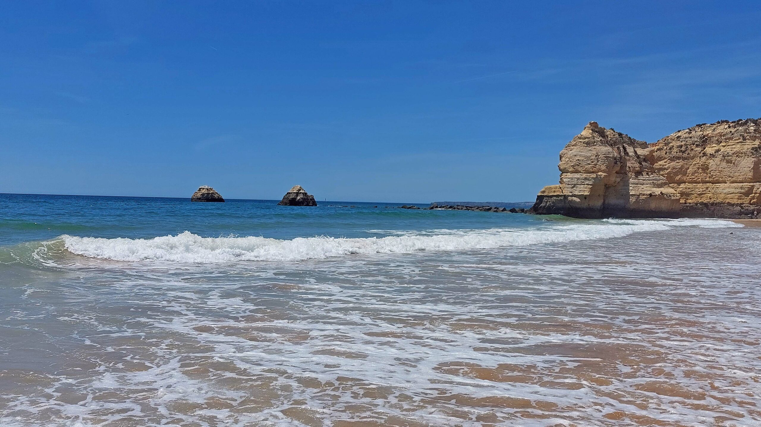 Der Küstenstreifen liegt im gleichnamigen Vorort von Portimao, der zweitgrößten Stadt an der Algarve. Dementsprechend turbulent ist der Verkehr. Ich hangele mich von Kreisverkehr zu Kreisverkehr. Selbst Google wird schwindelig. In Strandnähe gibt es nullkommanull Parkmöglichkeiten. Glücklicherweise erhasche ich oberhalb des exklusiven Yachthafens einen verbotenen Parkplatz für Fiete. Sorgen mache ich mir keine, denn bisher habe ich nicht eine einzige Polizeikontrolle erlebt.