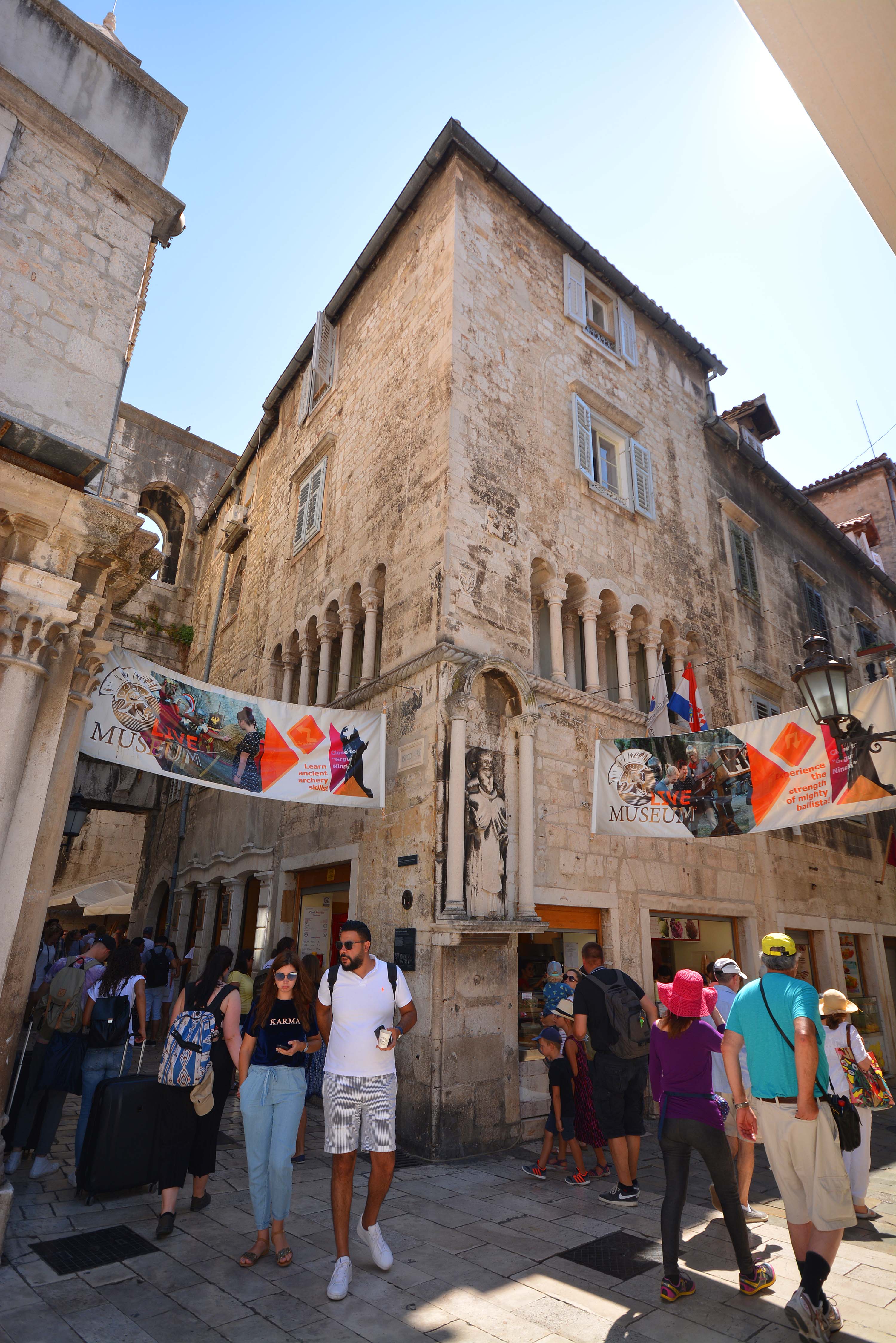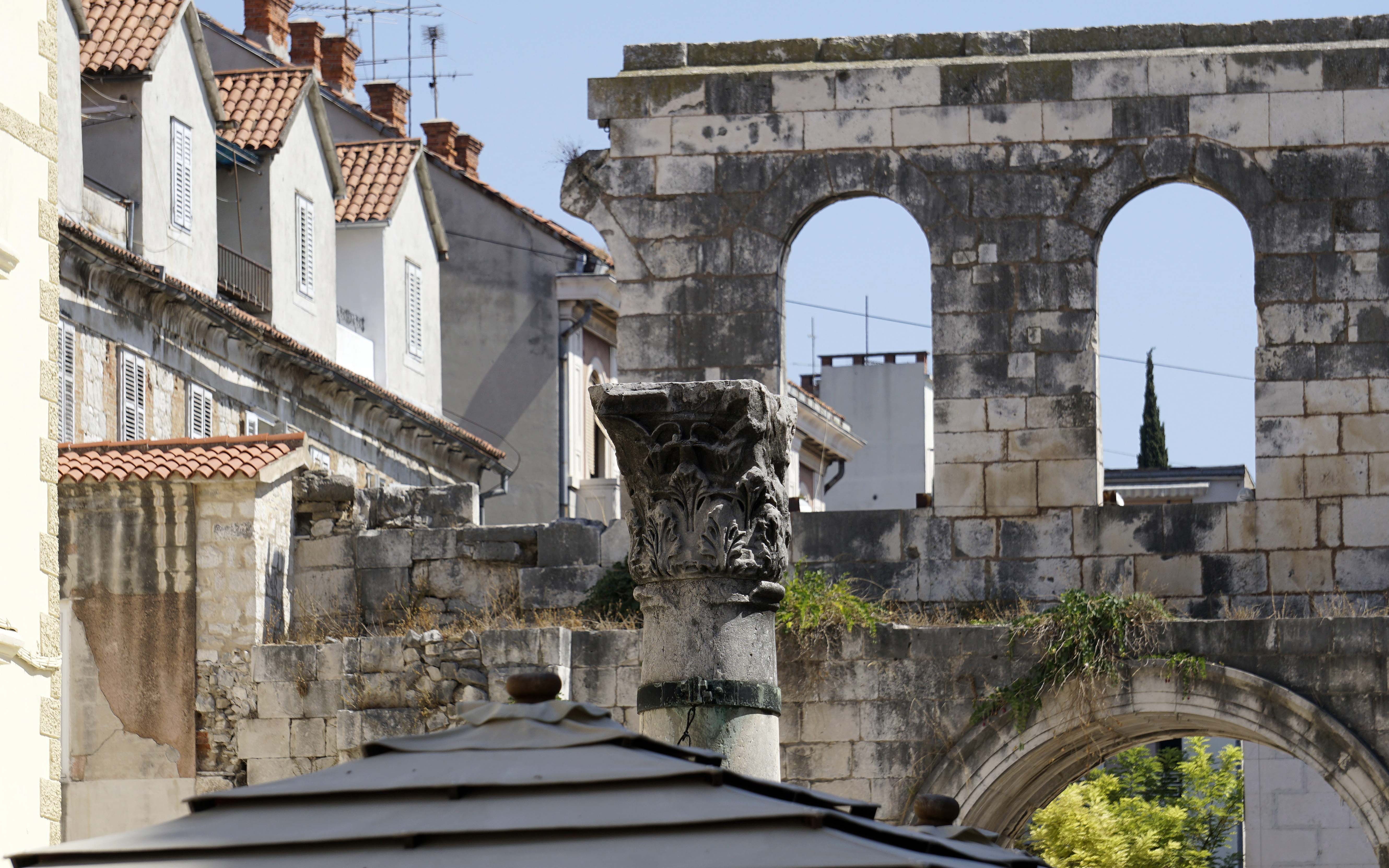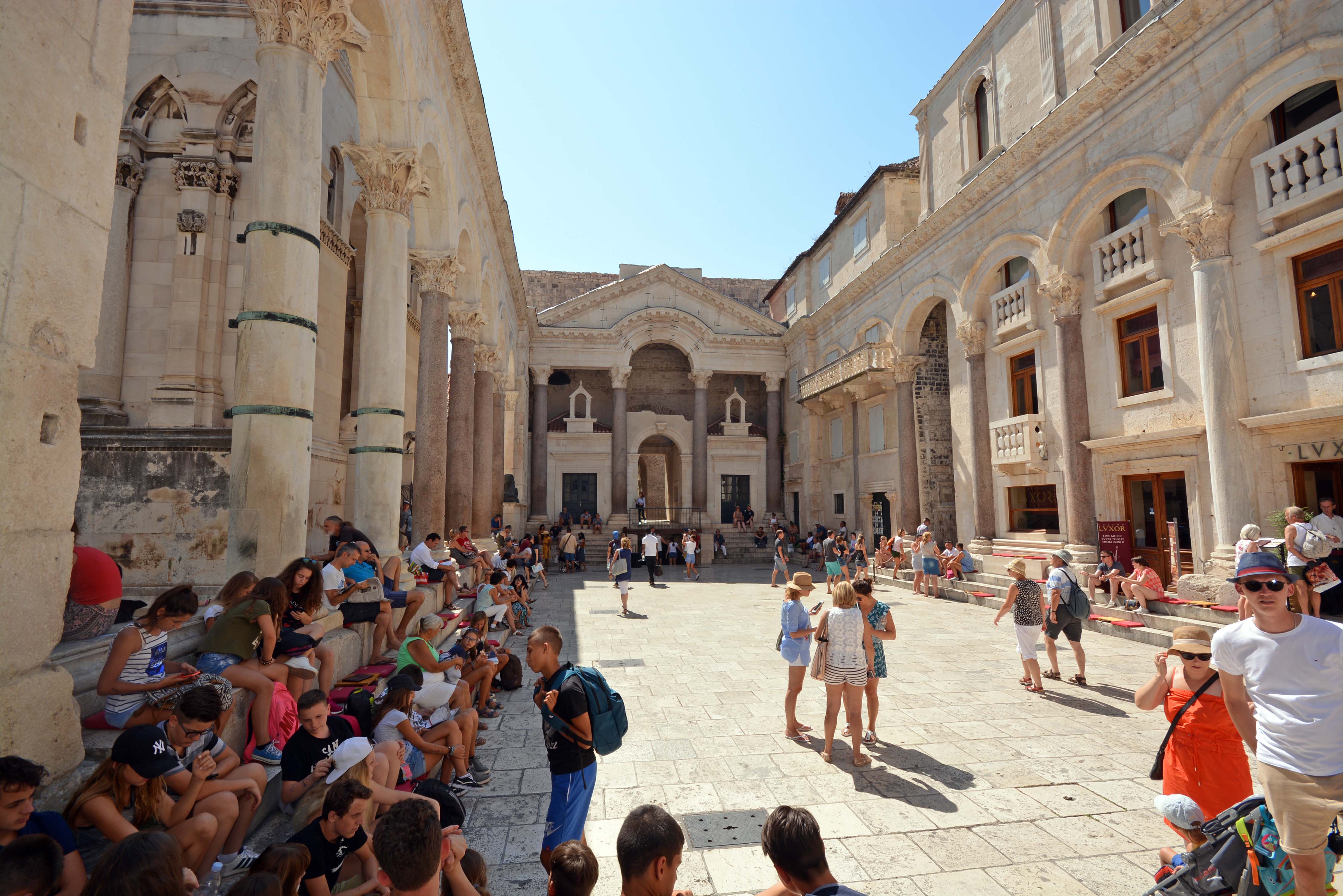 Durch das Seetor (Porta Aenea) gelangen wir in die schummrigen Katakombengewölbe im Untergeschoss des aus dem 3. und 4. Jahrhundert stammenden Kaiserpalastes. Wir kämpfen uns zunächst an zahlreichen Touri-Nepp-Ständen vorbei und kommen über eine Treppe direkt zum beeindruckenden, von korinthischen Säulen eingerahmten Innenhof Peristyl, dem damaligen und heutigen ‚Tummelplatz des Volkes/der Touris‘. An manchen Tagen wird er zur Opernbühne von Verdis ‚Aida‘. Tolle Idee. Zwischen den Toren, Säulen, Überresten alter Mauern und Gebäuden befinden sich Läden, Cafés und gemütliche Gassen. Natürlich geht hier voll der Touri-Punk ab und wir mittendrin. H. und ich gehen auf Fotojagd, was aufgrund der Enge, der vielen Menschen und der immer falsch stehenden Sonne eine große Herausforderung ist.