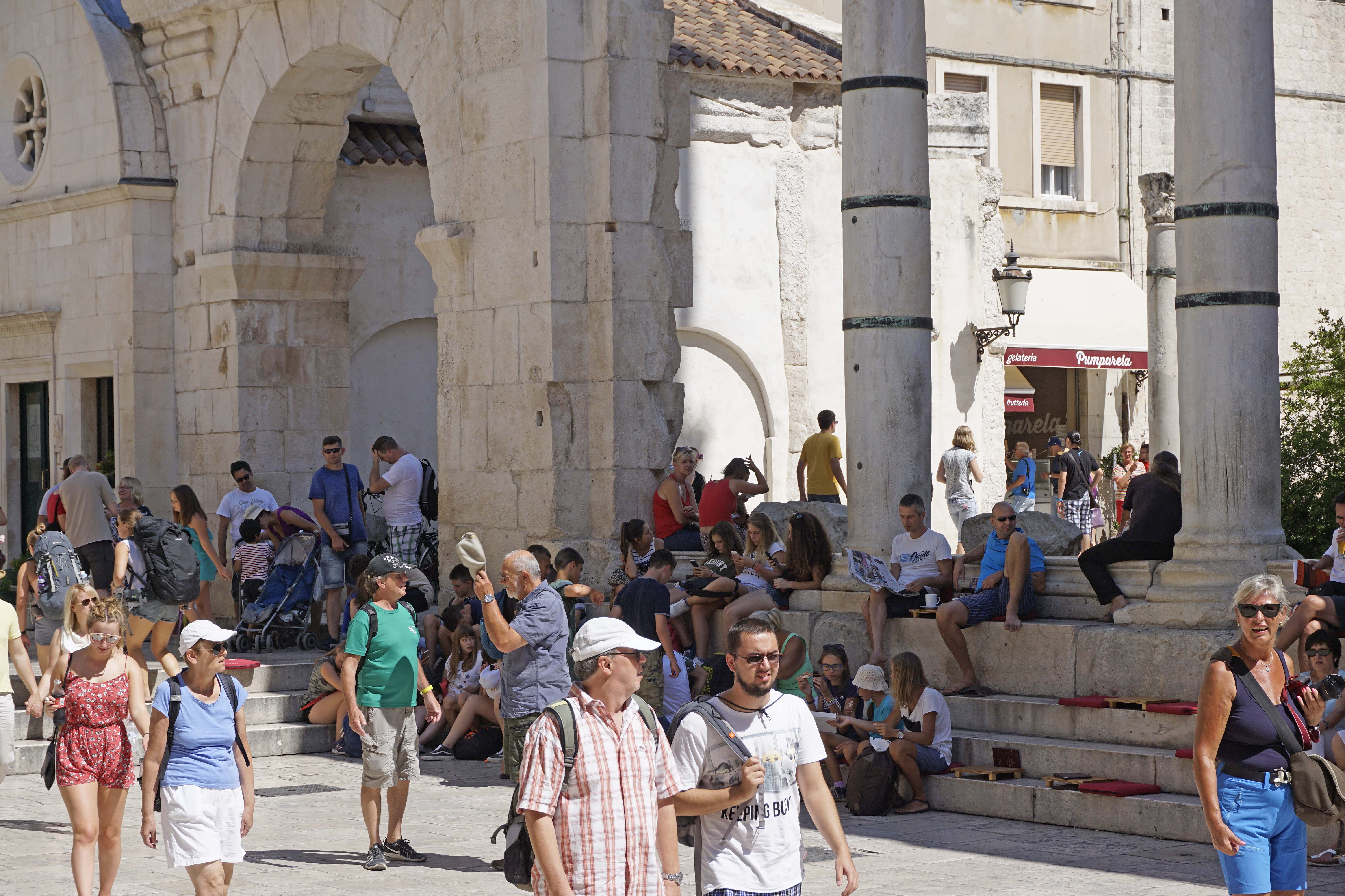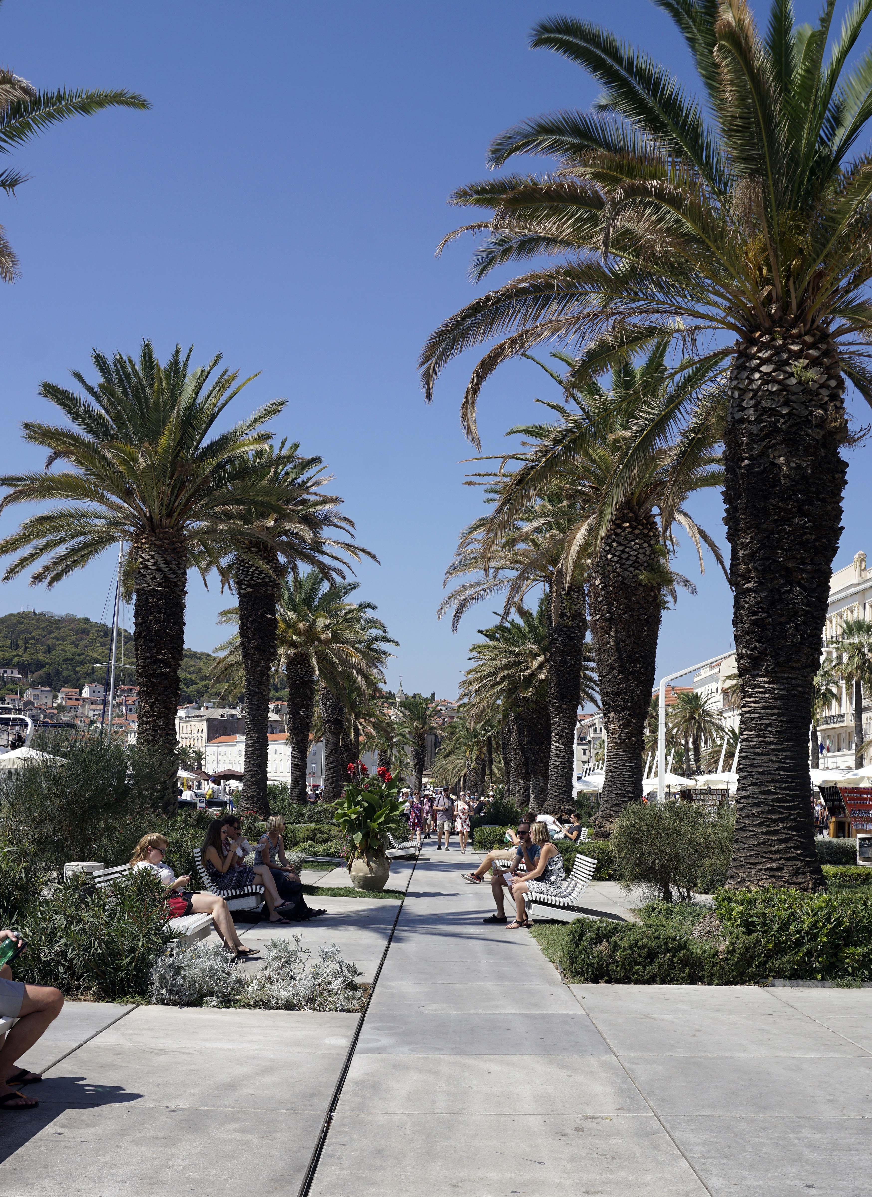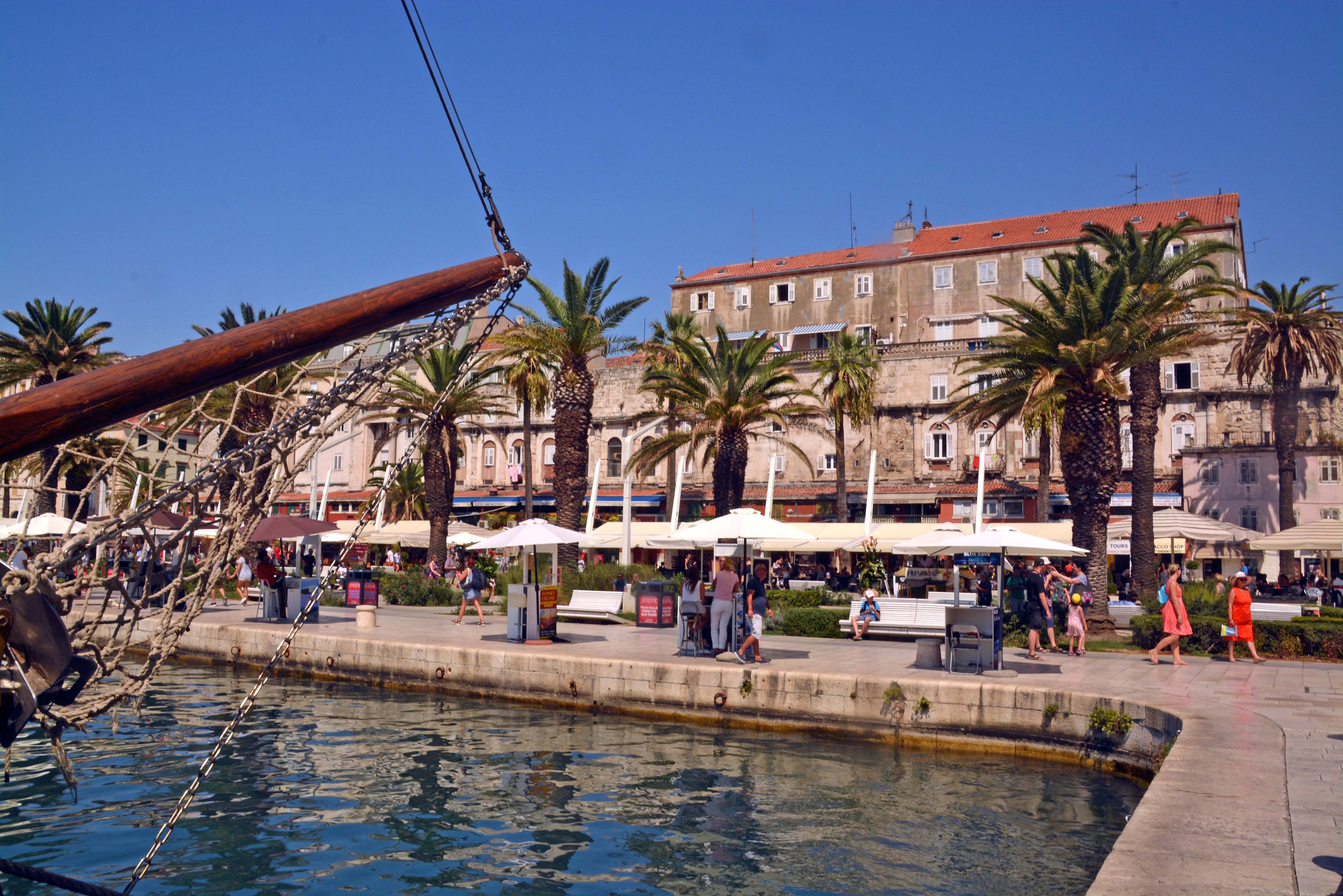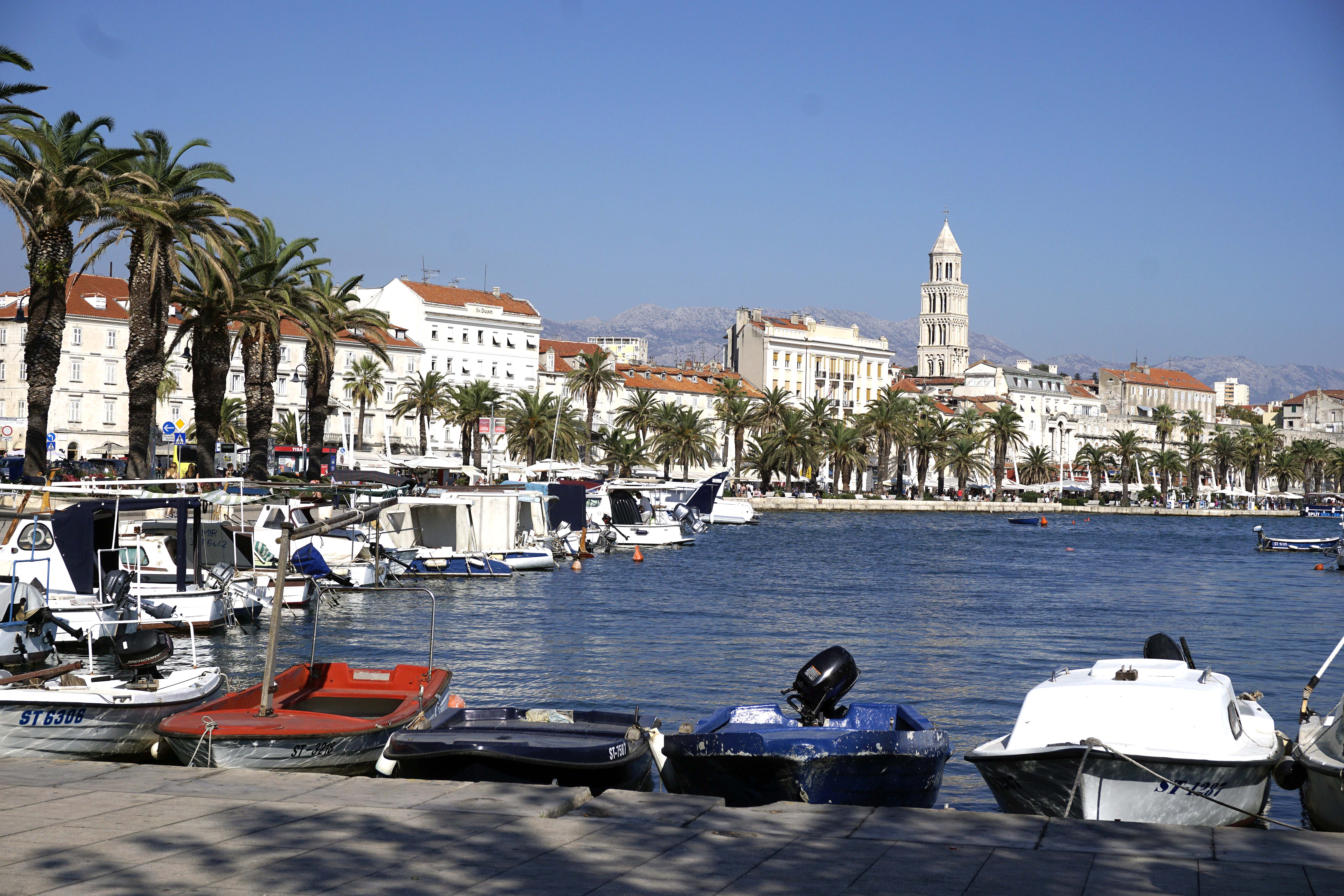 Nach kurzer Orientierung befinden wir uns mitten im Marktgeschehen. Wir laufen über den bunten Markt und landen am Fährhafen. Hier an der Hafenbucht beginnt die Riva, eine palmengesäumte Uferpromenade und Flaniermeile und eines der bekanntesten Wahrzeichen der Stadt. Von hier aus betrachten wir die ersten 1700 Jahre alten Mauerreste des römischen Diokletian-Palastes, DEM Hotspot der Hafenstadt, wo sich die meisten Touris tummeln und aus dem sich das heutige Split entwickelt hat.