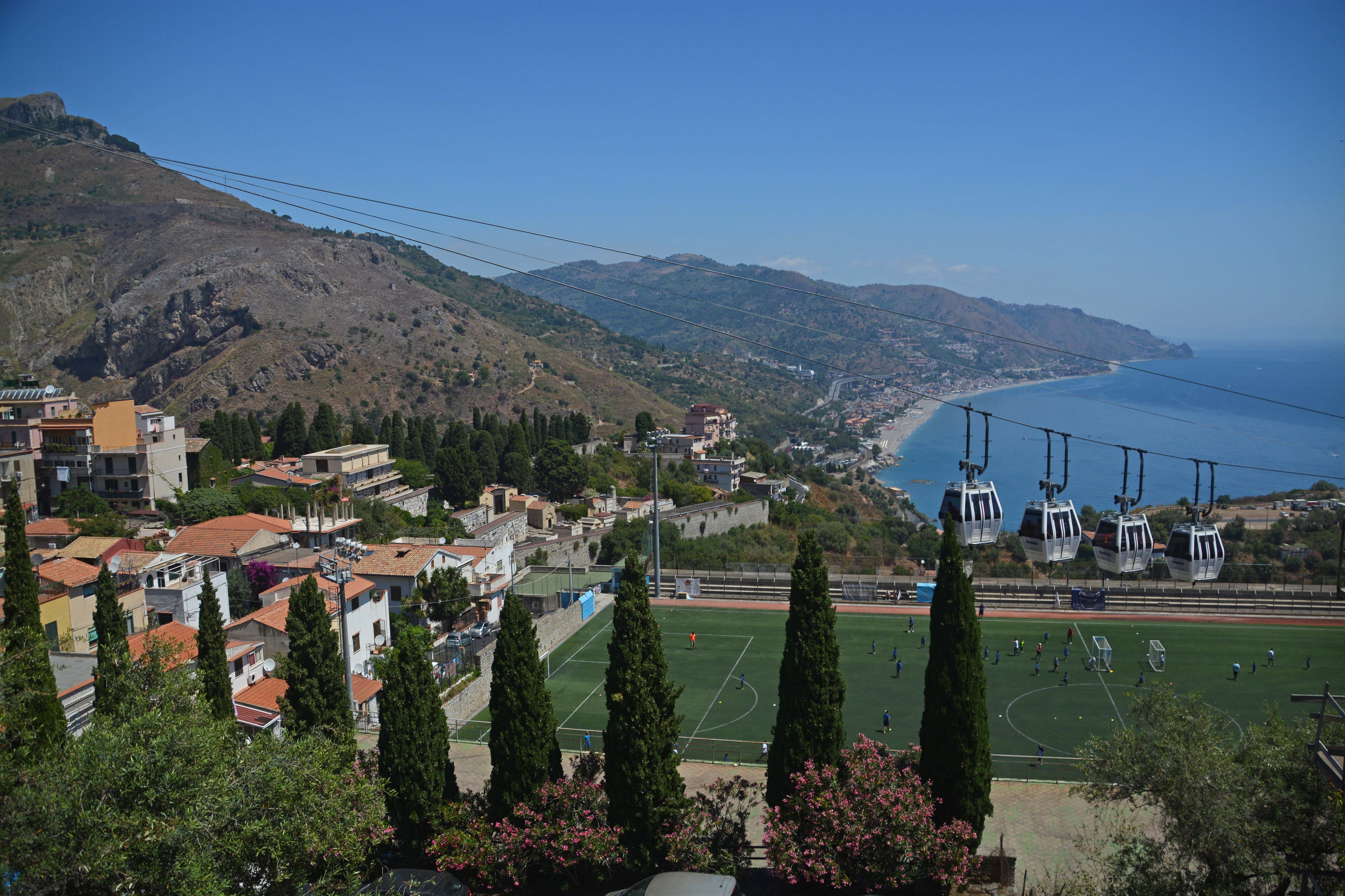 Wir wenden mit viel hin- und hergekurbele und finden plötzlich wie aus dem Nichts einen weiteren Parkplatz. Ganz großes ‚Parcheggio-Kino! Hier fahren wir rein und parken für 4€ die Stunde – gegen Vorkasse und ohne Rückgeld natürlich!!! Selbstverständlich müssen wir erst diskutieren, Sizilianer erwarten Respekt und wollen das Heft in der Hand behalten. Wir sammeln die entscheidenden ‚Ich-darf-hier-parken-Punkte‘, weil der Schwager des Parkwächters früher in Frankfurt gearbeitet hat. Glück muss man haben. Von hier sind es steile 600 Meter bis zur Altstadt. Die Gondeln der Seilbahn von Mazzaro rauschen voll mit Touris an uns vorbei.
