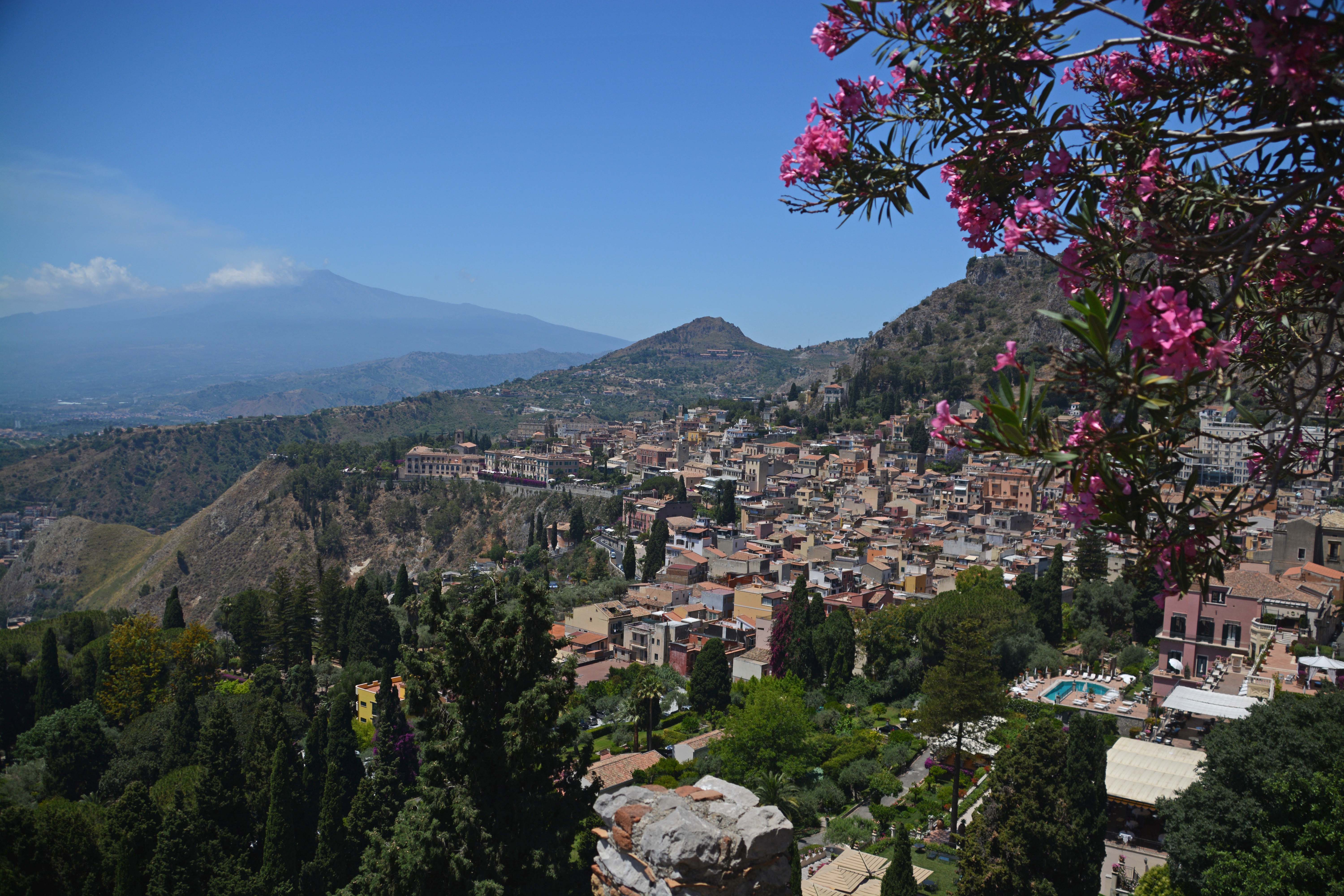 Mit diesen grandiosen Eindrücken stürzen wir uns erneut ins Touri-Gewimmel und flanieren die 1 Km lange Einkaufsmeile ‚Corso Umberto‘ entlang, lassen uns ein kunstvoll aufgetürmtes Eis schmecken – Wahnsinn, wie das zelebriert wird – und sind fasziniert von den Blicken in die schmalen Seitengässchen und die Palazzi aus dem typischen grauen Taormina-Stein. Auf der großen ‚Piazza IX. Aprile‘, dem Wohnzimmer Taorminas, gibt es erneut klasse Ausblicke ins Tal. Bewacht wird der Platz von der kleinen Chiesa di San Giuseppe aus dem 17. Jahrhundert. Direkt neben dem Uhrenturm wartet das zweite Stadttor, ‚Porta Catania‘ auf der Touristenstrom, der am Duomo San Nicolò di Bari aus dem 15. Jahrhundert endet. Davor steht ein Brunnen ‚ Fontana di Piazza Duomo‘, dessen Figur das Wahrzeichen Taormina ist. Kein Wunder, das im 19. Jahrhundert Kaiserin Sissi und Wilhelm II gerne hierher kamen.