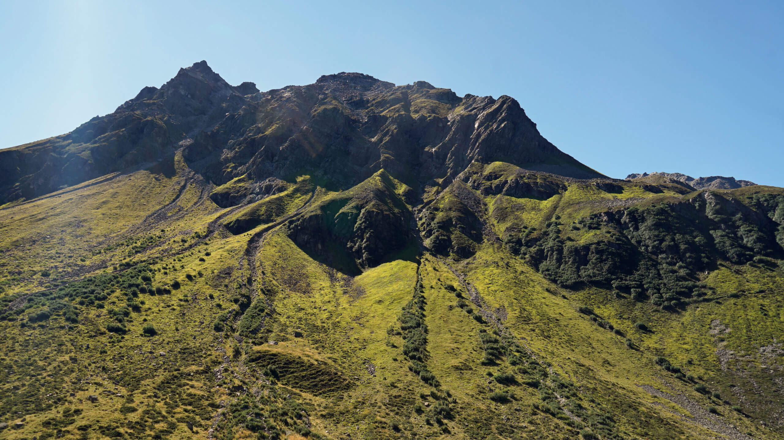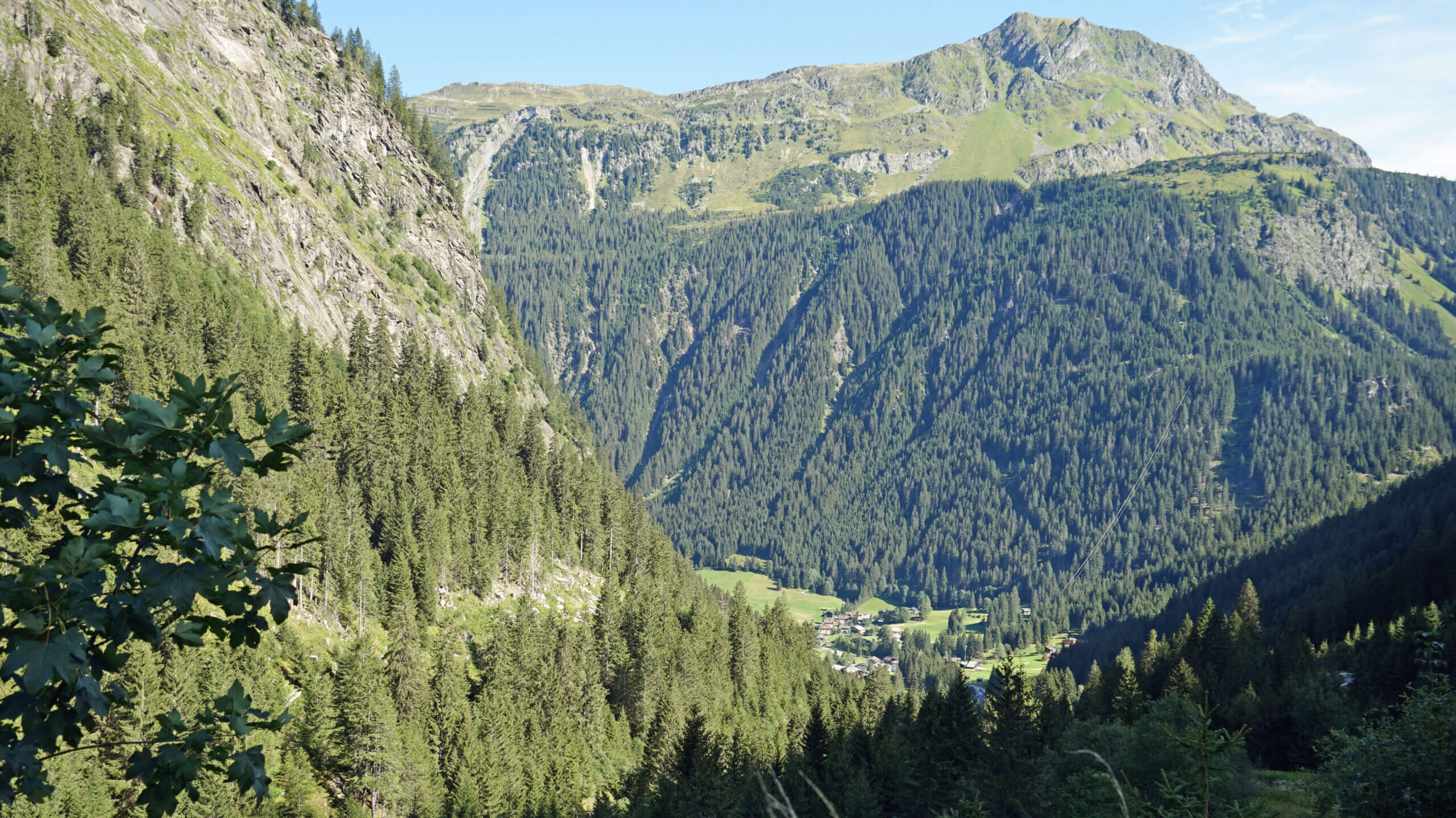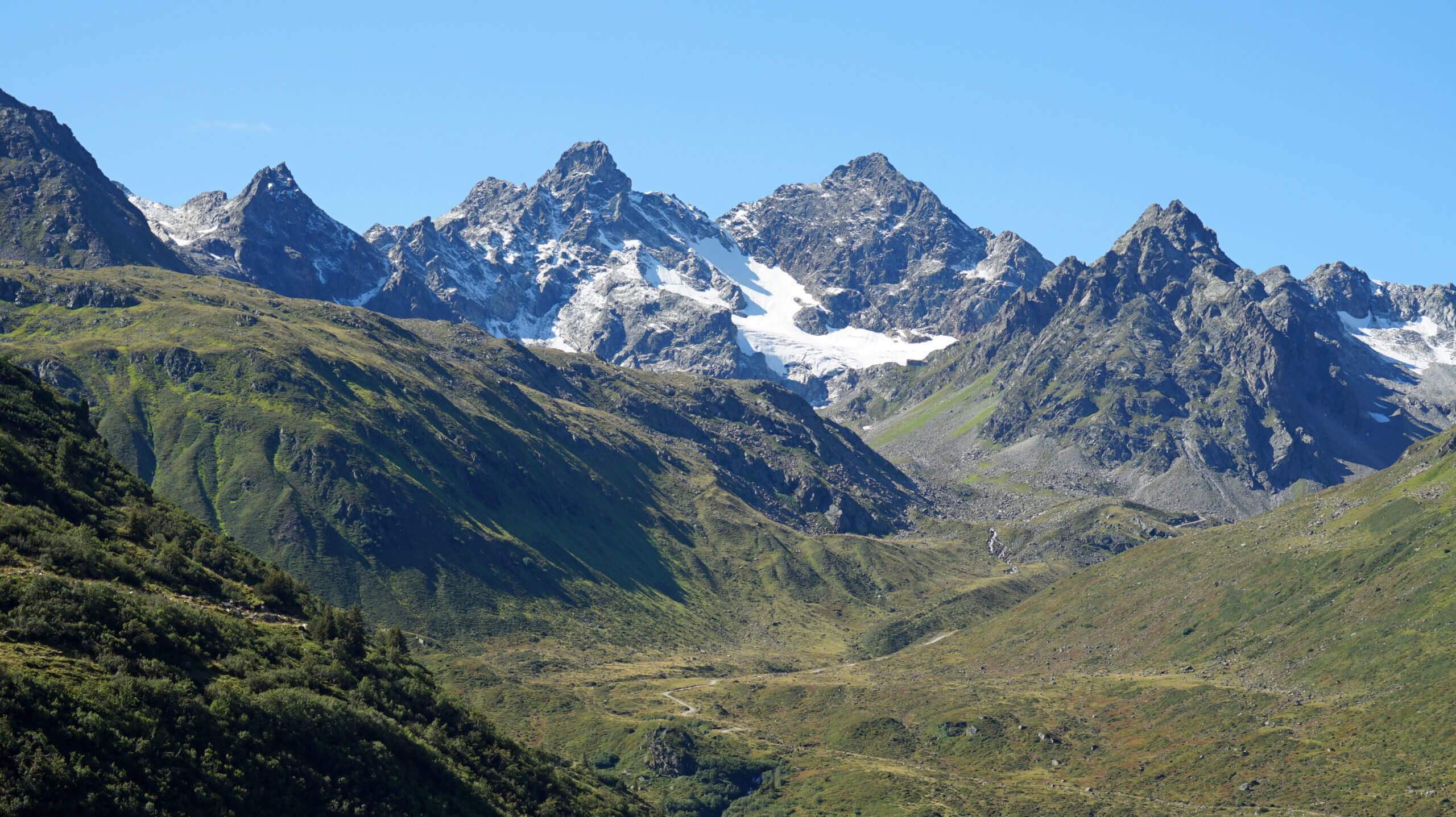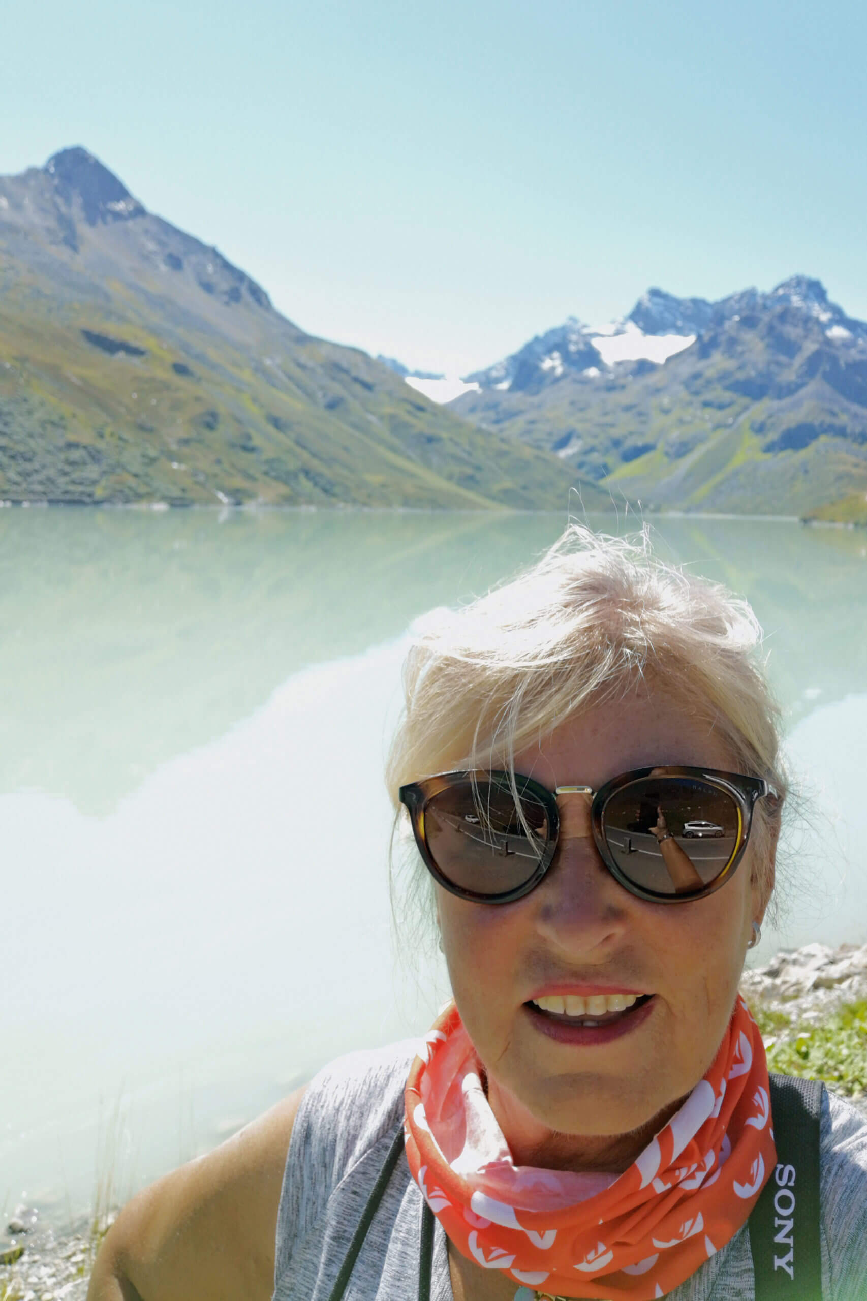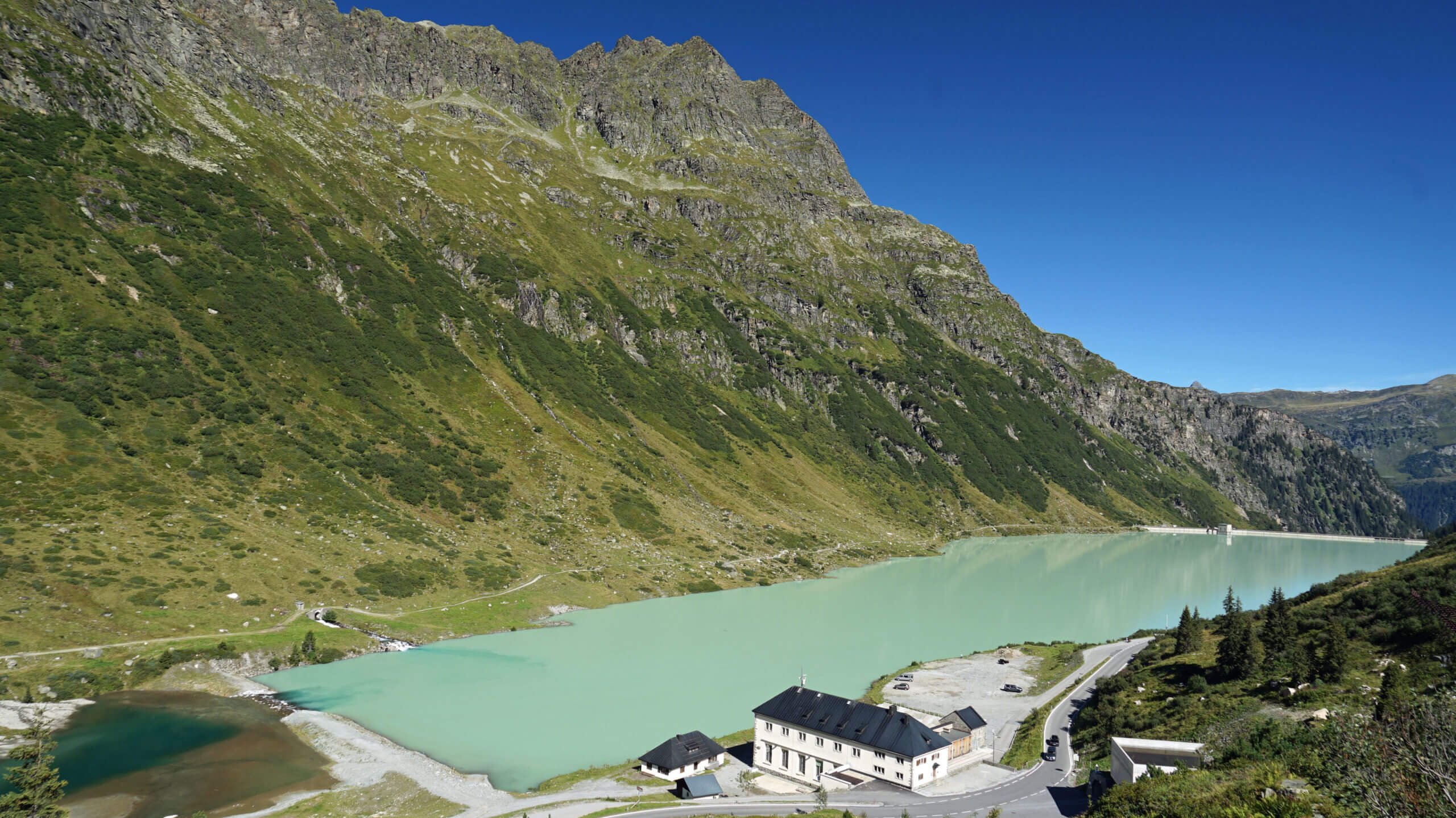 Hier oben eröffnen sich mir wieder ganz neue Blickwinkel. Natürlich halte ich Ausschau auf den 3.312m hohen Großen Piz Buin, Vorarlbergs höchstem Berg. Aber von hier kann ich ihn noch nicht sehen. Dafür entdecke ich auf meinem Rundgang auf dem Pass zahlreiche Kletterer an der Außenstaumauer des Sees, die Barbara-Kapelle, die der beim Stauseebau verunglückten Arbeiter gedenkt und ein satt grünes Tal mit einigen kuscheligen Hütten. Natürlich warten hier auch Hotels und Restaurants auf die zahlreichen Besucher.
