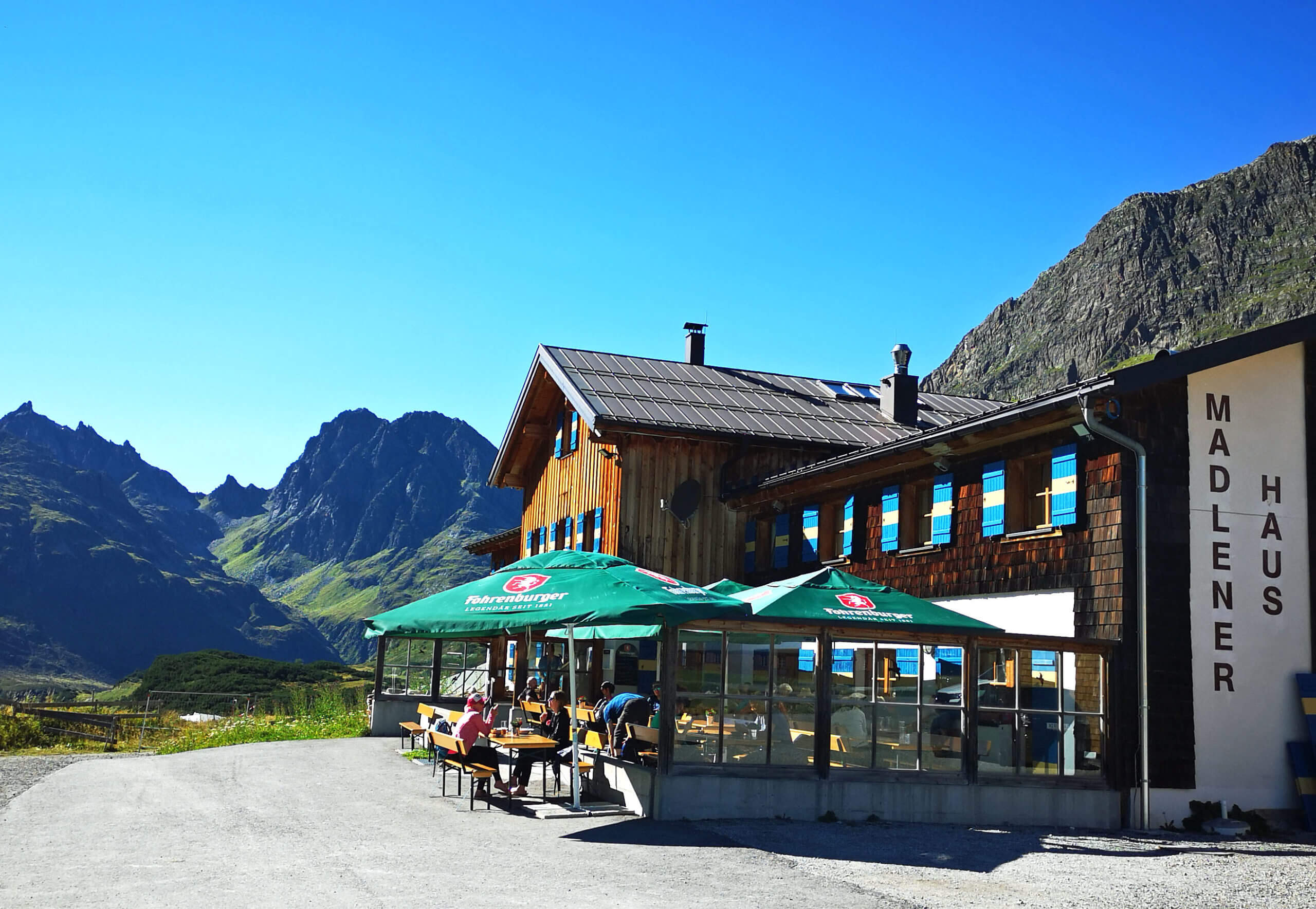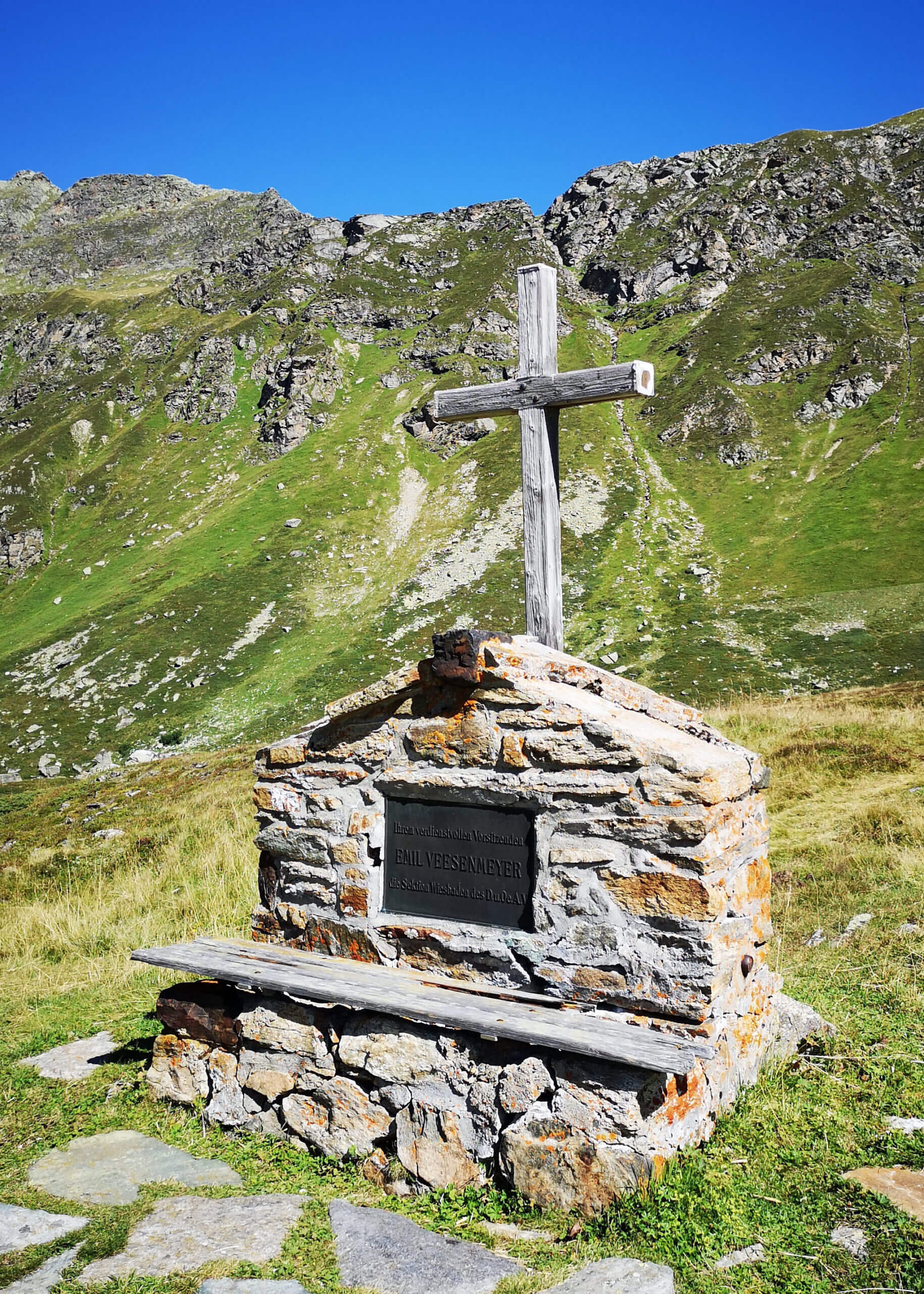 Fiete steht unbeeindruckt noch an seinem Platz. Ich fahre ein paar Meter hinunter und kehre in die Berghütte Madlenerhaus (1.986m) am Fuße der Staumauer ein. Hier ist es gemütlich und weit entfernt von Touri-Gedränge. Verspeise eine Jause und schlabbere ein großes kaltes Radler. Es ist nach wie vor wolkenlos und sehr warm. Vielleicht sitze ich gerade auf dem Platz, auf dem Ernest Hemingway 1925 oder 1926 saß, als er hier zu Gast war!!! Seine Begeisterung über dieses Gebiet und die Hütte verewigte er in seinem Roman „Schnee auf dem Kilimandscharo“.