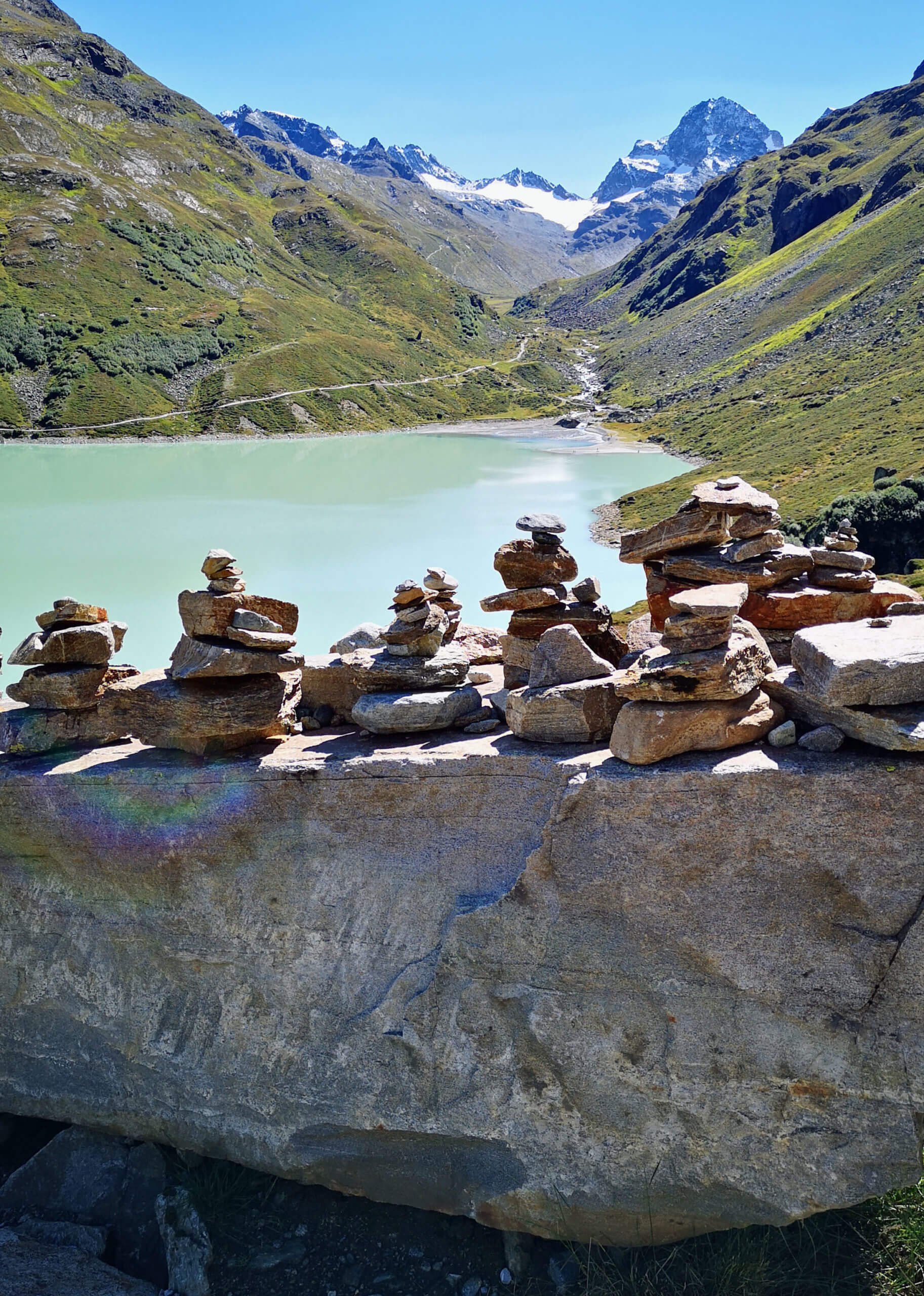Dann starte ich entgegen des Uhrzeigersinns meinen Rundweg um den Stausee, eine einfache aber sehr eindrückliche Wanderung. Der langgezogene See vermittelt Fjordstimmung. Und ich bin gespannt auf die ersten Blicke zum großen ‚Piz Buin‘. Ich laufe auf einem recht breiten Schotterweg und höre es ständig irgendwo plätschern, denn überall fließen kleine und große silberfarben glänzende Wasserläufe aus dem Geröll.
