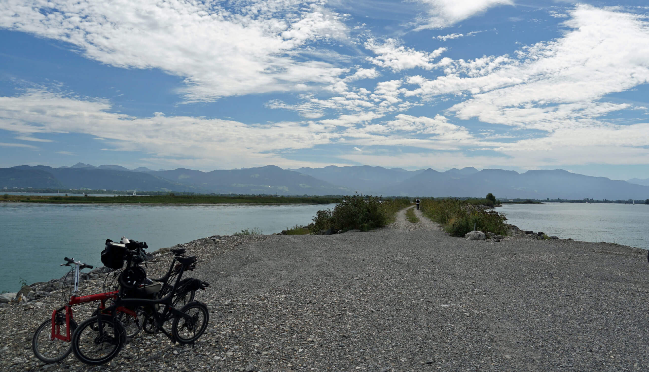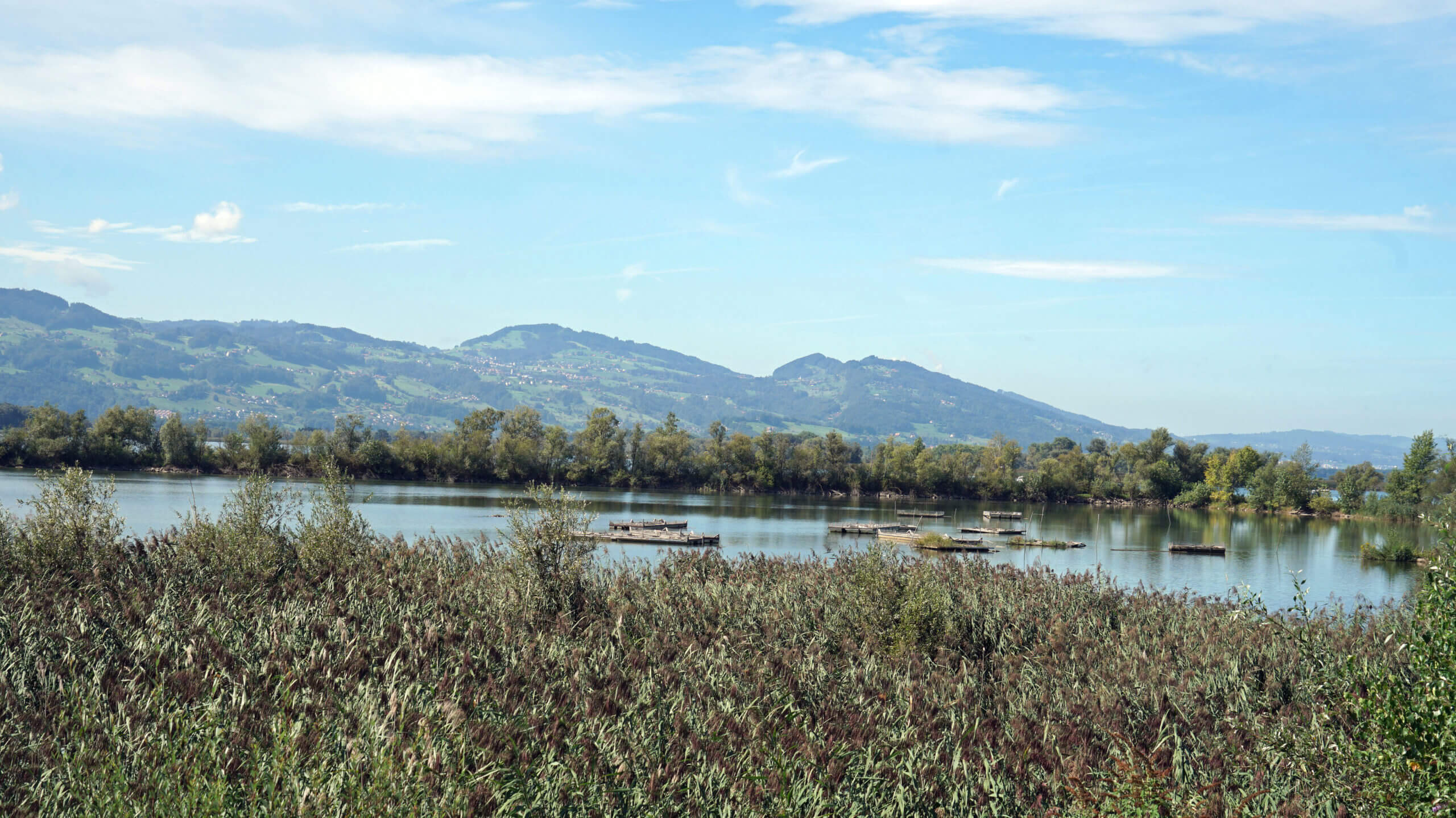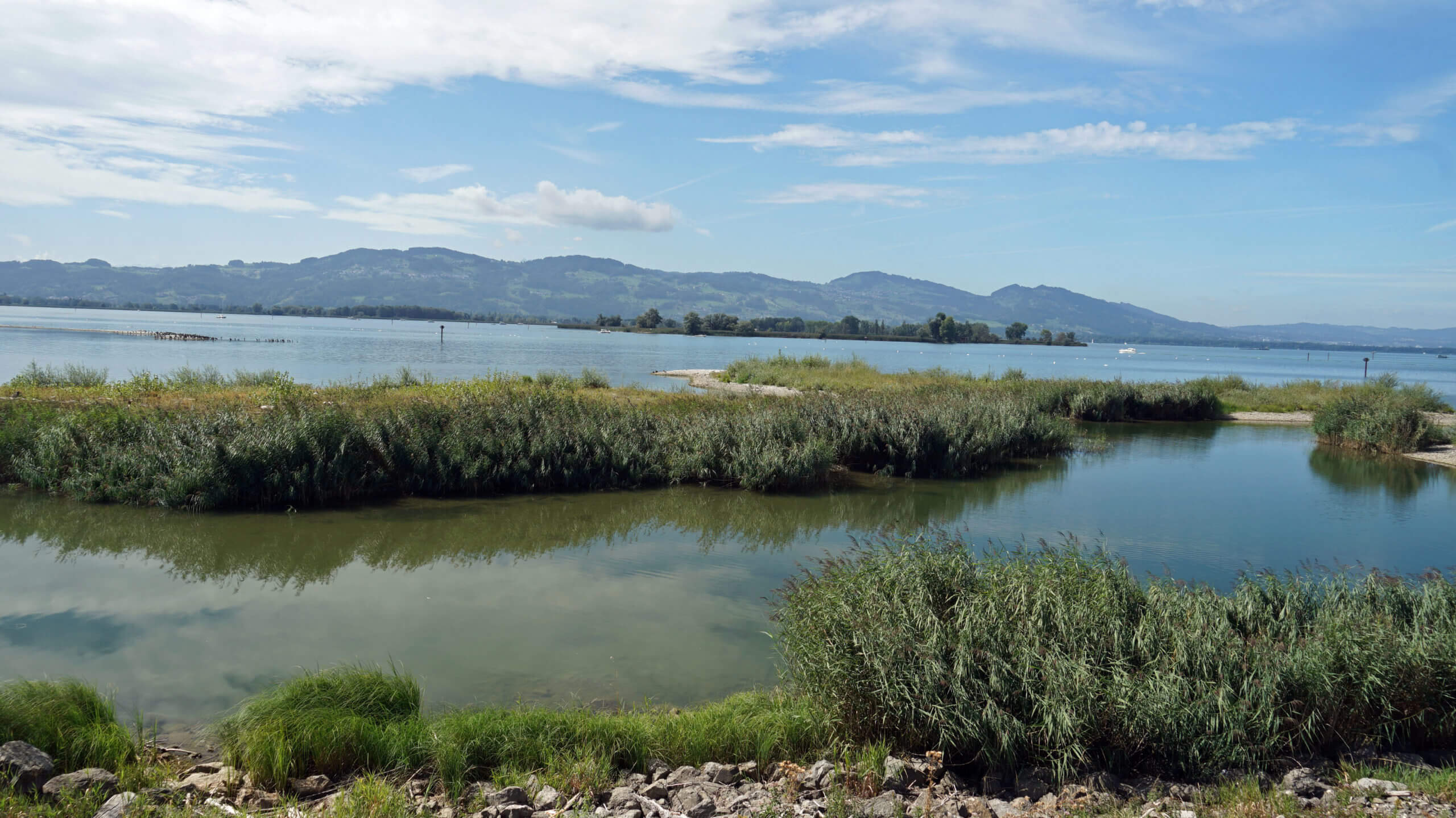 Rechts fließt der Alpenrhein, links liegt ies Fußacher Bucht und eine fast unberührte Natur. Ich laufe auf geschottertem Weg und genieße die ursprüngliche Landschaft mit ihren zahlreichen Schilfarten und Wiesenblumen. Ich höre das Abladen der Rheinsteine aus dem nahen Schwimmbagger, welche die Verlandung verhindern, das surren eines Zeppelins über mir, aber vor allem Vogelgezwitscher. Mir begegnen Vogelfreunde mit großen Ferngläsern und Kameras mit schweren Objektiven, die auf den Schultern getragen werden müssen. Am Ende des Polderdamms rasten auf riesigen Steinen die Wanderer und Radler und blicken auf den weiten Bodensee hinaus. Es hat etwas Mystisches und ich sitze lange, um dieses Gefühl auszukosten.