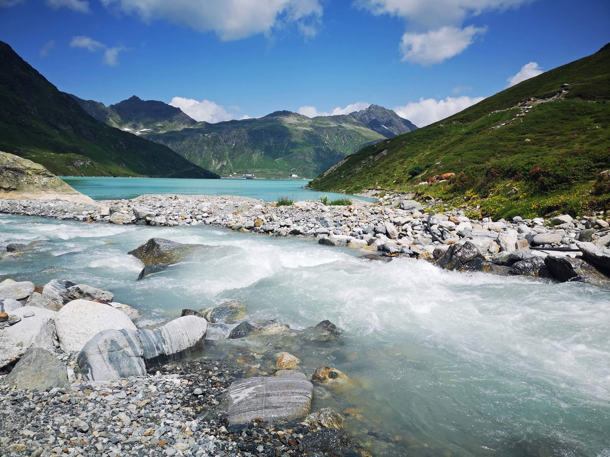 Ich beobachte die Kühe auf der Almweide und genieße den Blick auf die Barbarakapelle, die sich nahtlos in das Ambiente einfügt. Sie wurde zum Gedenken an die verunglückten Kraftwerksmitarbeiter errichtet. Dann starte ich den Rundweg um den See. Und plötzlich kriecht direkt vor meinen Wanderschuhen eine kleine Kreuzotter über den Weg. Leider gab es nicht den Hauch eine Chance auf ein Foto. Der unbeschreibliche Regen hat alles noch grüner, noch saftiger, gemacht und zahlreiche Bächlein plätschern aus allen Ecken. Es ist traumhaft.