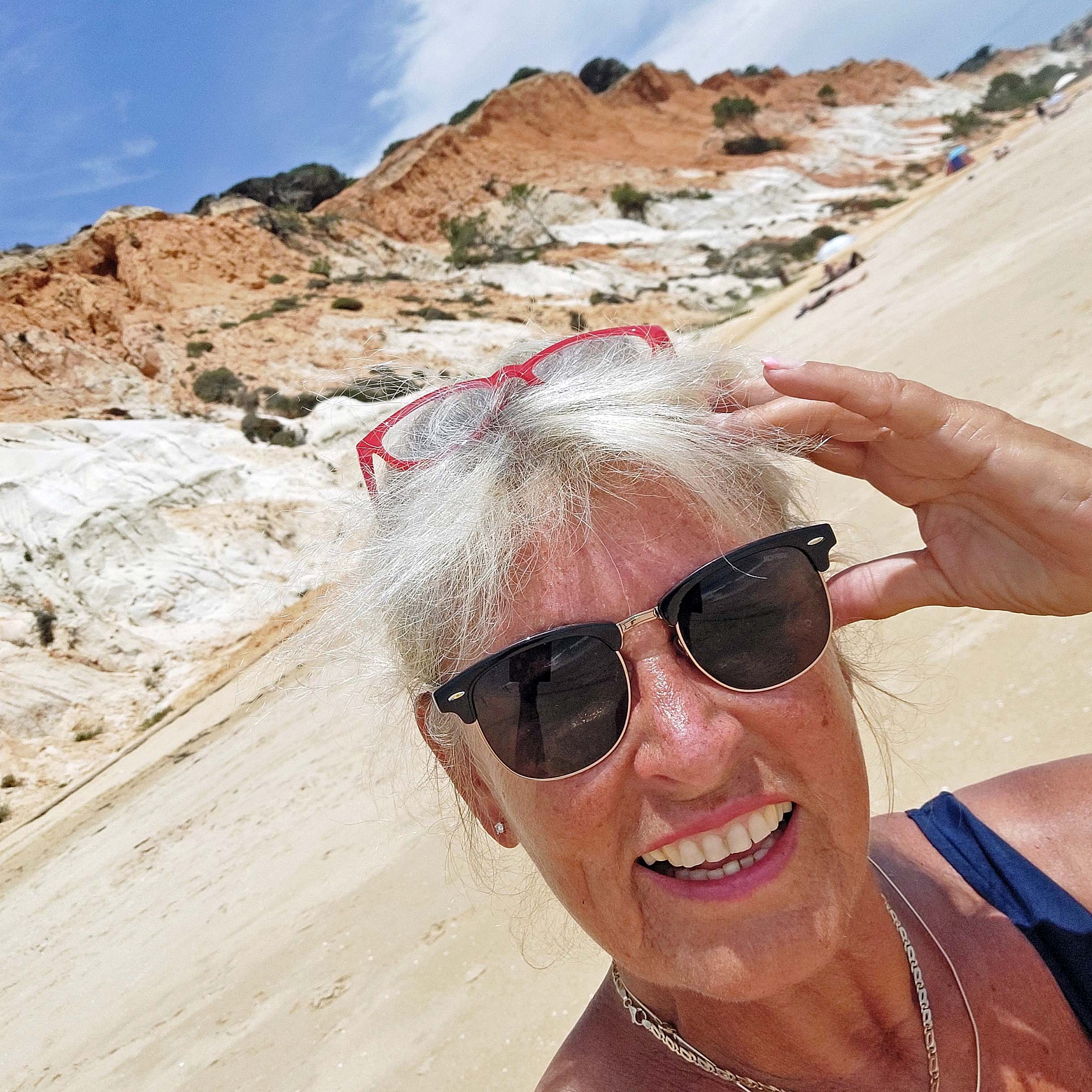 Zuerst genieße ich den atemberaubenden Blick hoch oben von den Klippen und besonders den unglaublichen Kontrast zwischen Felsen, Strand und Meer. Dann steige ich über eine lange Holztreppe zum Strand hinunter. Nach dem Bad im Meer lasse ich Wasser und Sand durch meine Zehenspitzen laufen und komme aus dem Staunen kaum heraus.