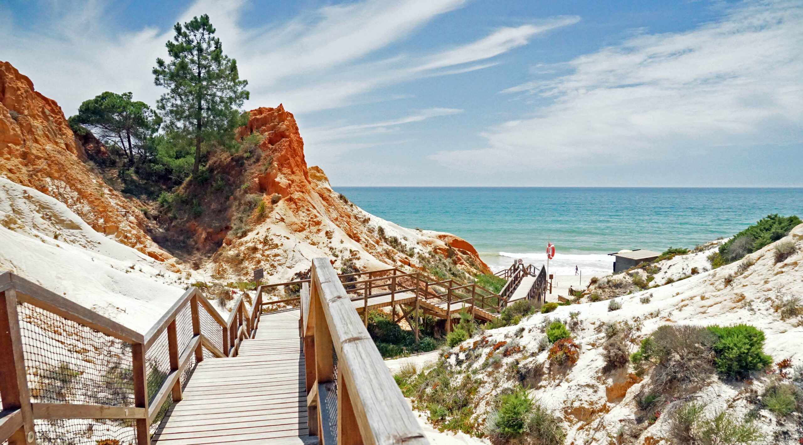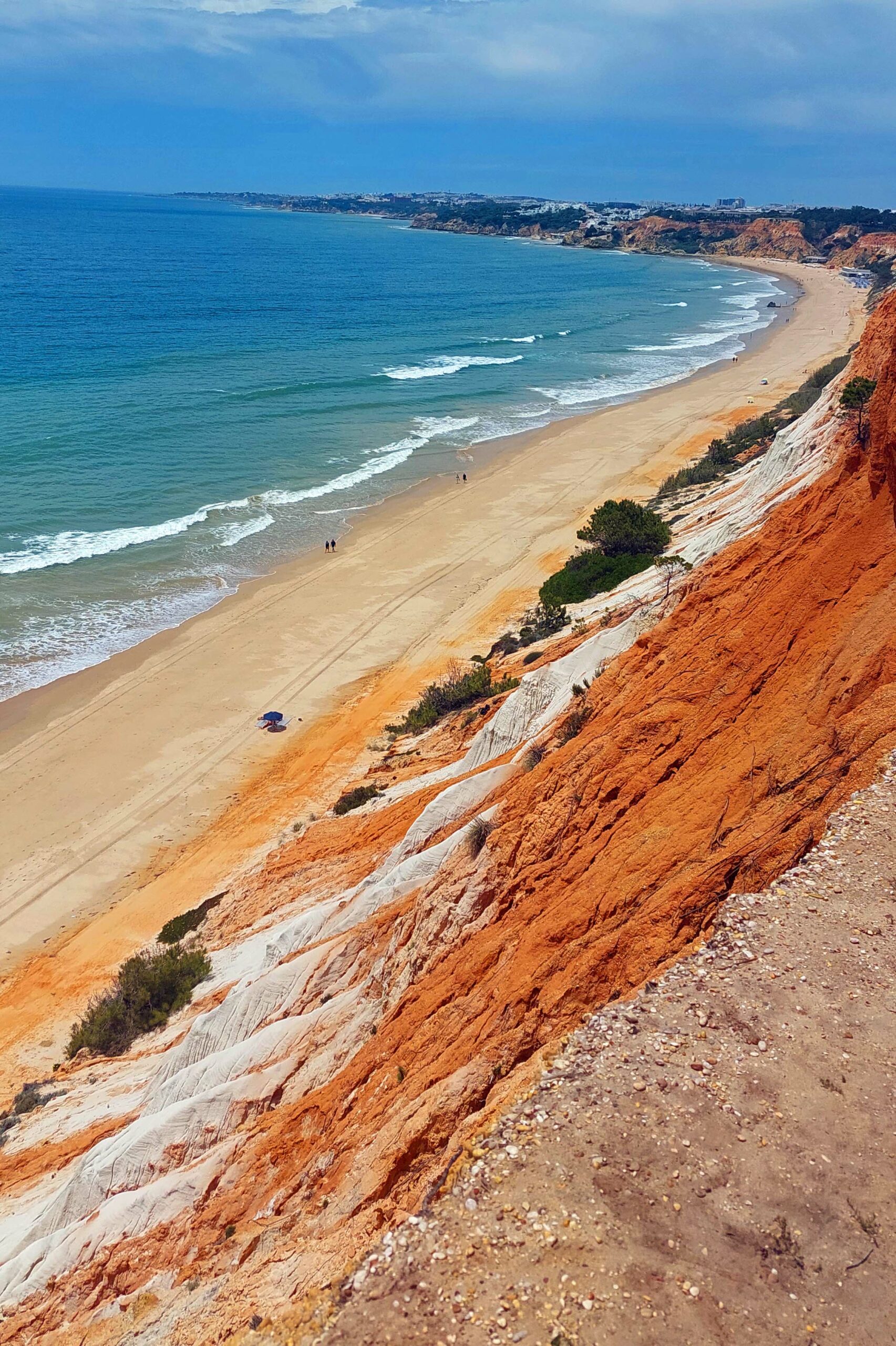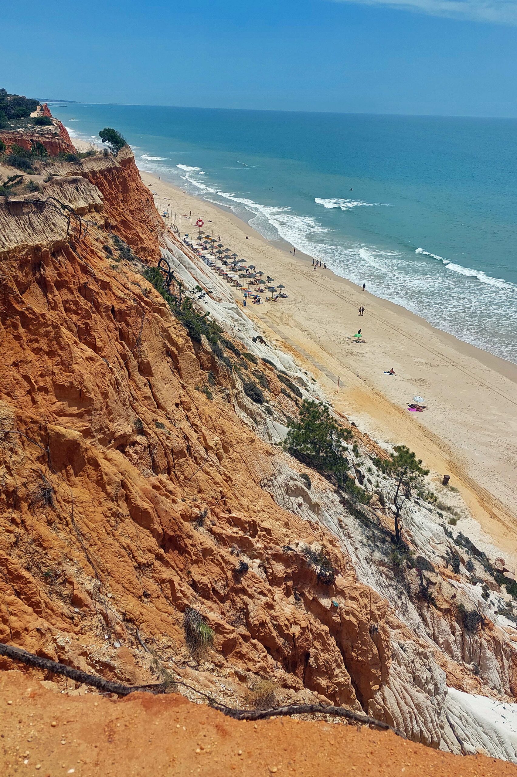 Wow! Was für eine atemberaubende Kulisse und ein bizarres Farbenspiel! Der Praia da Falésia ist sechs km lang, mit feinstem Sand, glasklarem Wasser und ist eingerahmt von teils 20 Meter hohen rot-, ockerfarbenen- und grauschattierten Sandsteinfelsen, die mit Pinien bewachsenen sind. Die fragilen Lehmfelsen haben hier den Bau von Mega-Hotels verhindert.