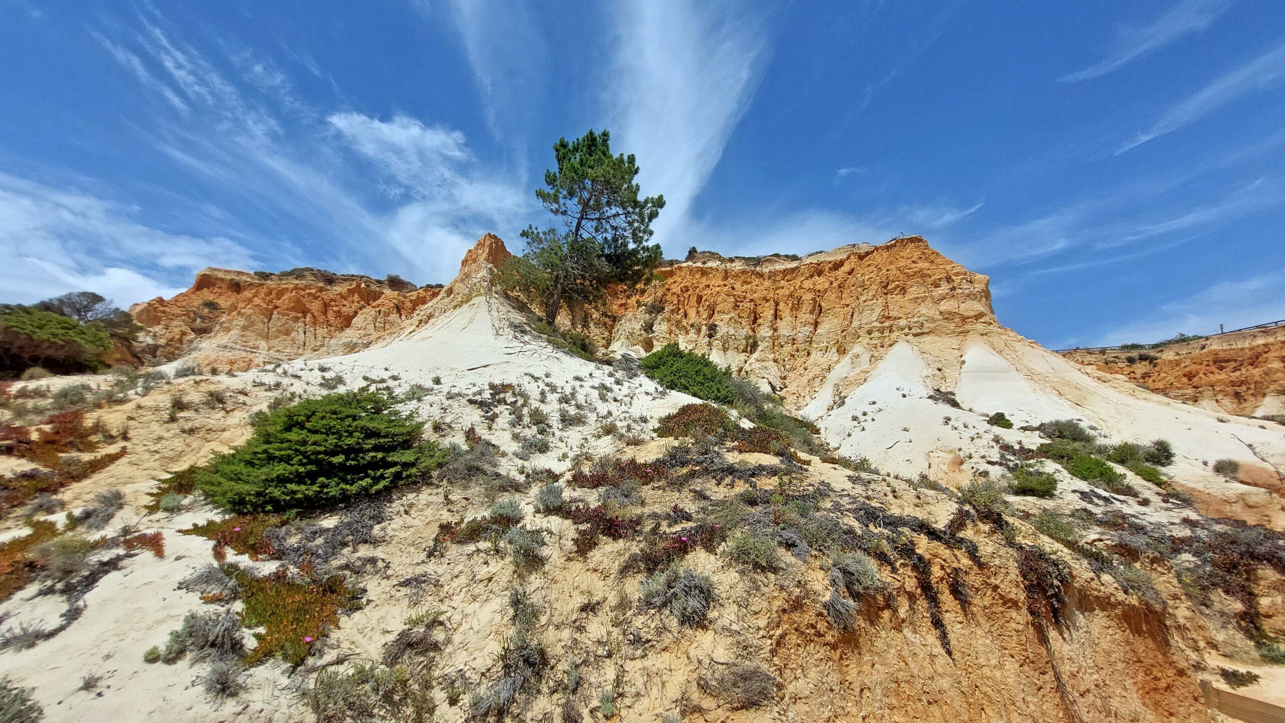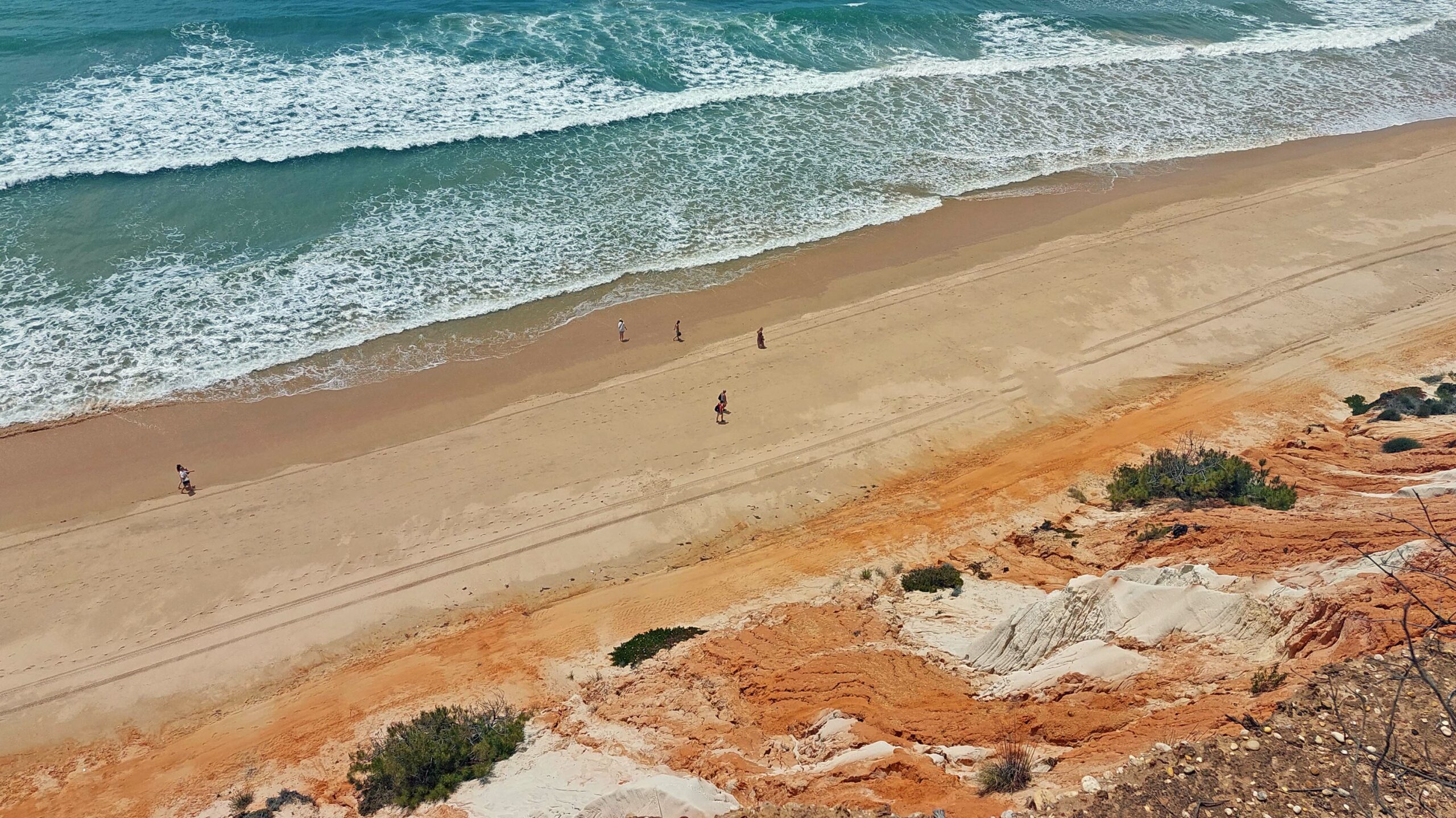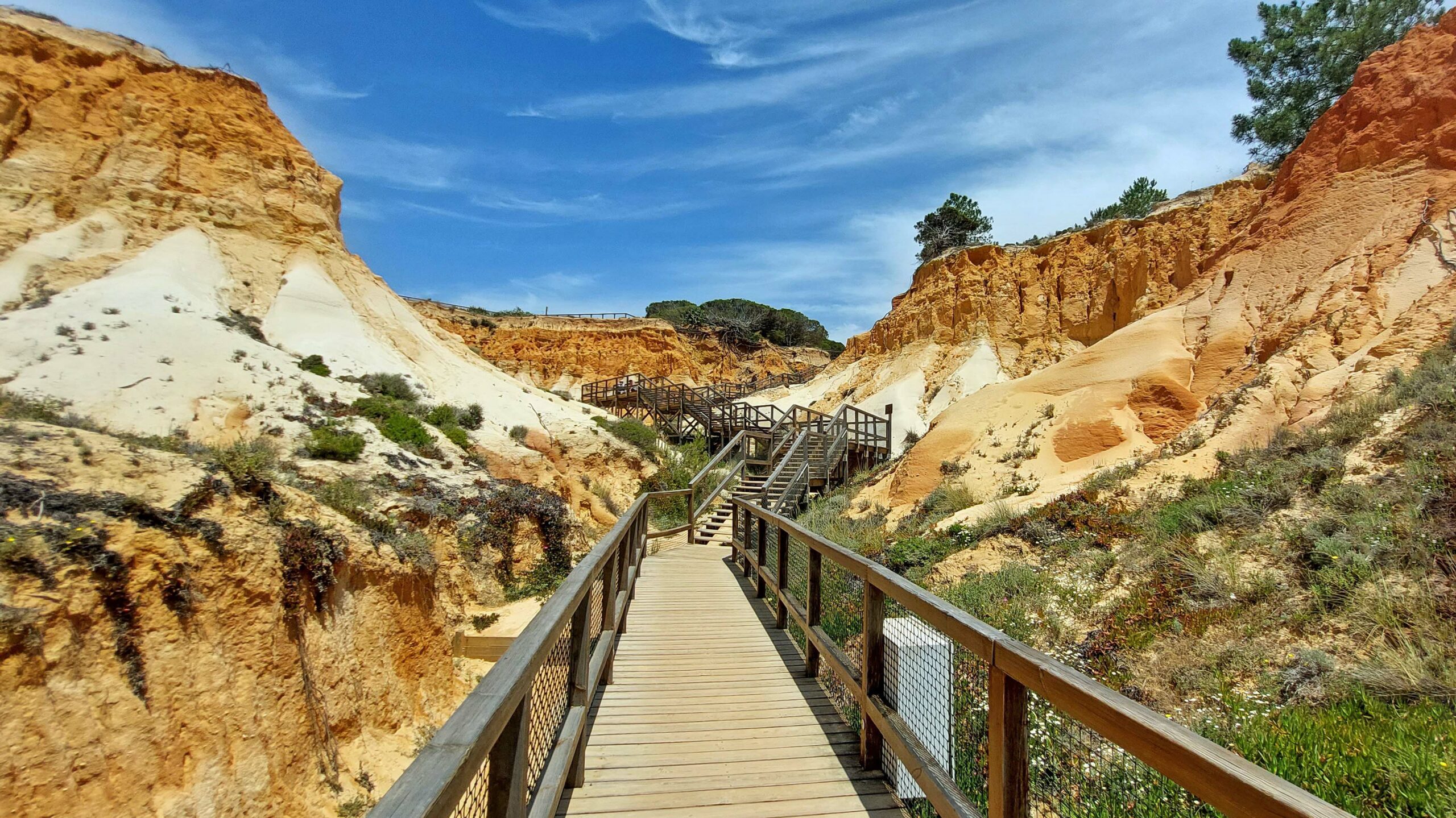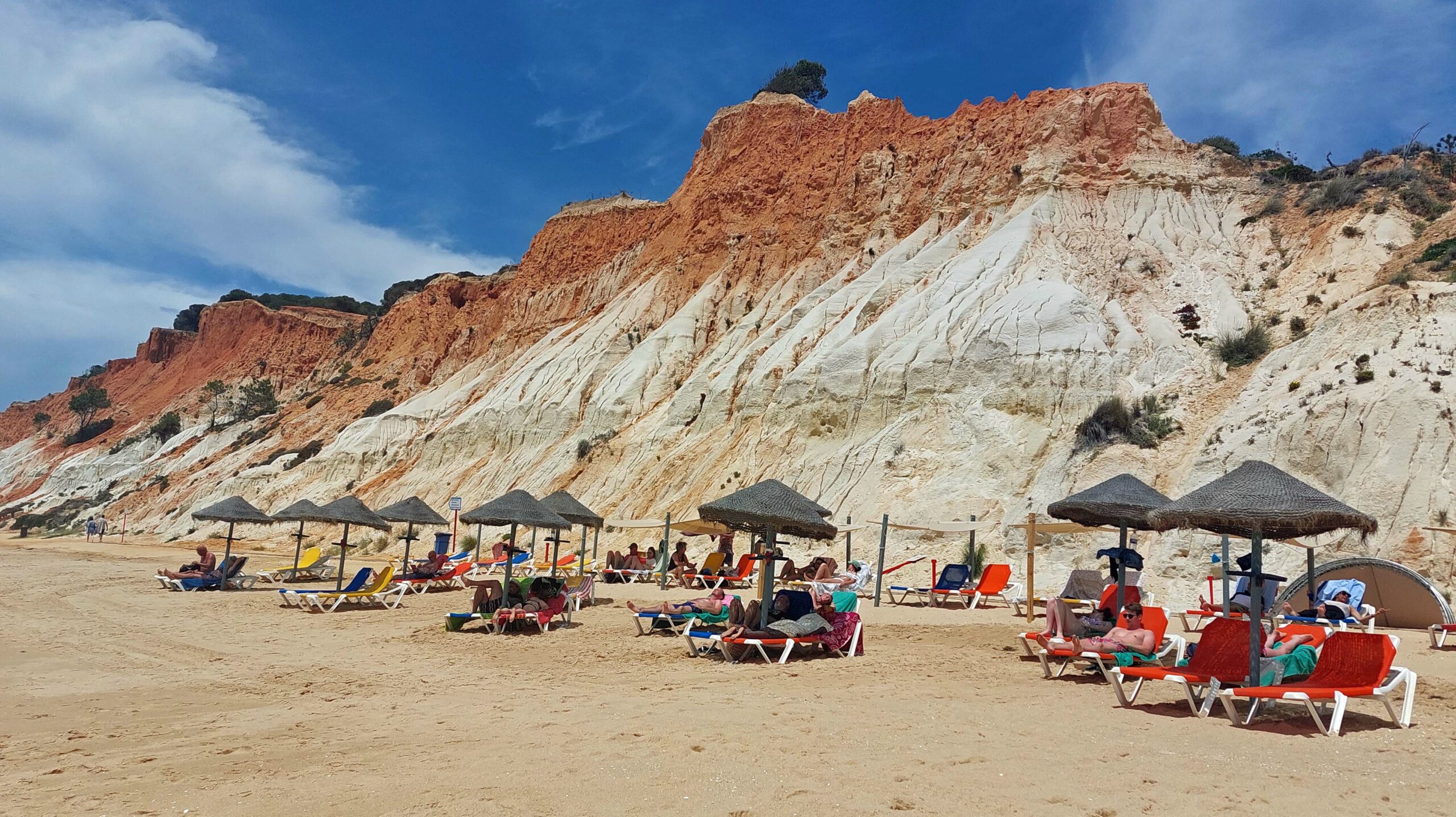 Wow! Was für eine atemberaubende Kulisse und ein bizarres Farbenspiel! Der Praia da Falésia ist sechs km lang, mit feinstem Sand, glasklarem Wasser und ist eingerahmt von teils 20 Meter hohen rot-, ockerfarbenen- und grauschattierten Sandsteinfelsen, die mit Pinien bewachsenen sind. Die fragilen Lehmfelsen haben hier den Bau von Mega-Hotels verhindert.