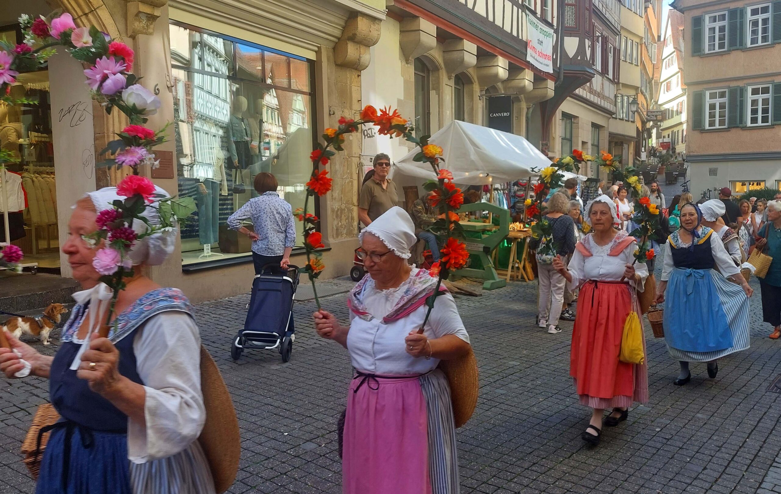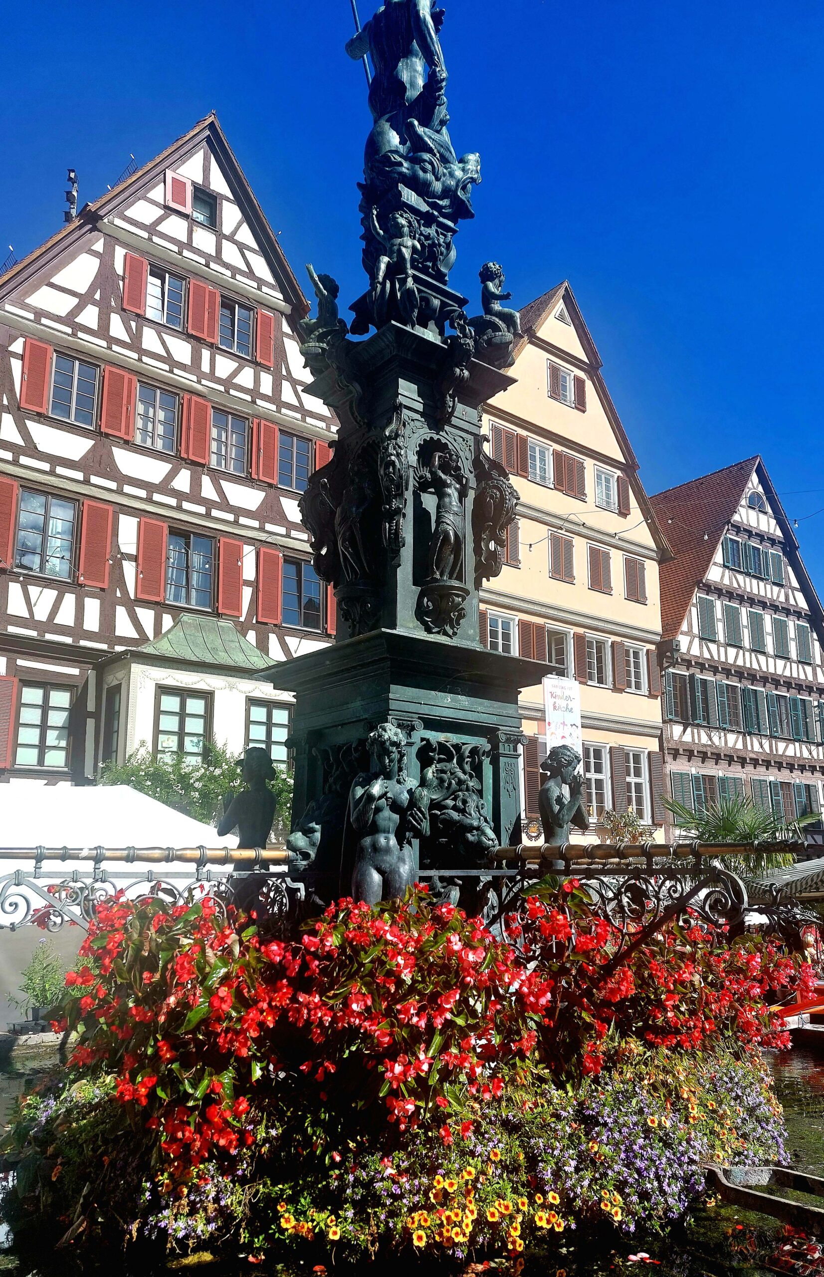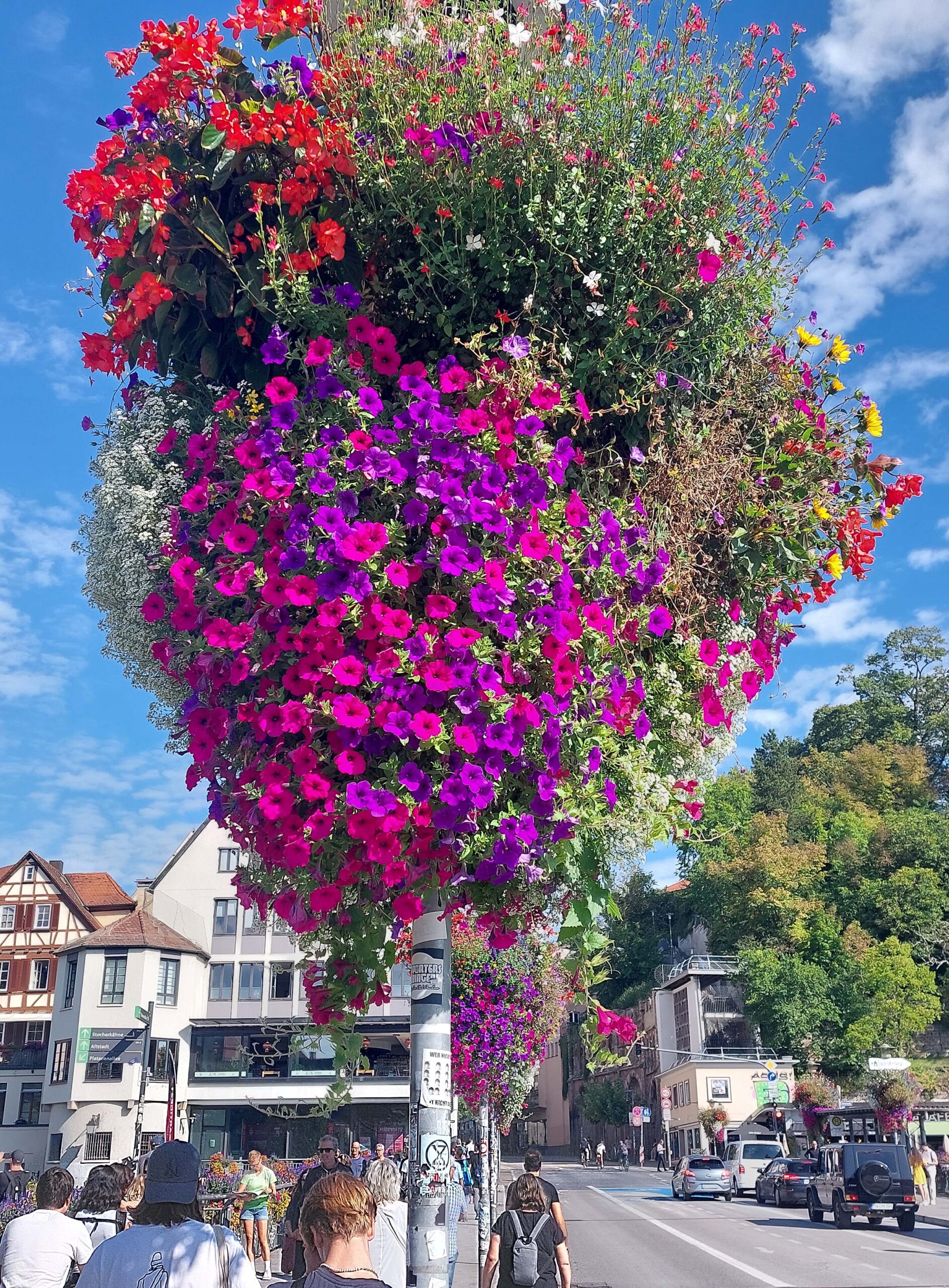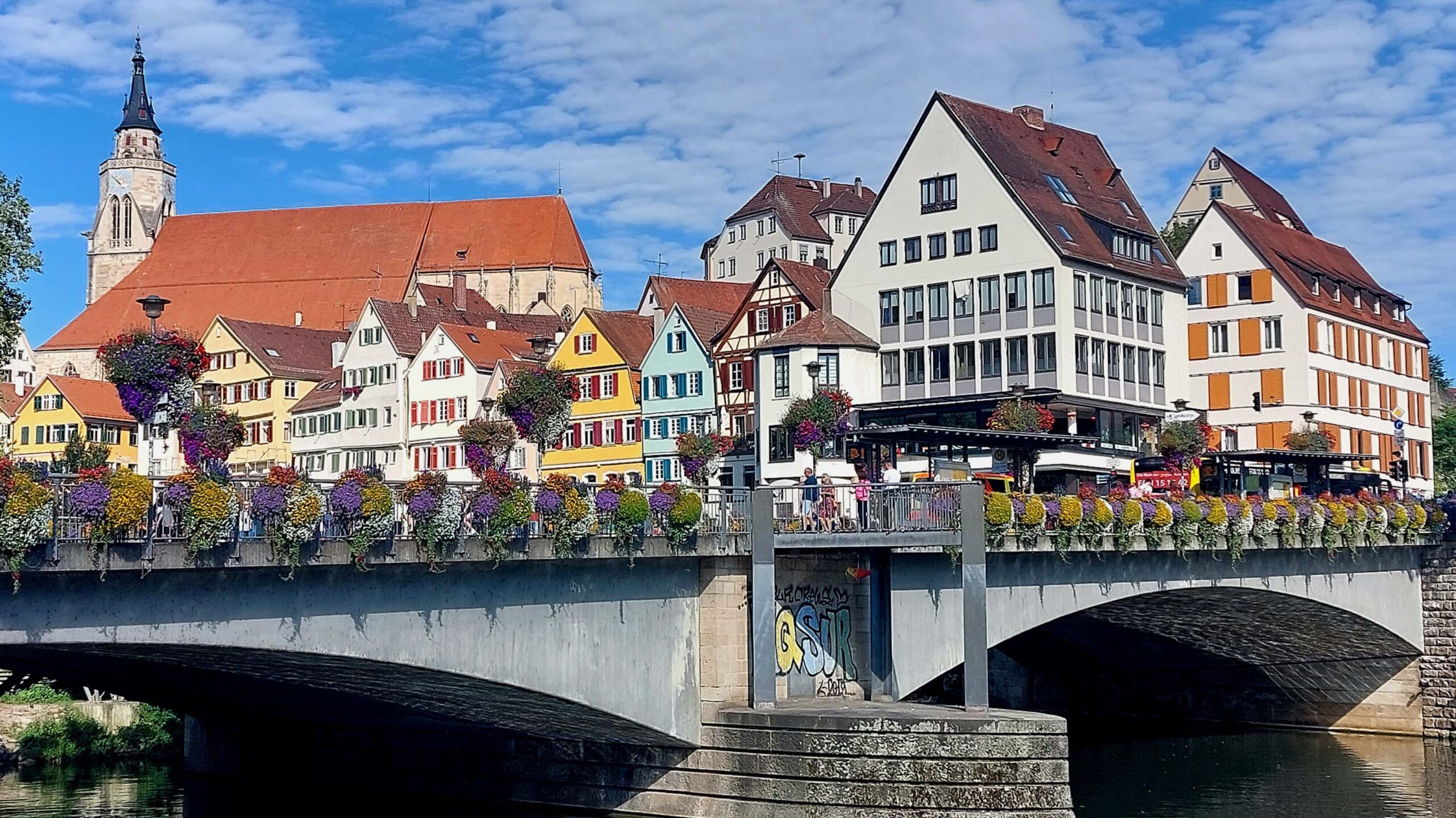 Ich erreiche die blumengeschmückte Neckarbrücke – die eigentlich Eberhardsbrücke heißt – und bewundere DAS Fotomotiv der Stadt! Jahrhundertalte windschiefe Fachwerkhäuser 🏠🏘️🏚️🏡lehnen sich unterhalb des Schlossbergs aneinander und spiegeln sich fotogen im Neckar. Unterhalb des Häuser-Ensembles sitzen Studenten, Touristen und Einheimische wie Spatzen 🐦 aufgereiht auf der Zwingelmauer und lassen gemächlich die Füße 👣 baumeln.