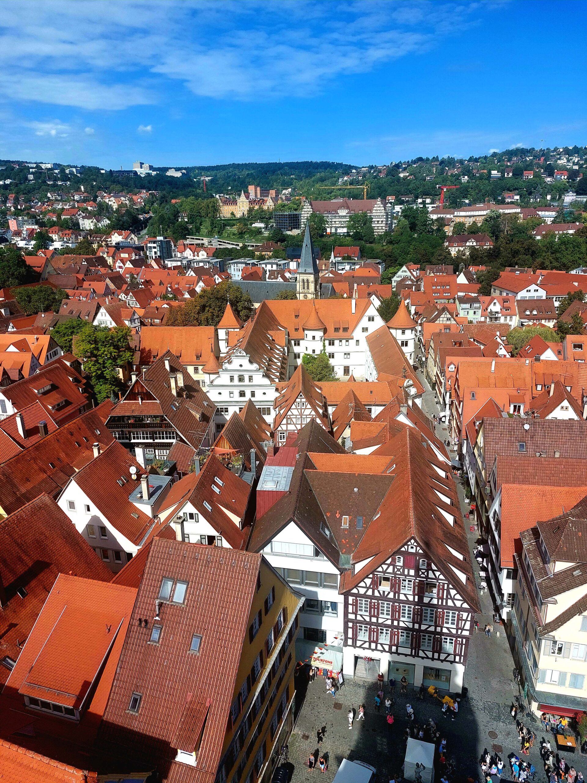 Auf dem Markt der Partnerstädte schlemme ich ein Porchettabrötchen 🐖🐽 und steige dann auf den 56 Meter hohen Aussichtsturm der spätgotischen Stiftskirche St. Georg aus dem 15. Jhd. Hier habe ich einen unfassbar schönen Rundblick auf die roten Dächer Tübingens und die Landschaft drum herum. Das genieße ich eine halbe Ewigkeit!