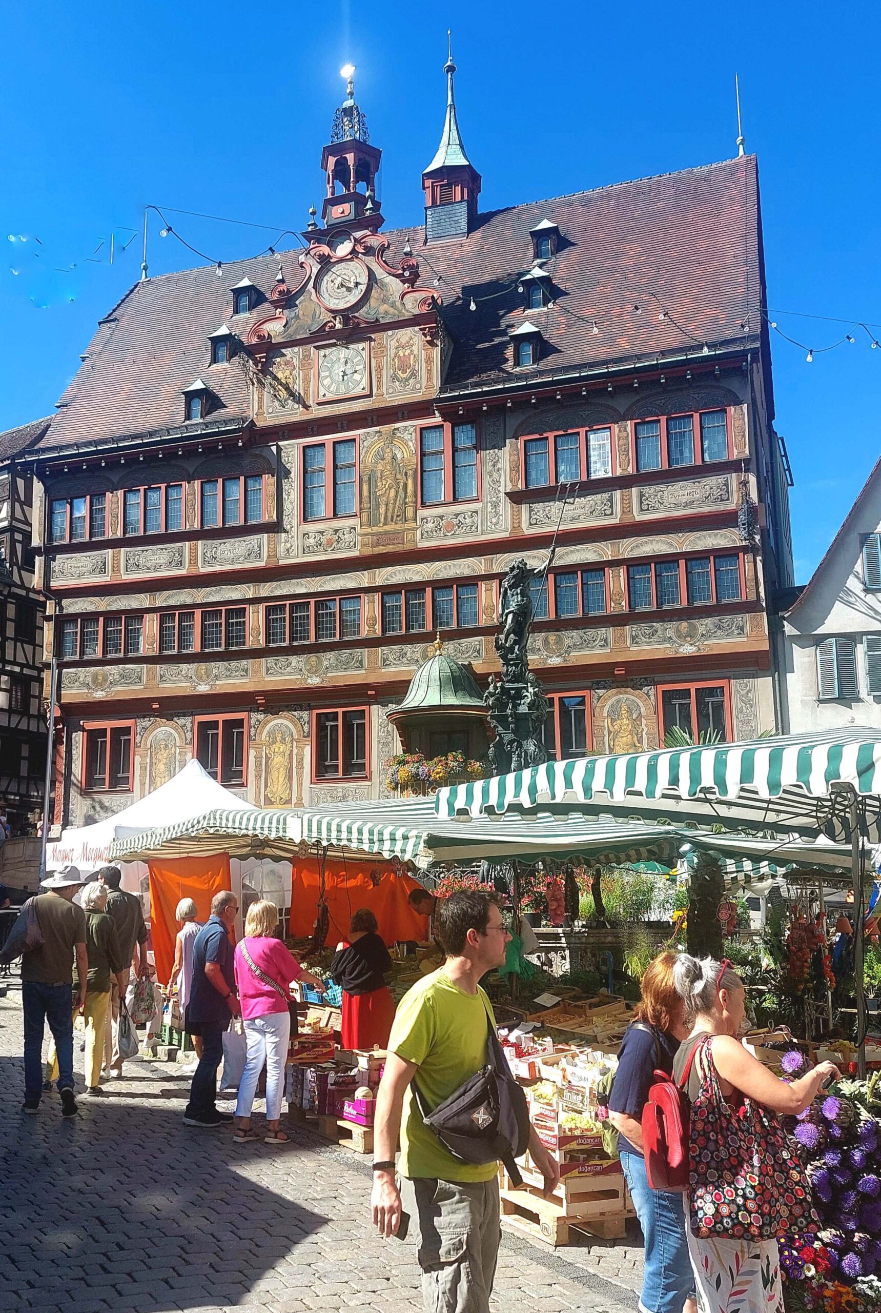 Jetzt zieht es mich wieder Richtung Marktplatz. Auf dem Holzmarkt – dem kleinen Bruder des Marktplatzes – findet gerade ein Marktumzug statt. Vor dem Neptunbrunnen ⛲ chillen die Menschen auf den Treppen der Stiftskirche. Ich laufe ein letztes Mal über den malerischen Platz mit den Häusern aus dem 15. und 16. Jhd. Genau hier schlägt das Herz 💗der Stadt. Der Blickfang ist das bunt bemalte Rathaus von 1435 mit der astronomischen Uhr.