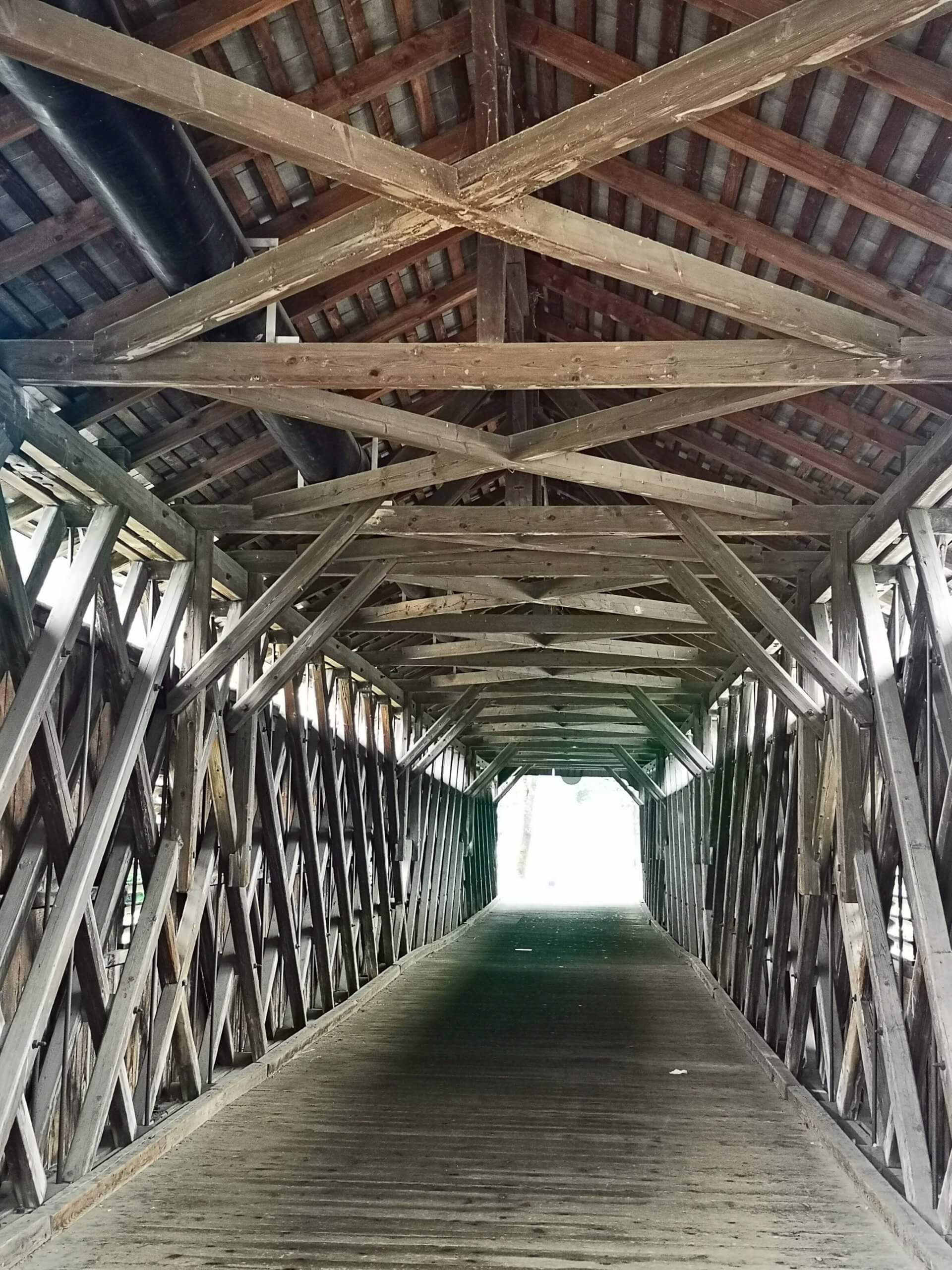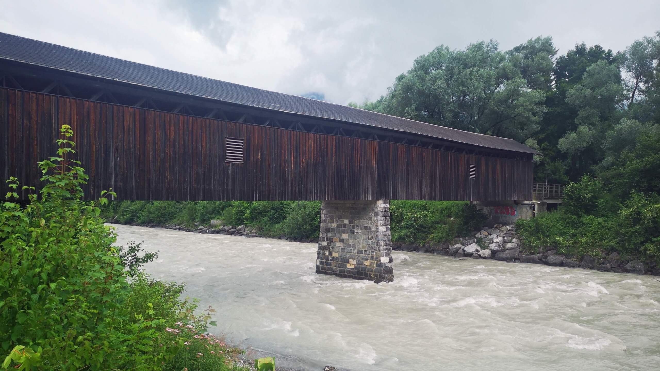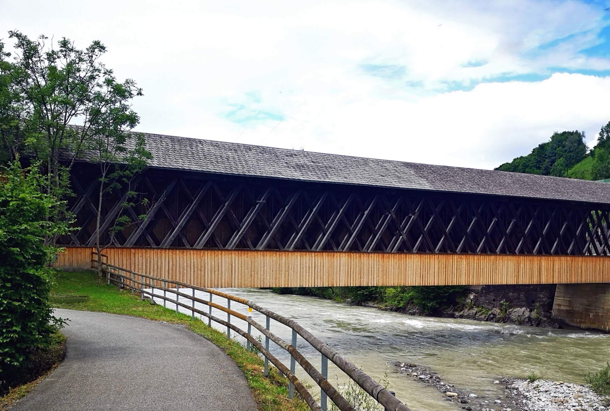 Es bleibt trocken, manchmal gibt es den einen oder anderen Regentropfen. Aber damit kann ich gut leben. Es geht durch die Tschalungaau nach Nenzing, weiter durch den Galinawald, vorbei an wunderschön gelegenen Baggerseen, dem Nachbauer und dem Galina. Bei Frastanz spannt sich die Schildriedbrücke, eine historisch gedeckte Holzbücke (1876), über den Fluss. Der Weg führt weiter durch Felsenau und die Felsenau-Schlucht ins mittelalterliche Feldkirch mit seiner trutzigen Schattenburg.