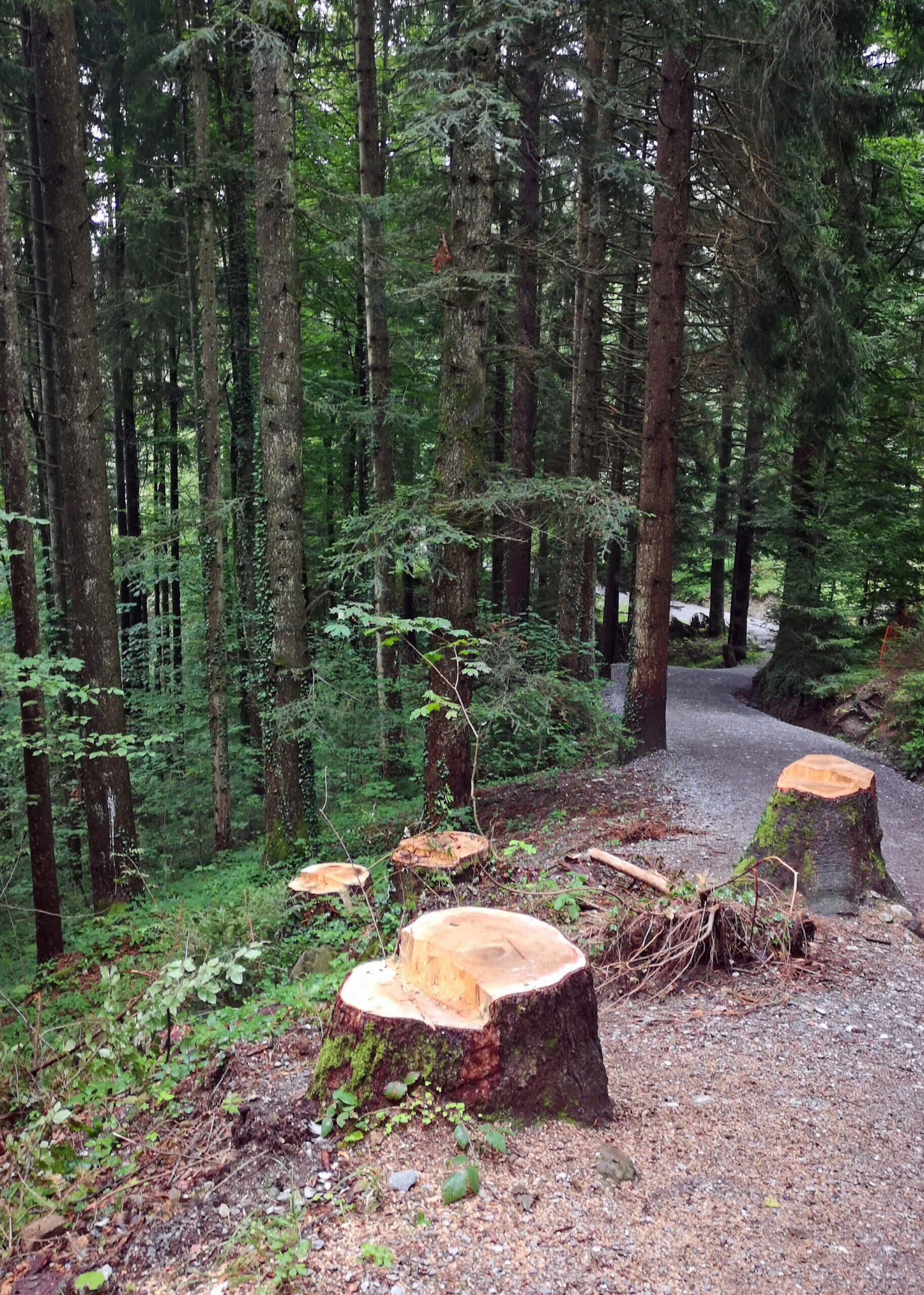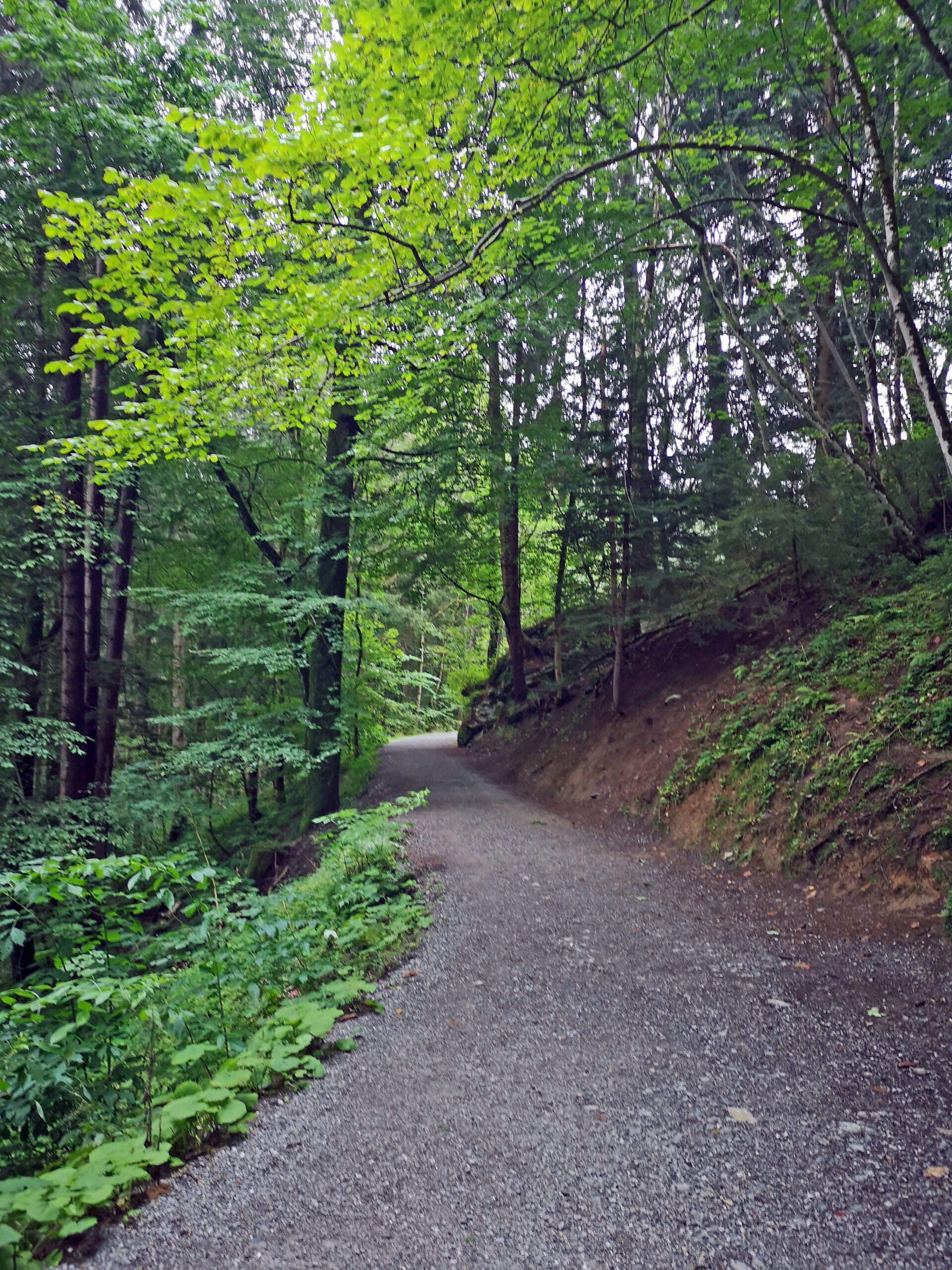 Ich wandere zunächst auf ebenerdigem Weg, was aber nur von kurzer Dauer ist. Es beginnt der Abstieg vom Karren, denn eine Schlucht liegt bekanntlich ganz unten. Und wieder geht es über Wurzeln und Steine, durch wegen Baumfällarbeiten gesperrte Abschnitte, über umgestürzte Bäume, die quer über dem Weg liegen, aber auch mit Blicken auf Dornbirn und den Bodensee. Kurz vor dem Staufensee entdecke ich das erste Hinweisschild zur Alplochschlucht. Genial, herzlichen Glückwunsch an die Macher!