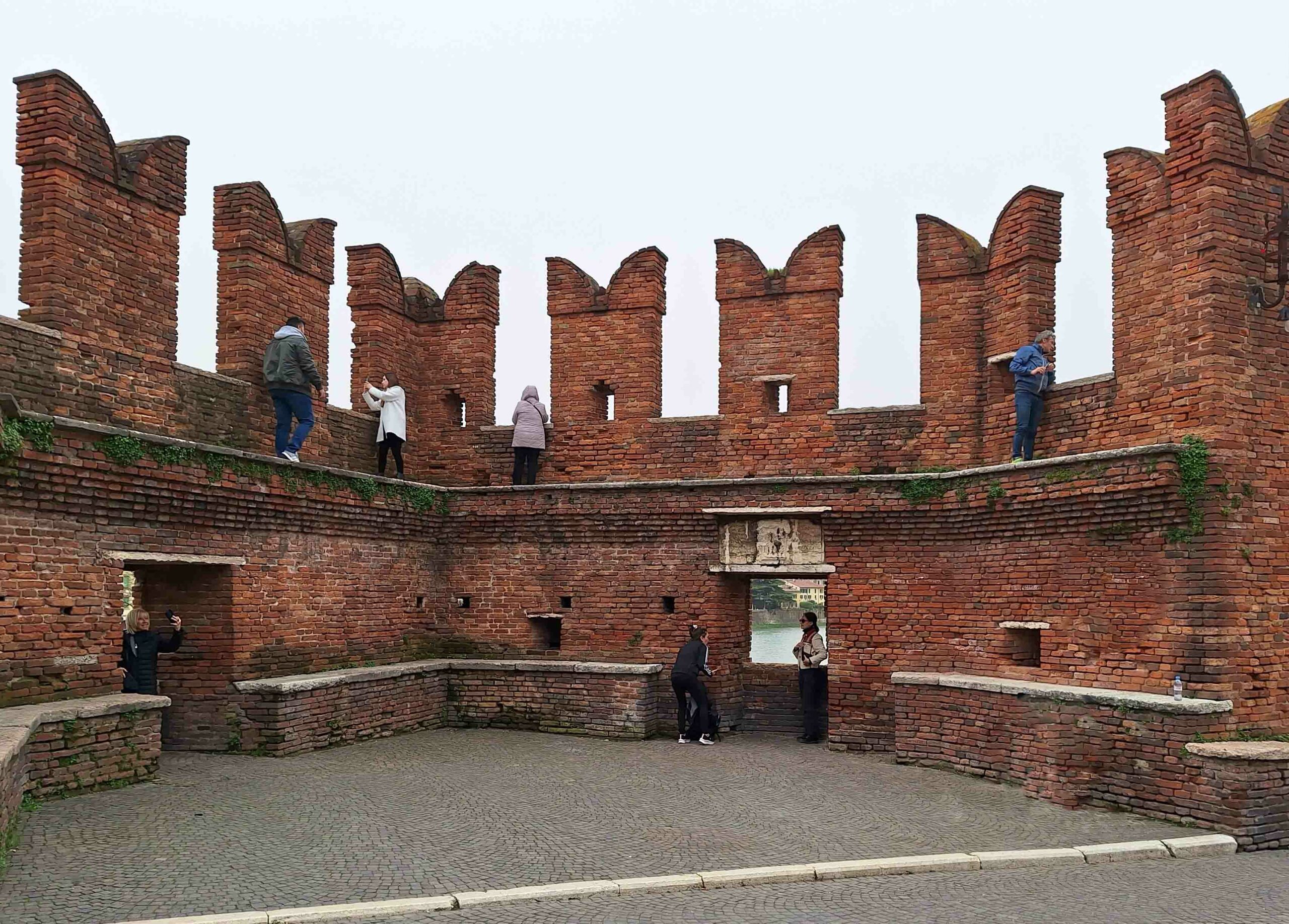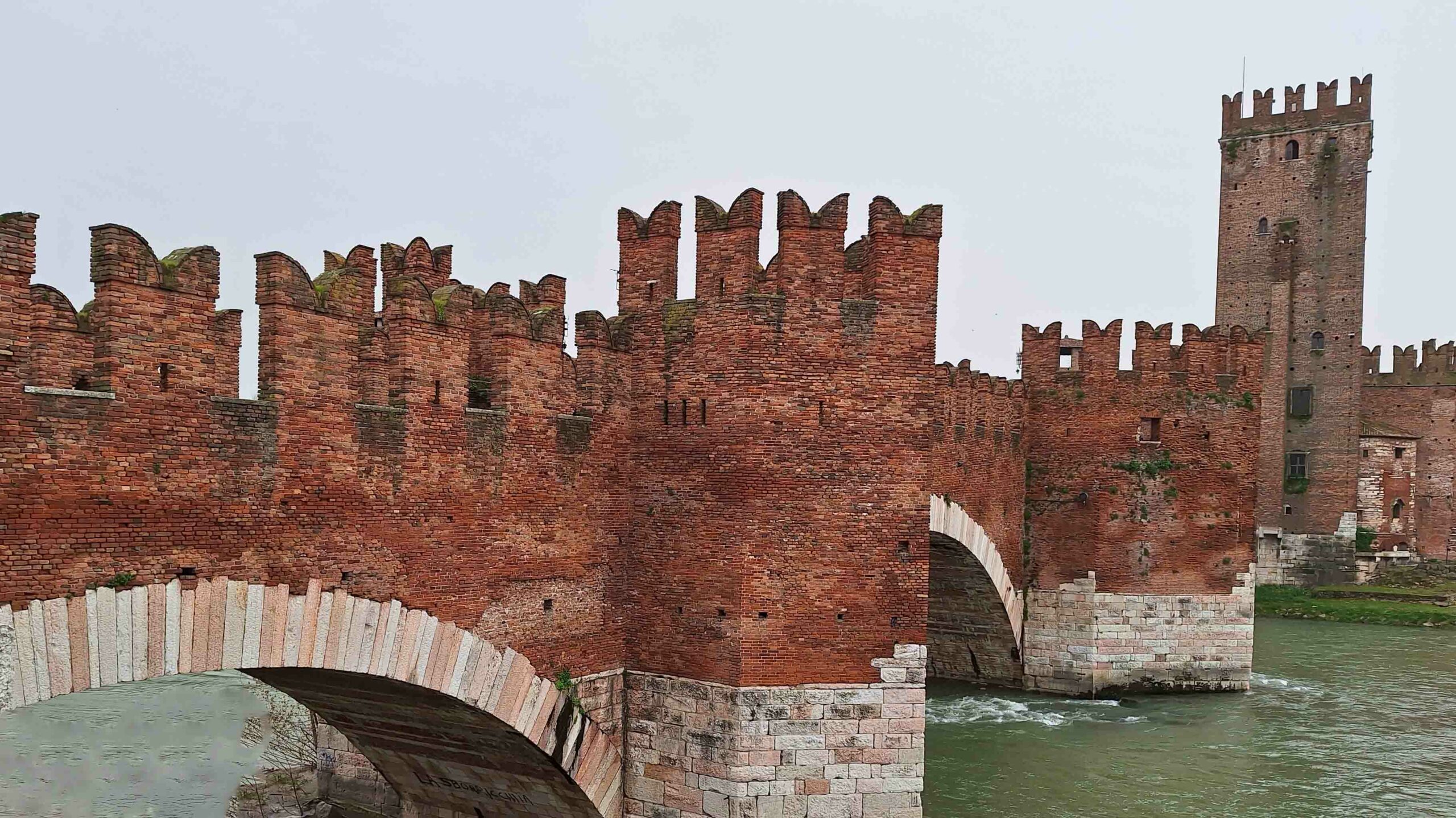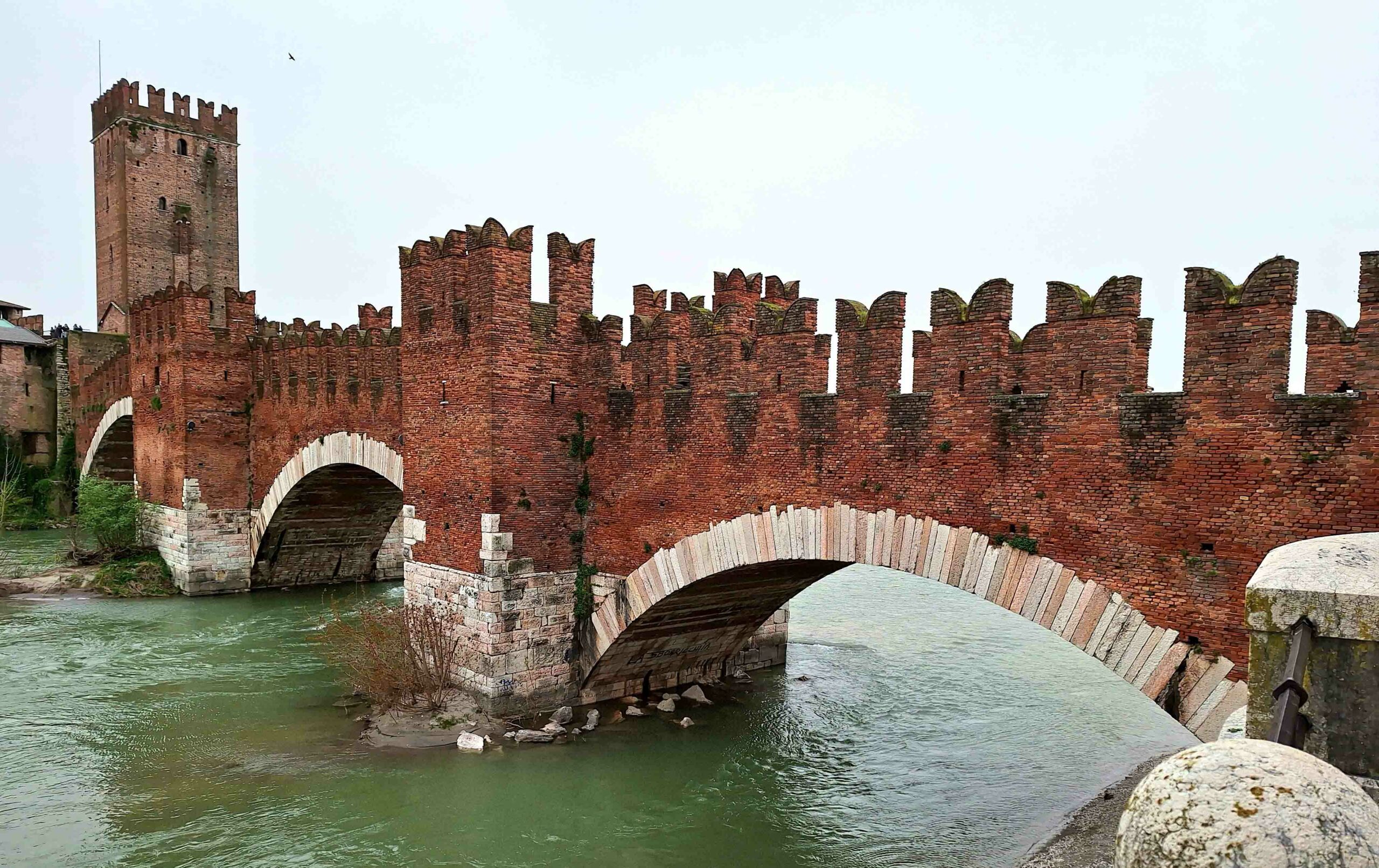 Auf dem Weg – in der Nähe des Castelvecchio – entdecke ich diesmal ein kleines Kirchlein, eingequetscht zwischen zwei großen Häusern. Kurz darauf stehe ich schon auf der 120 Meter langen Ponte Scaligero des mächtigen Castelvecchio. Die Aussicht von hier auf die Etsch ist genial. Die damaligen tyrannischen Herrscher erbauten sie, um sich die aufbegehrende Stadtbevölkerung vom Leibe zu halten. Diese hatte die Nase gestrichen voll von dem despotischen Regime.