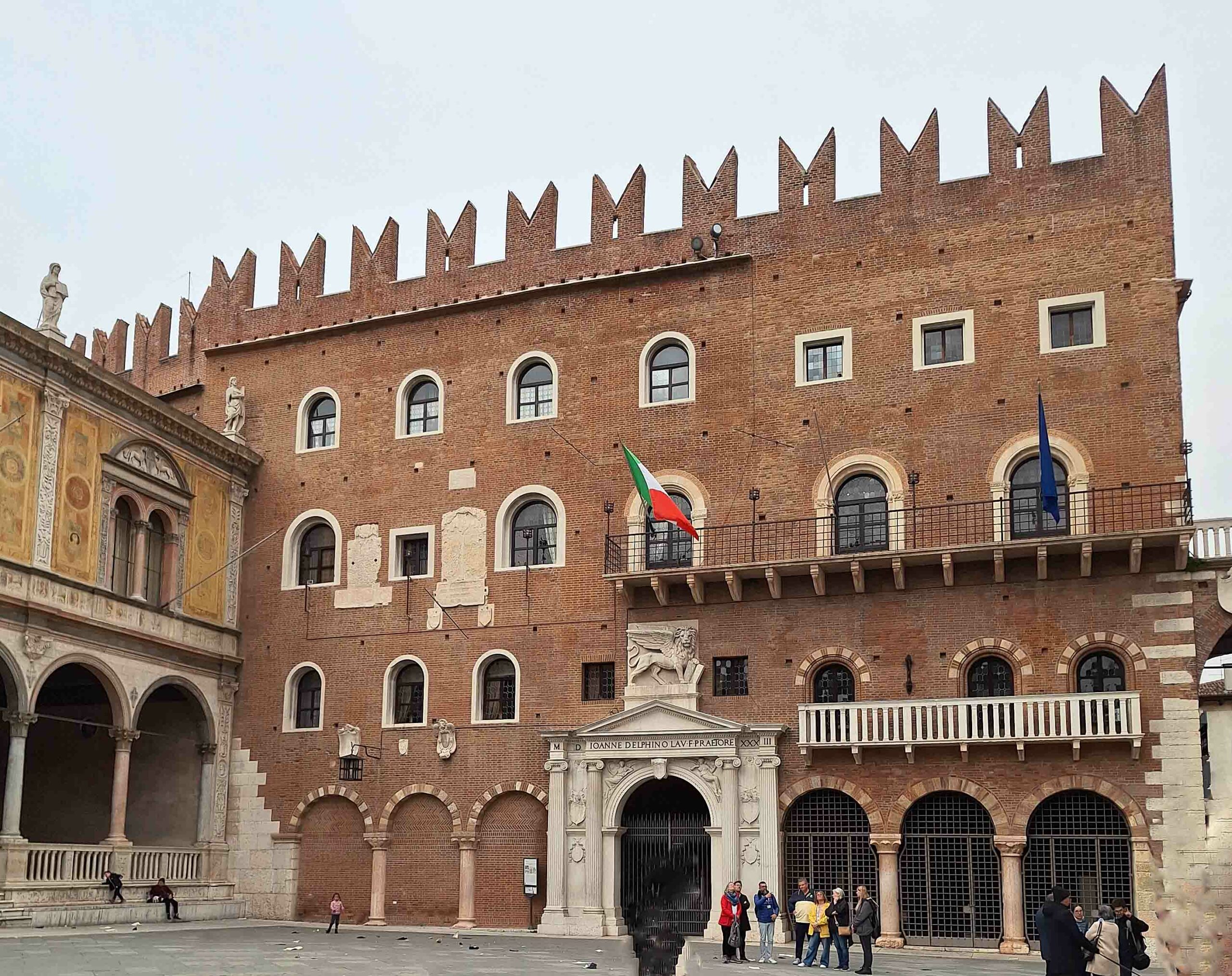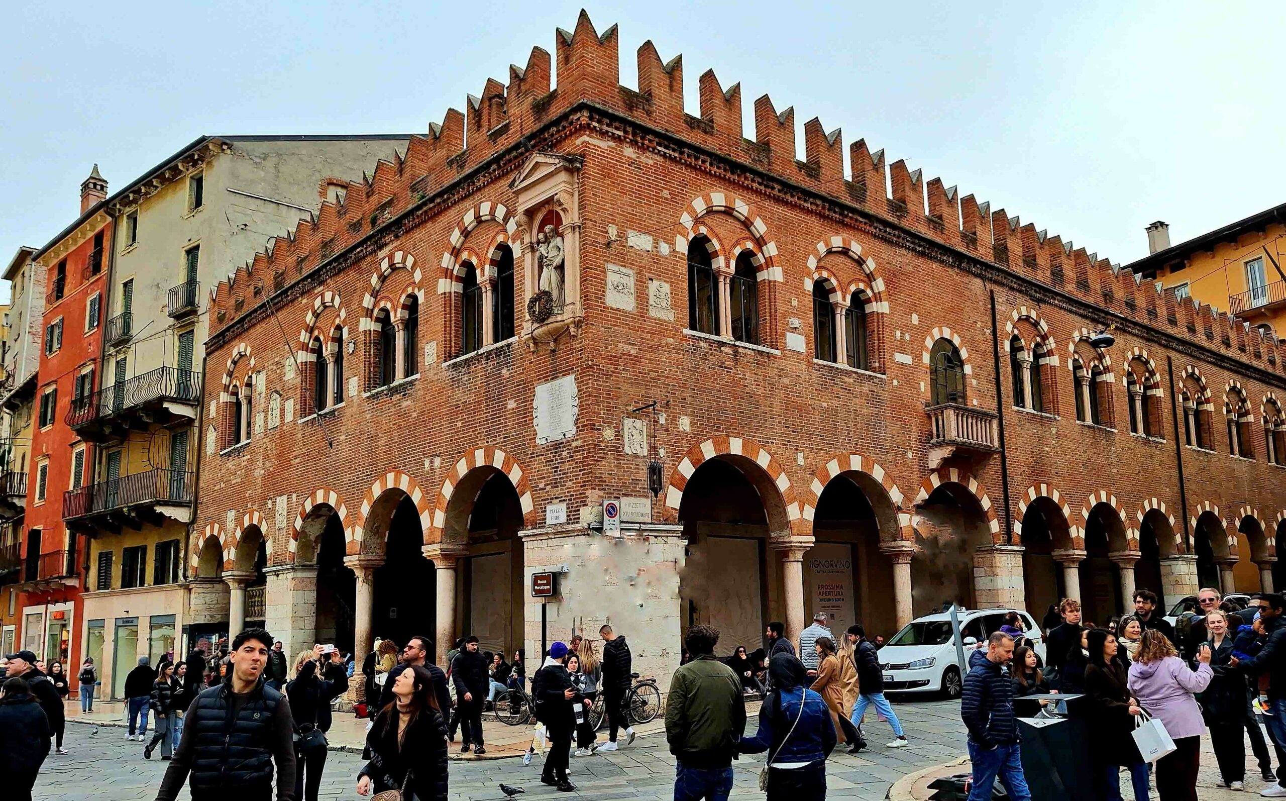 Der dritte Platz auf meiner Rangliste Veronas ist die Piazza di Signori, ein würdevoller Platz. Mit strenger Denkermine steht in der Mitte die drei Meter hohe Statue von Dante, dem bedeutendsten italienischen Dichter des Mittelalters. Ich betrete den Platz durch den Arco della Costa, an dem seit Jahrhunderten eine Walrippe baumelt. Die Legende besagt, der Teufel 😡habe hier eine seiner Rippen verloren. 😆🤣 Der Weg durch den Arco aber diente dazu, die Richter von ihrem Wohnsitz zum Gerichtsgebäude der Stadt zu führen. Sie sollten nicht durch die Stadt gehen, um dabei von böswilligen Personen bestochen zu werden, wenn sie ihre Urteile fällten. Weitere Highlight sind der Palazzo della Regione mit der Domus Nova.