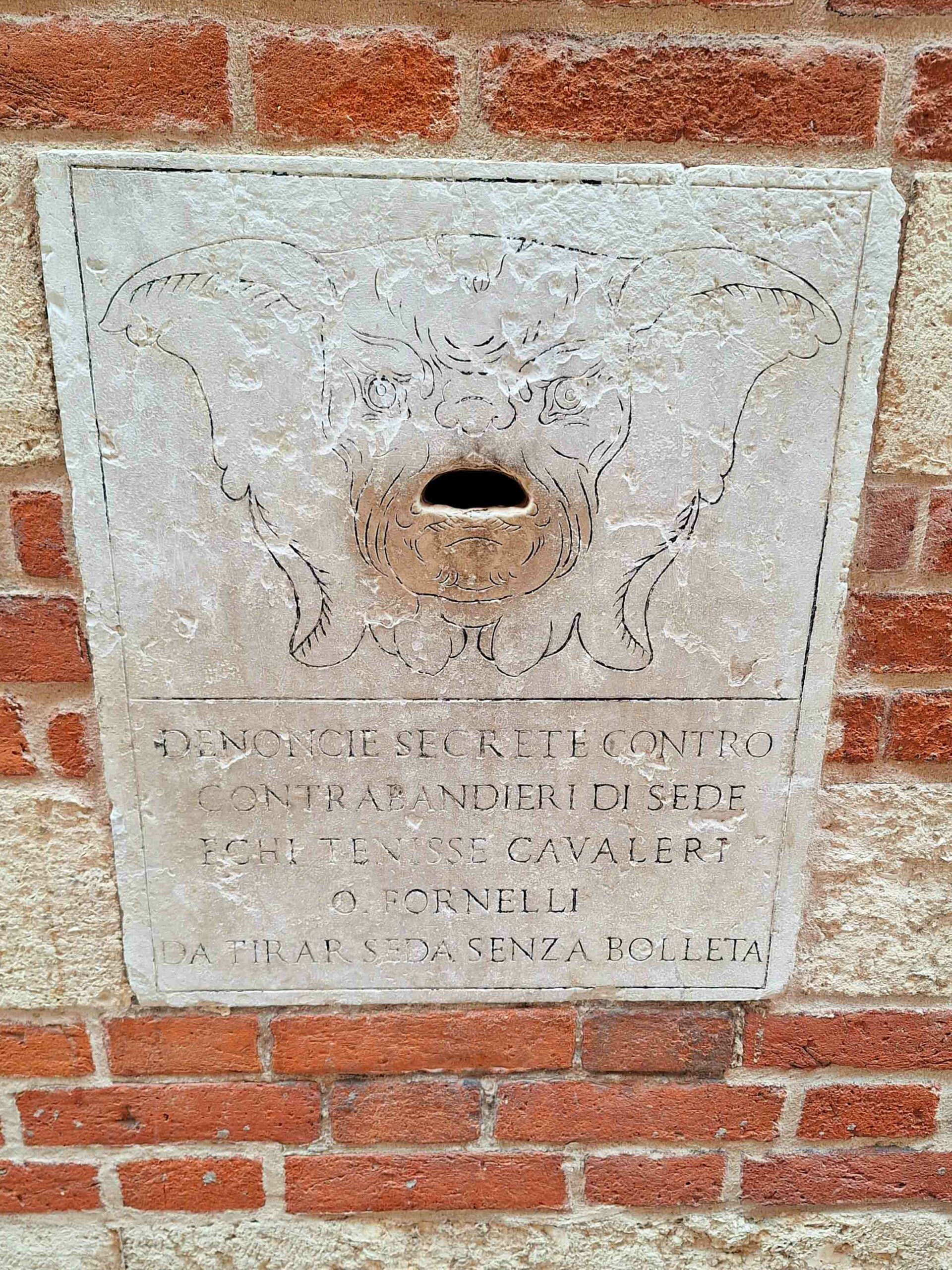 Die Zeit rennt, aber ich verlasse Verona nicht, bevor ich nicht über die Ponte Pietra geschlendert bin. Schade, dass sich der kurze Sonnenschein wieder hinter dicken Wolken verzogen hat. Ich komme an einem Schlitz mit Gesicht in der Mauer eines Hauses vorbei. Hier konnten geheime Anzeigen gegen Schmuggler des Hauptquartiers eingeworfen werden.