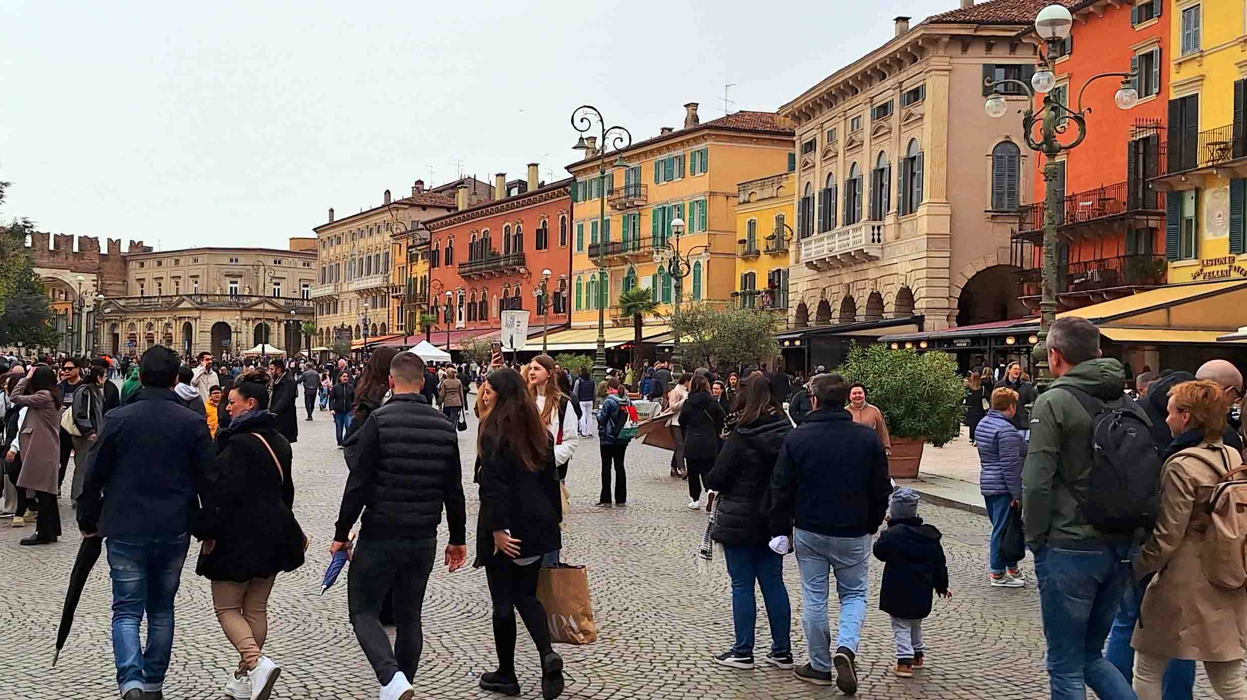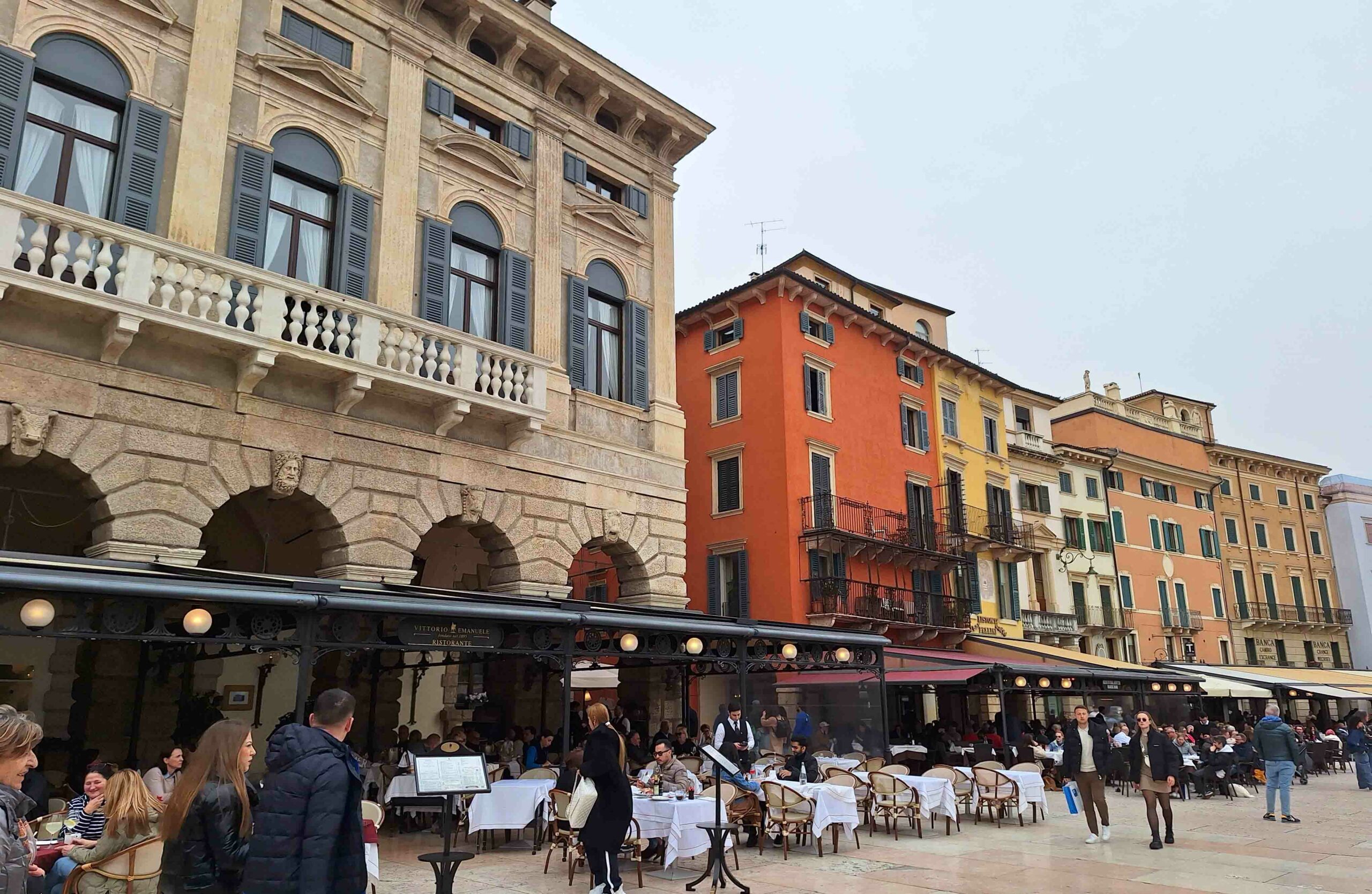 Der länglich geformte Platz ist ein Gesamtkunstwerk: es gibt prunkvolle Paläste, jahrhundertealte Türme, gotische Säulen, Cafés in vorderster Reihe und einen bunten, sehr touristisch angehauchten Markt. Die Piazza ist der malerische Mittelpunkt Veronas. In der Antike Markt- und Versammlungsort, in der römischen Zeit Zentrum des politischen, wirtschaftlichen und gesellschaftlichen Lebens. Ich stürze mich in das unfassbar faszinierende wuselige Ambiente des Platzes mit seinem historischen Charme.