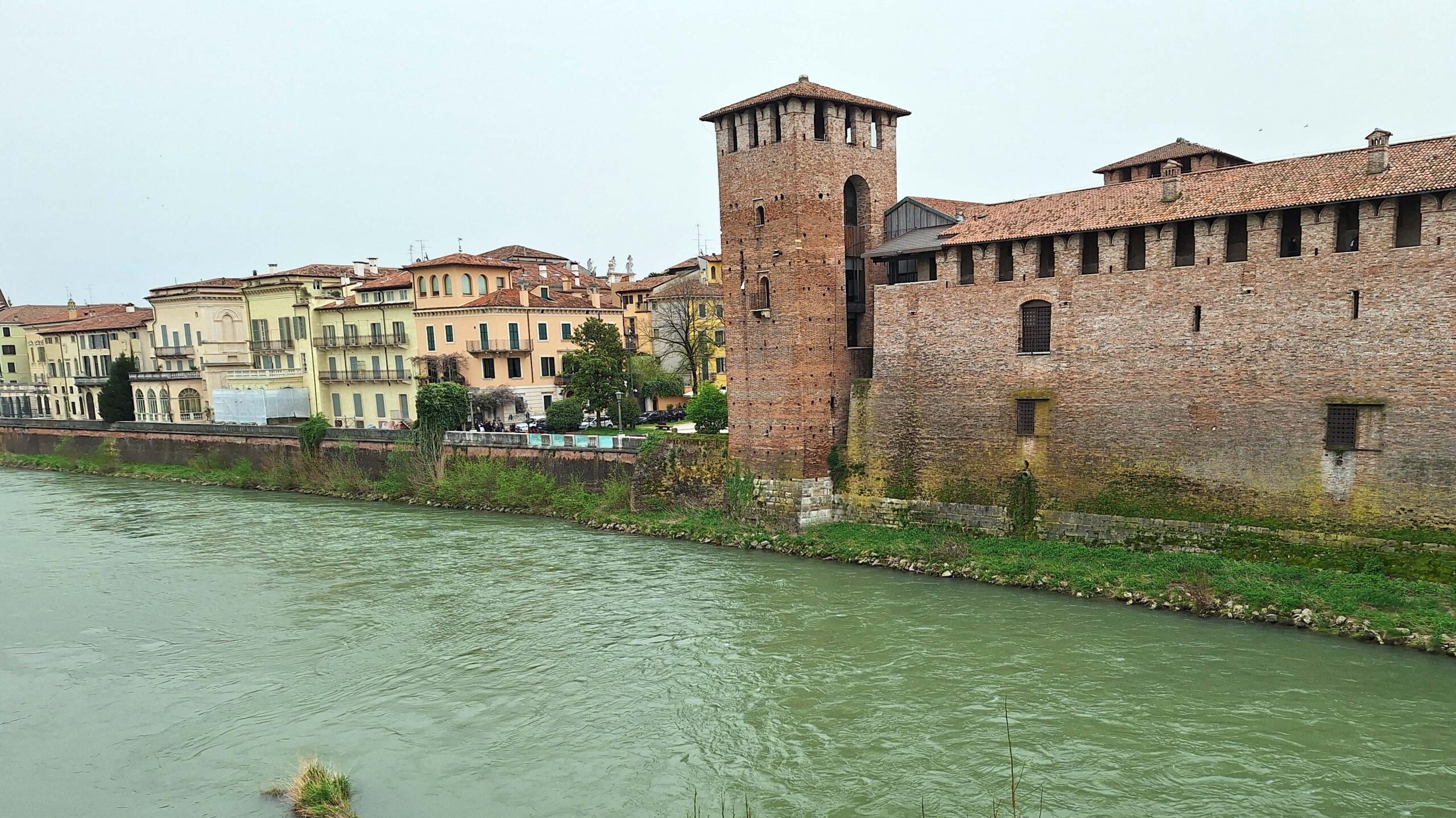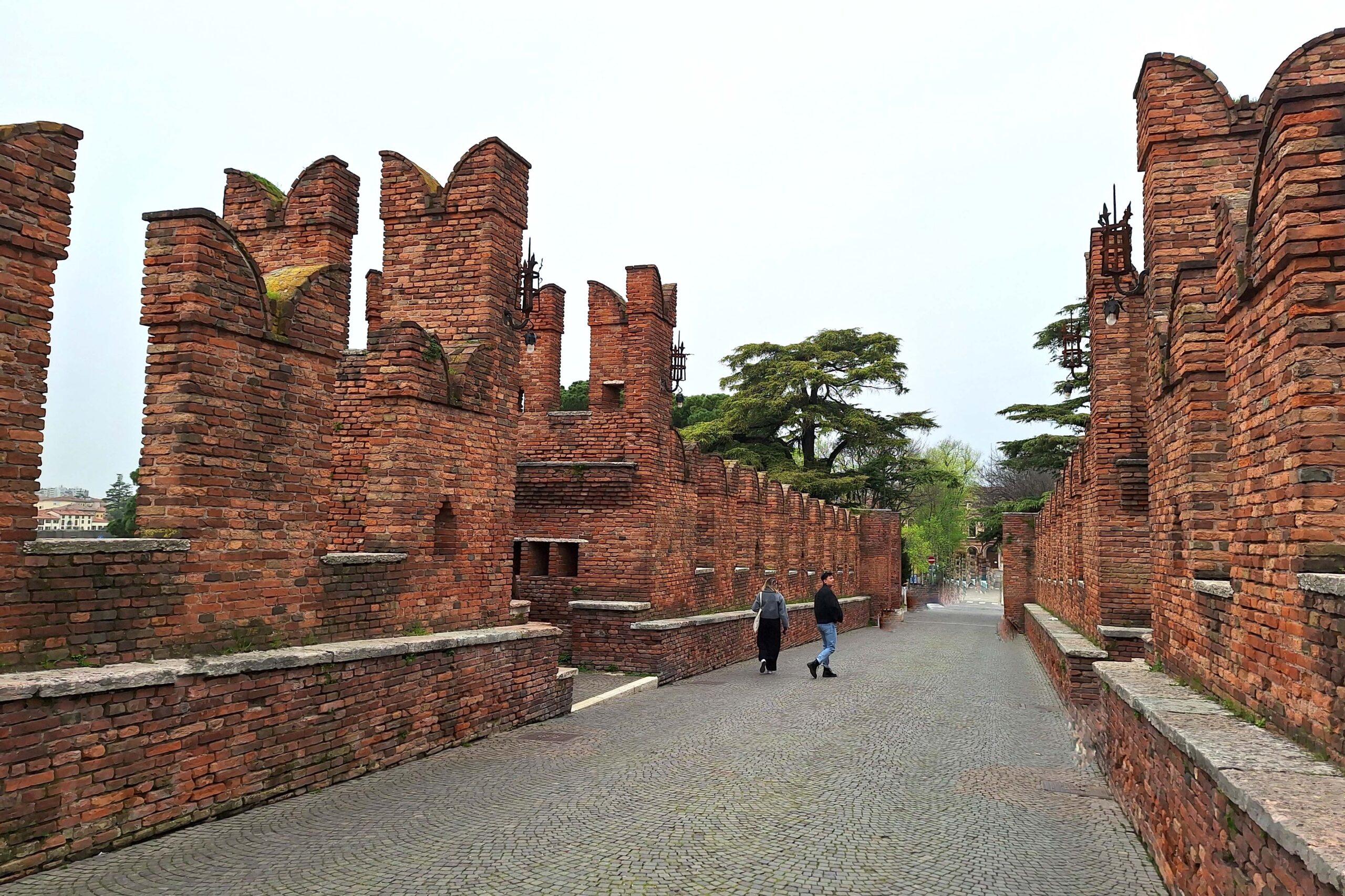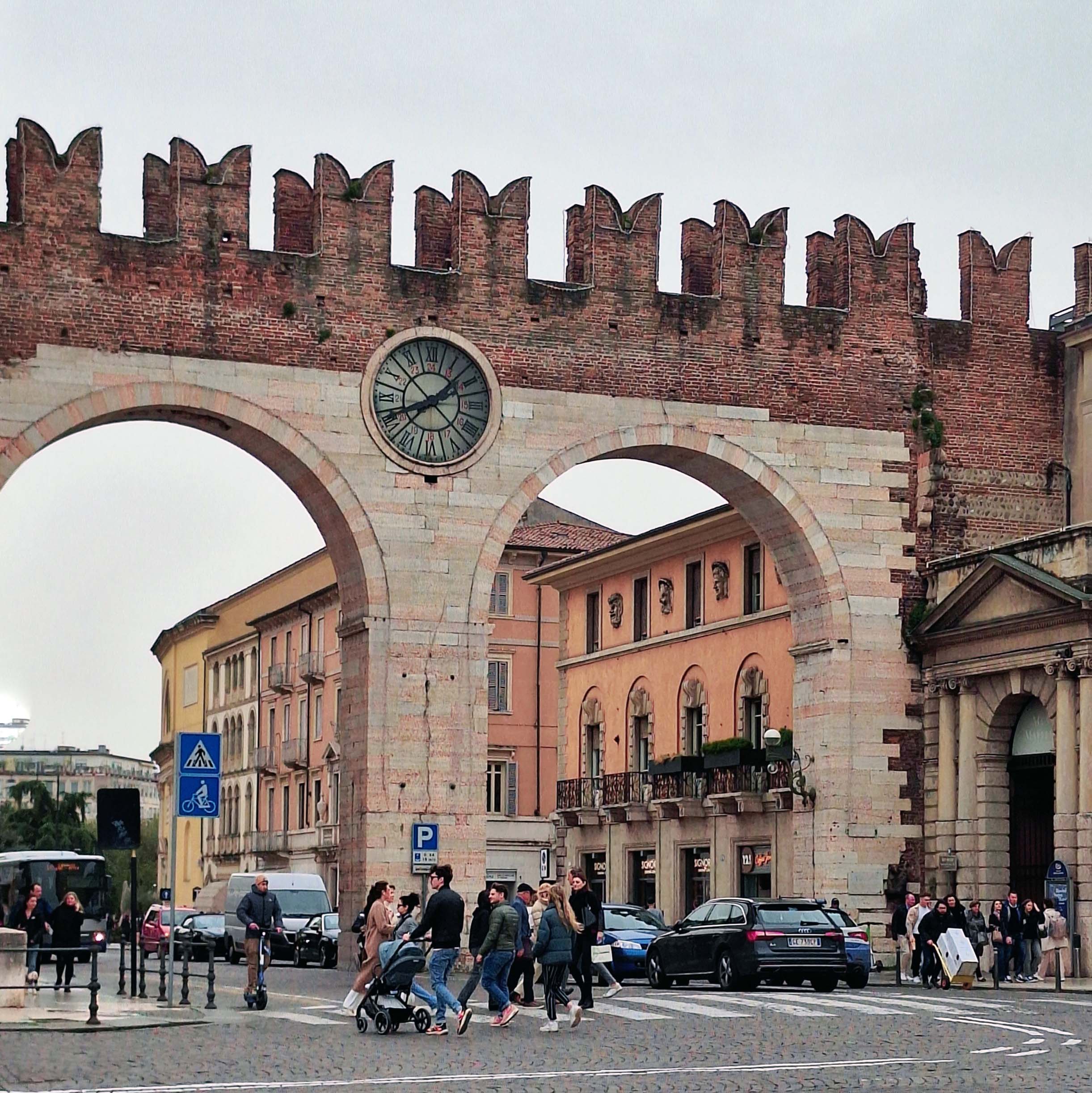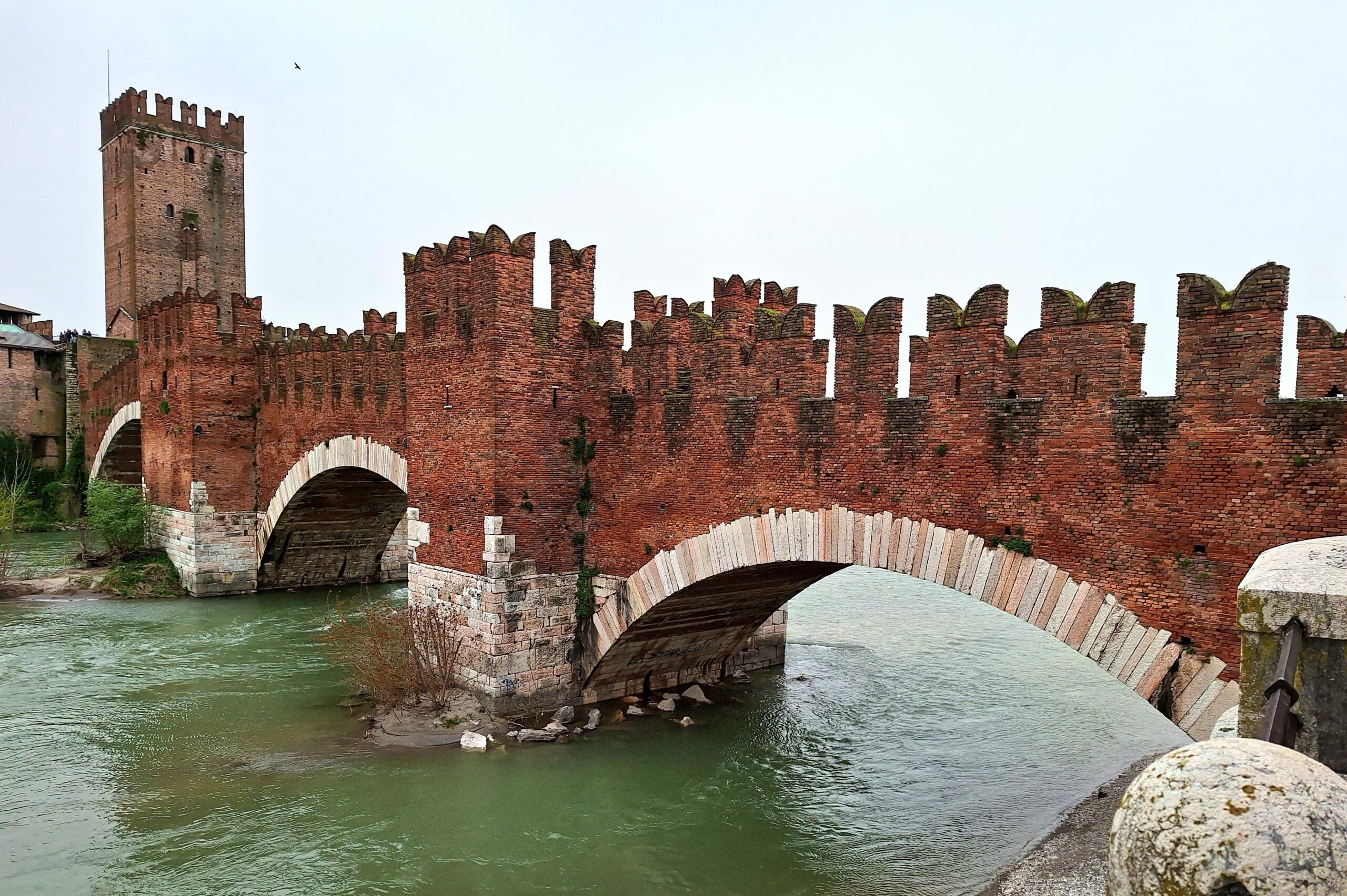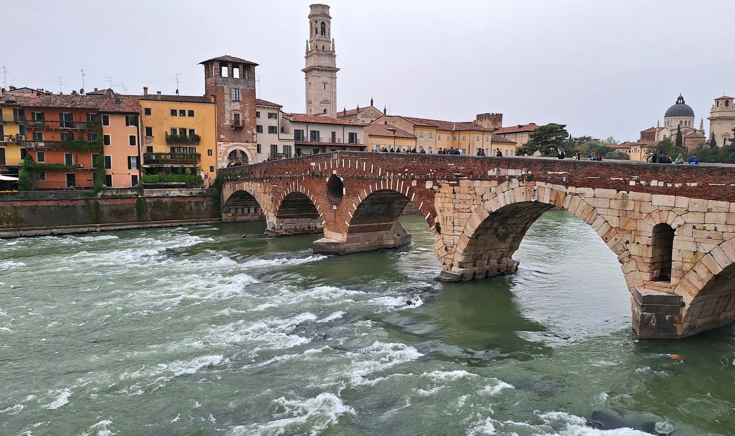 Ich entdecke auf meinem Weg eine sehr kleine Kirche, eingequetscht zwischen zwei Wohnhäusern. Und schon biege ich ein auf die Ponte Scaligero Castelvecchio. Es ist massig was los hier. Überall klettern und kleben Touris an und auf der Brückenmauer. 🧗