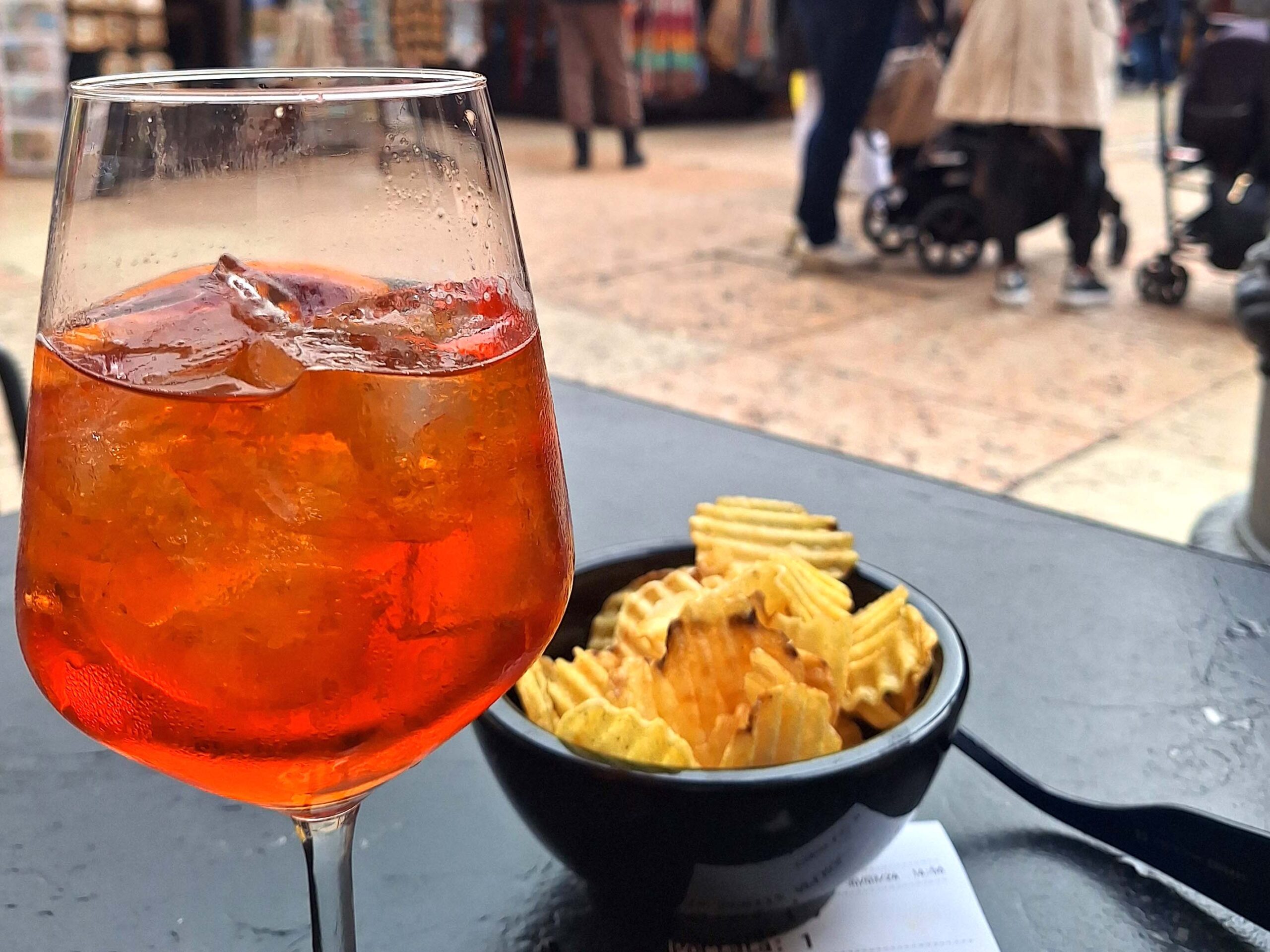 Das möchte ich zunächst in vollen Zügen und in aller Ruhe mit einem leuchtenden Aperol Spriz g🍹enießen. Der italienische Klassiker steht hier auf fast jedem Tisch.