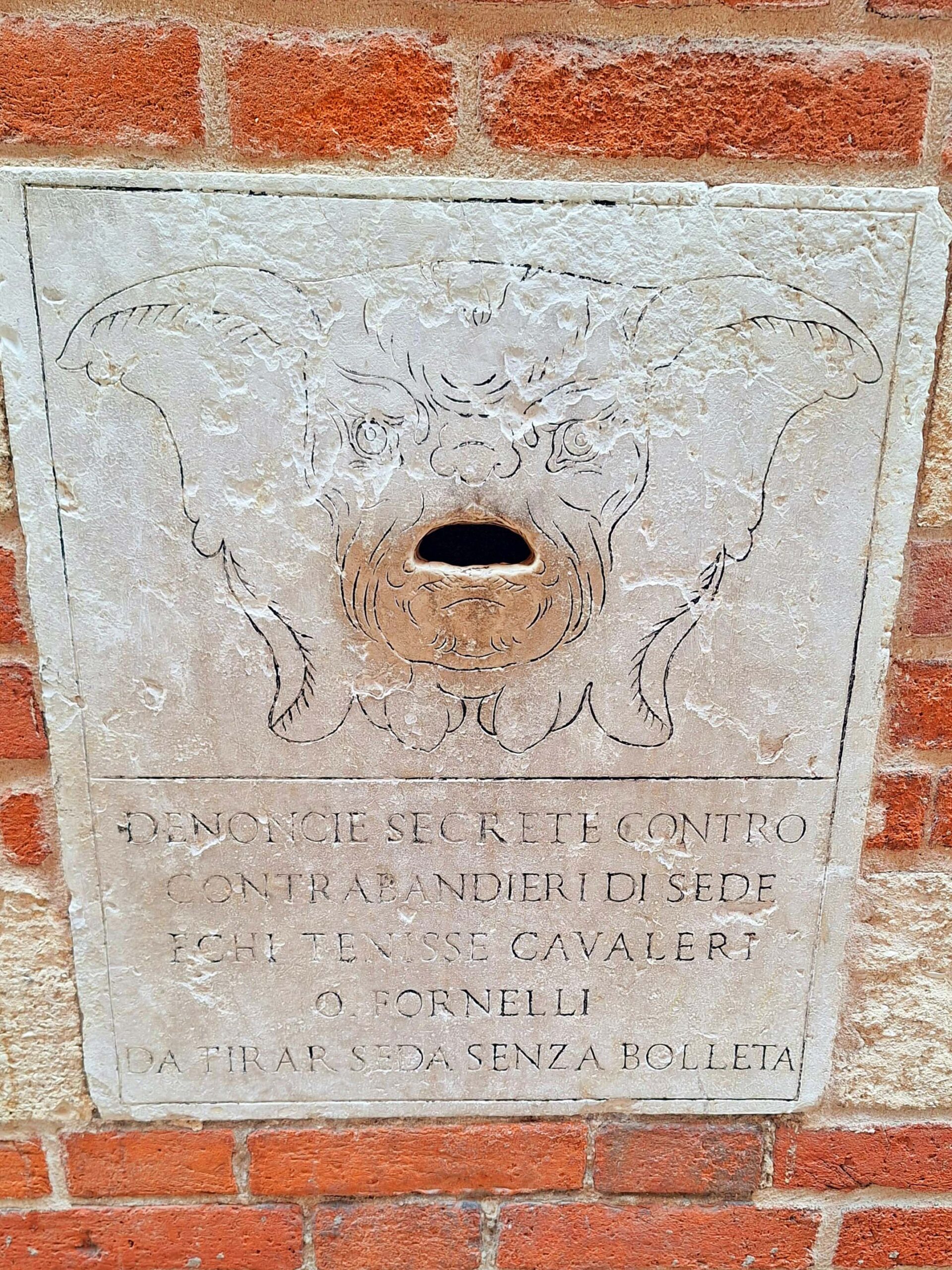 Zum Abschluss meines Verona-Tages eile ich noch zur Ponte Pietra. Dabei fällt mir ein Schlitz mit Gesicht in der Mauer eines Hauses auf. In diesen „Briefkasten“ konnten Anzeigen gegen Schmuggler des Hauptquartiers eingeworfen werden.