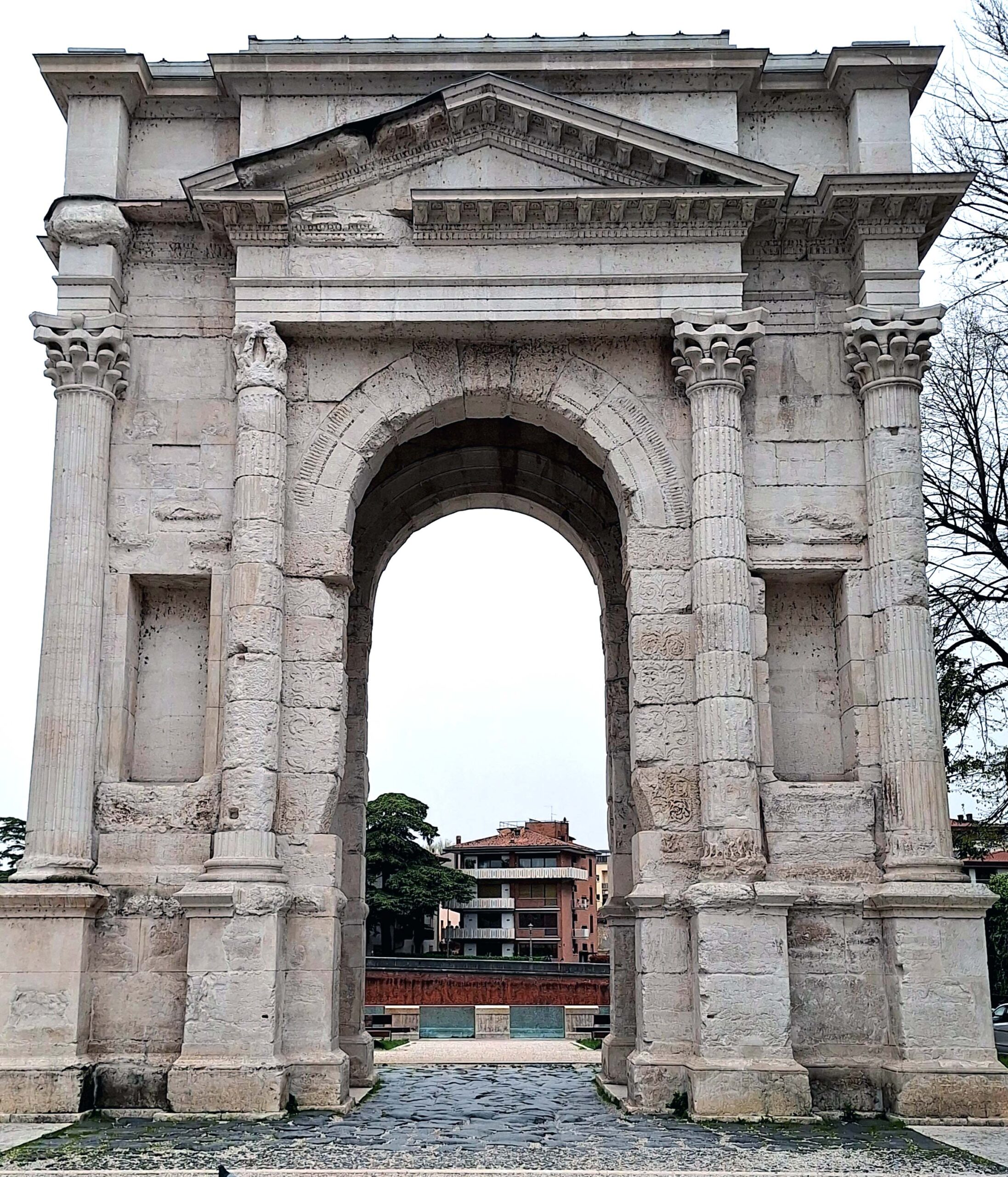 Von der Brücke aus der Römerzeit habe ich eine fantastische Sicht auf den zypressenbestandenen Hügel, auf dem ein Kastell und die Reste eines römischen Theaters stehen. Der Weg hinauf fällt dem Nieselregen 🌦️ zum Opfer. Kurz vorm Parkplatz von Fiete treffe ich noch auf den Arco di Gavi, einem ehemaligen Stadttor.