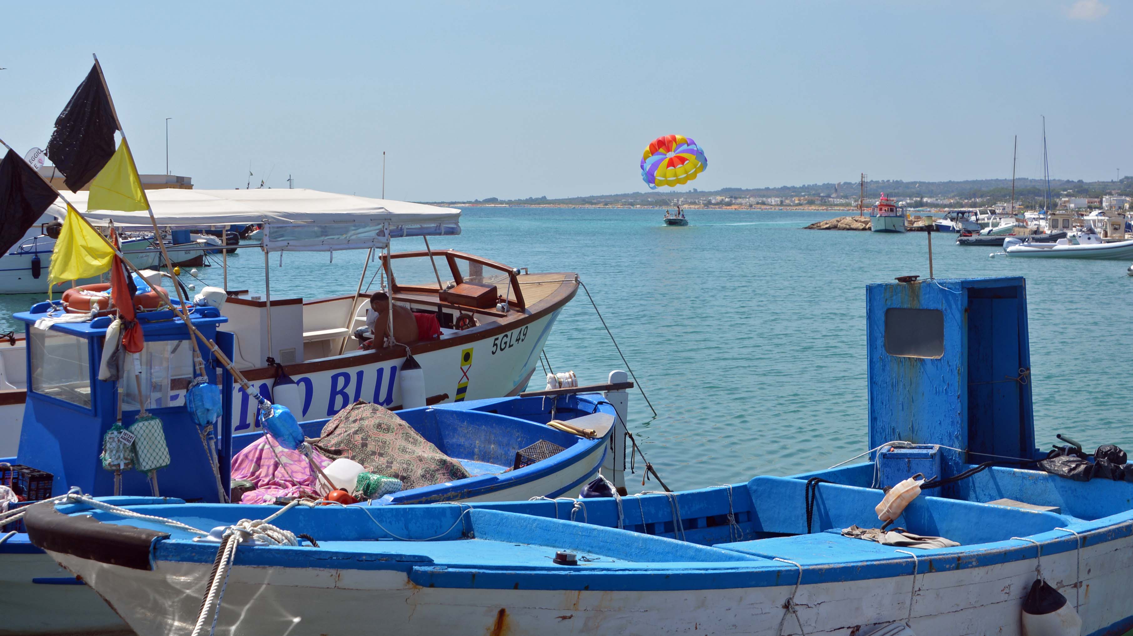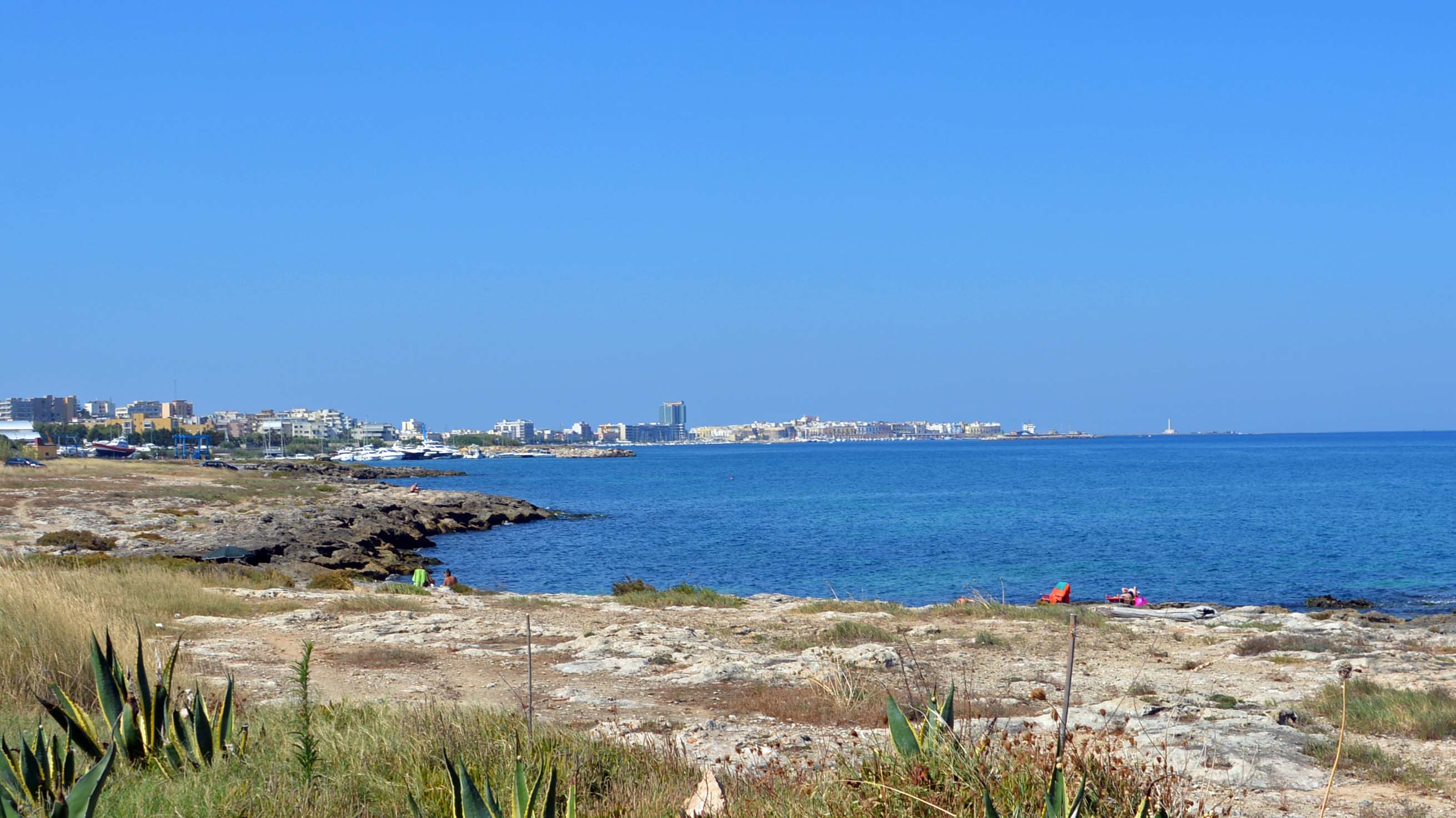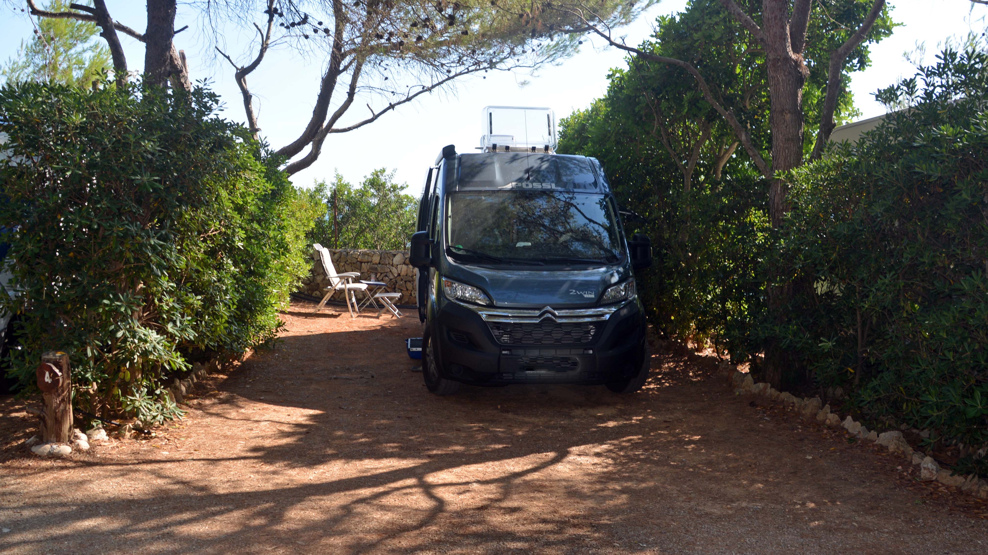 Moin! Trotz sehr warmer Nacht und weit geöffneten Fenstern hab ich gut geschlafen. Muss wohl apathisch und alle Viere von mir gestreckt auf der Matratze verbracht haben. Ich frühstücke mal wieder ordentlich und in aller Ruhe auf der Womo-Terrasse, mache Fiete II startklar und fahre um halbelf mit einem letzten Blick auf die Landzunge von Gallìpolli vecchia in Richtung Supermercato. Dann nehme ich Kurs auf die Litoranea (Küstenstraße). Ziel ist der südlichste Punkt Apuliens, Santa Maria di Léuca.