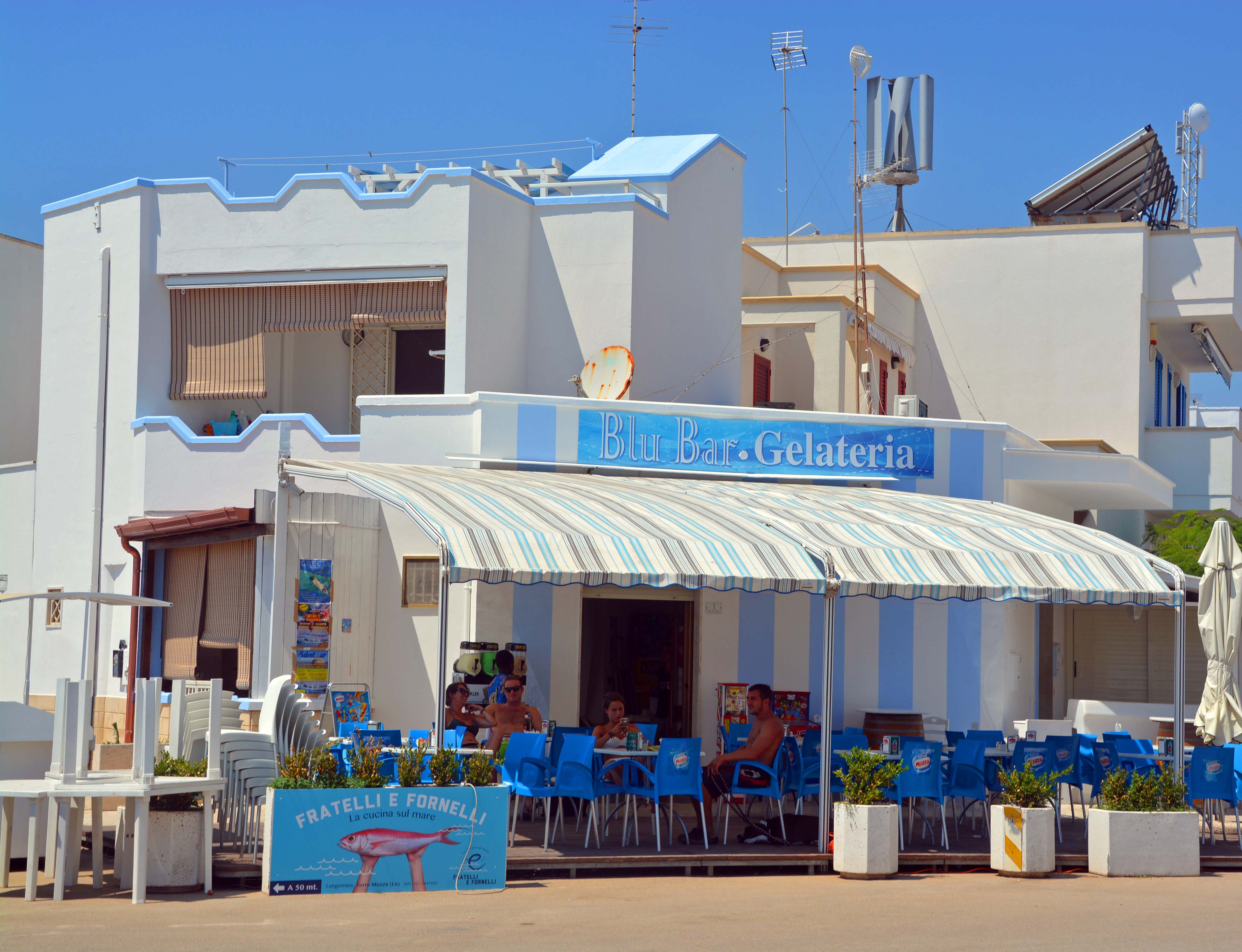 Hole Fiete II von seinem kostenlosen Parkplatz schnell wieder ab und steuere dem nächsten Ort, ‚Torre Mozza‘ entgegen. Und hier ist es richtig schön. Es geht gemütlich zu, der Strand ist klasse und ich entdecke ein fantastisches Strandrestaurant. Das ist voll belegt bis auf einen letzten Platz, den mir Francesco, der Chef, sehr gerne zur Verfügung stellt. Ich habe einen tollen Blick auf’s Meer und genieße ein super Meeresfrüchte-Essen für nur 5 € mehr als gestern Abend! Kurzfristig steigt der Ärger von gestern Abend wieder hoch. Auf dem Rückweg zu Fiete II fragt mich jemand aus dem fahrenden Auto heraus, ob ich Peccorino-Käse kaufen wolle.