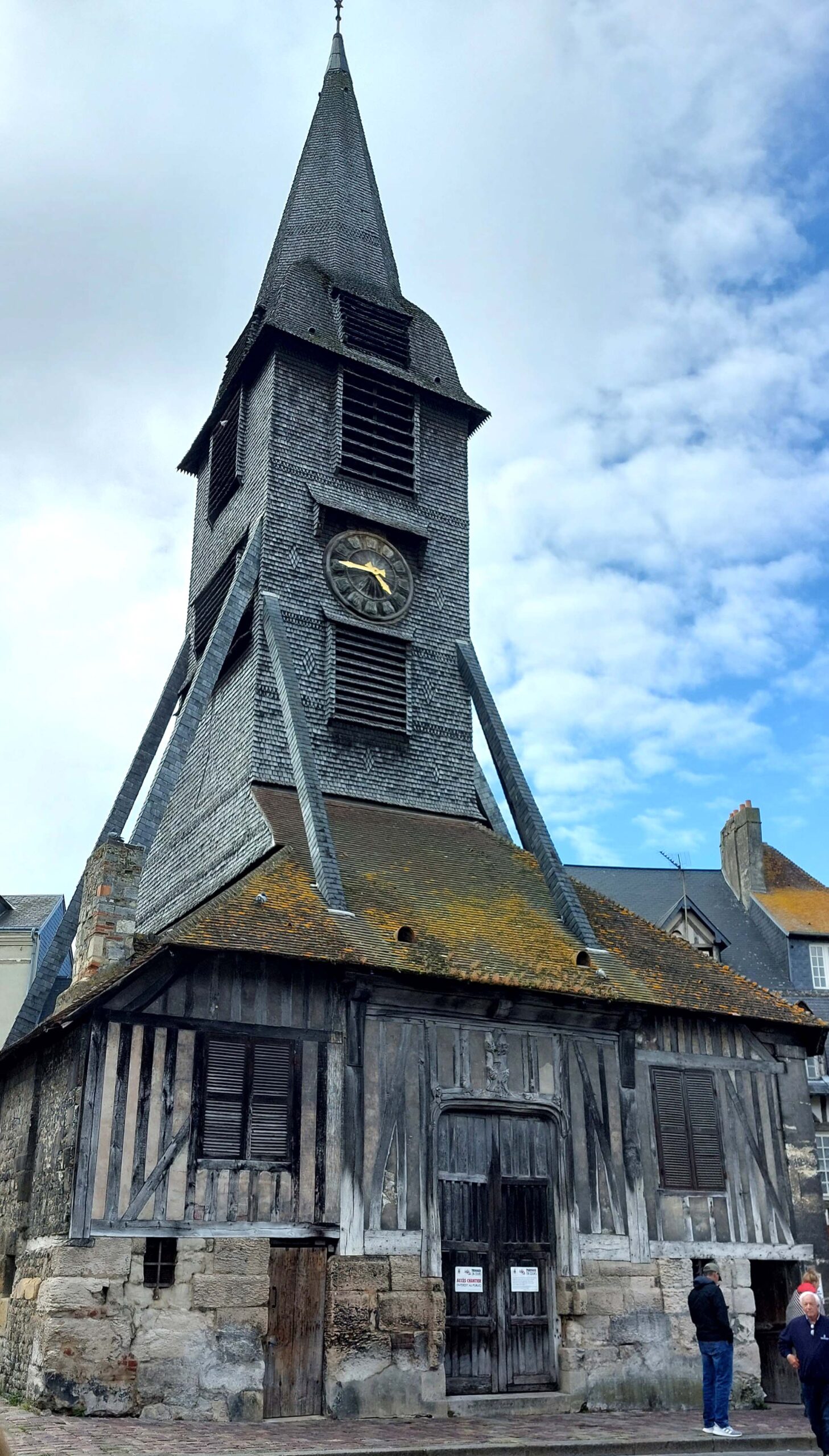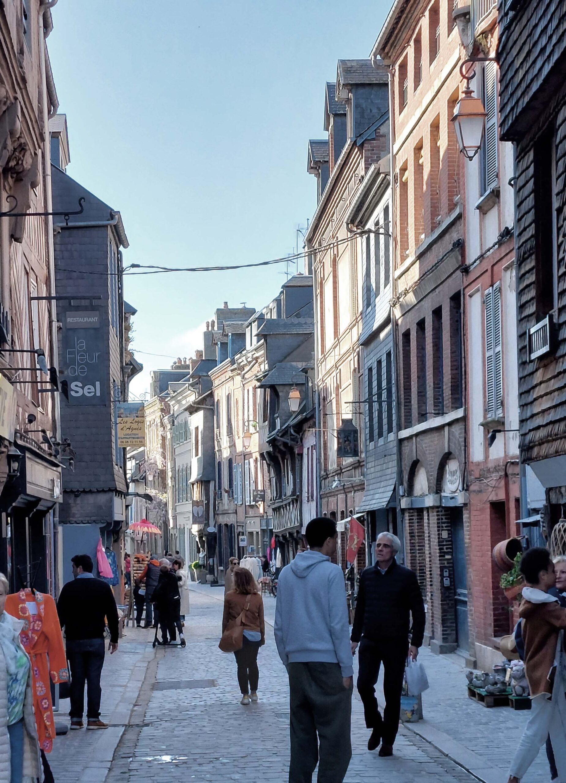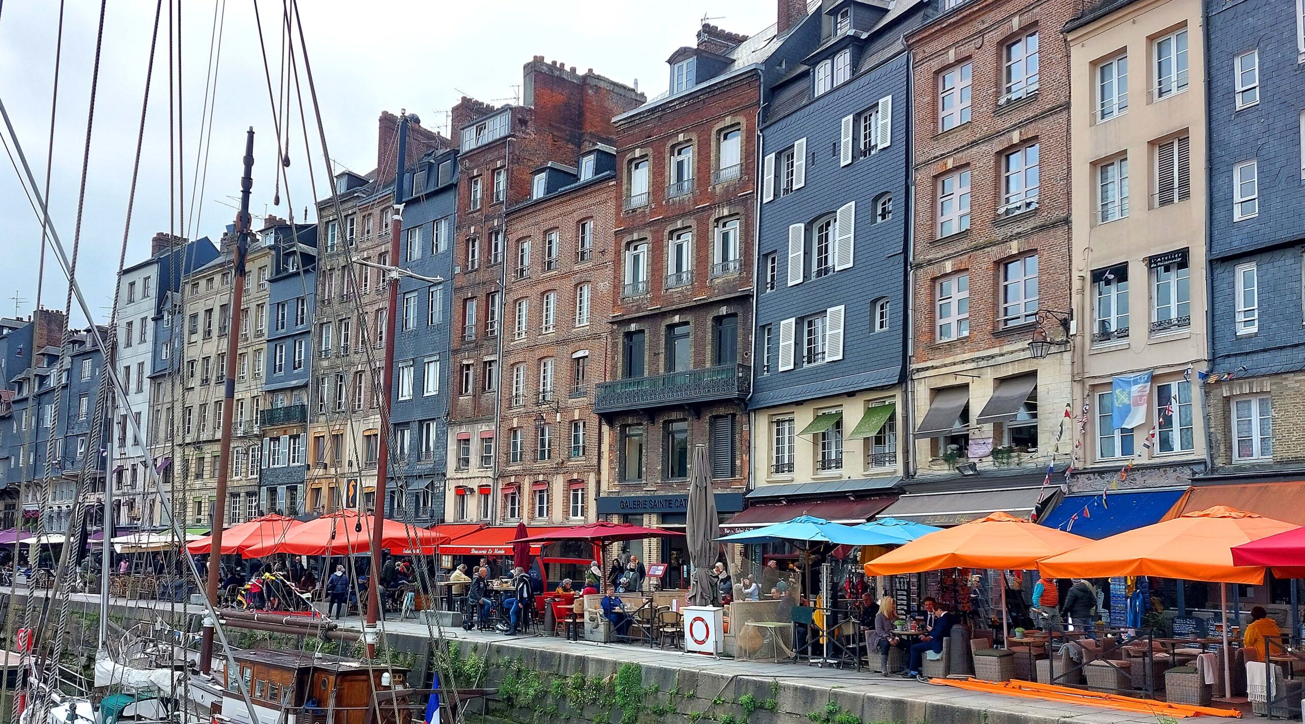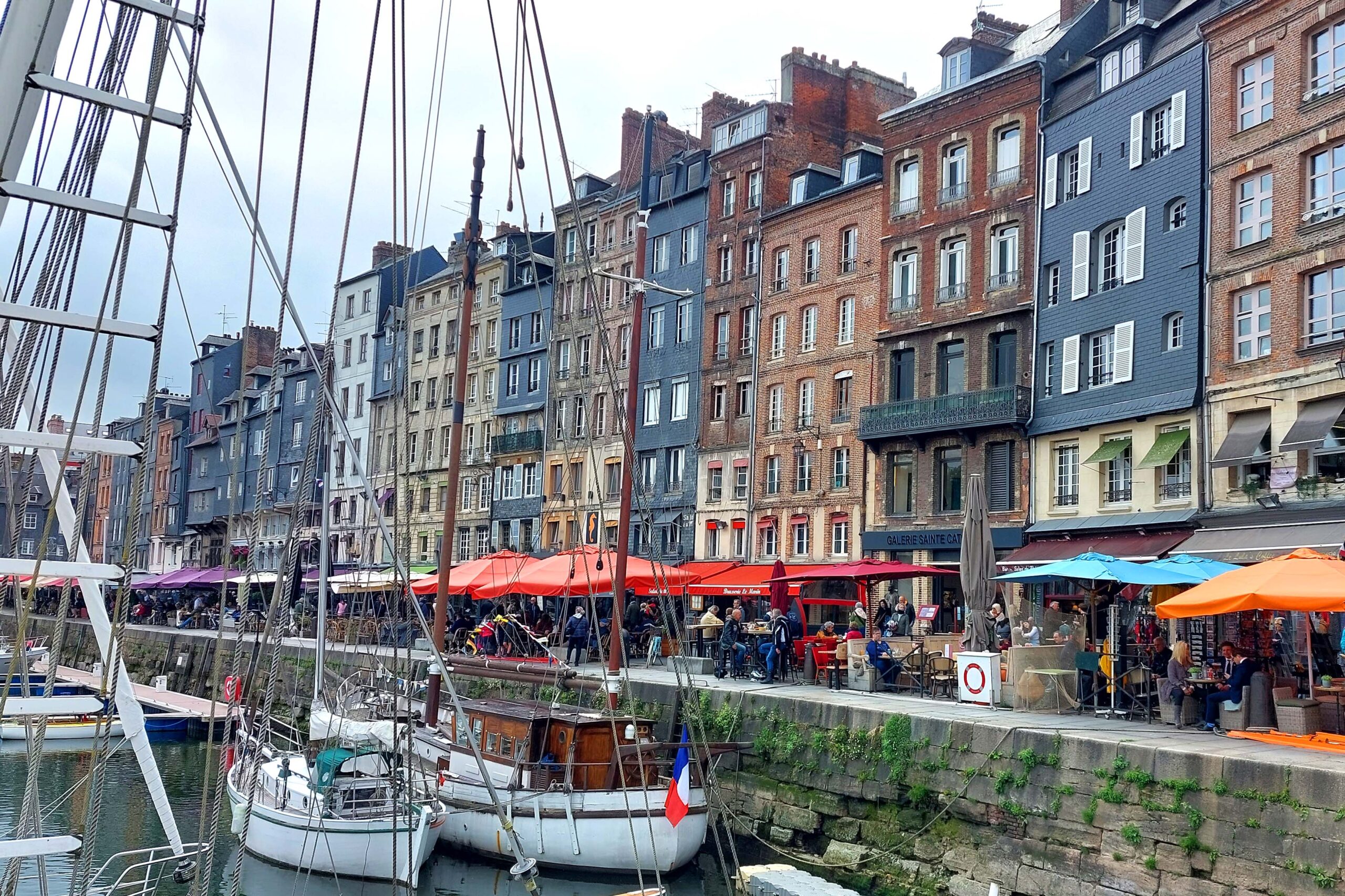 Fast überall laufe ich über Kopfsteinpflaster, vorbei an Bars und Gaststätten in Hülle und Fülle auf dem „Quai Sainte Catherine“. Fast überall gibt es Calvados-Läden und Caramel/Schokoladen-Shops. Es ist Maifest neben dem Porte de Caen, Teil des alten Stadttores. Hier nutze ich die Gelegenheit, um Austern und Wein zu schlürfen. Gegenüber liegt am Hafeneingang das älteste Gebäude der Stadt, das La Lieutenance. Und auf dem Weg zurück komme ich am über 760 Jahre alten Glockenturm von St.Catherine vorbei, der größten Holzkirche Frankreichs.