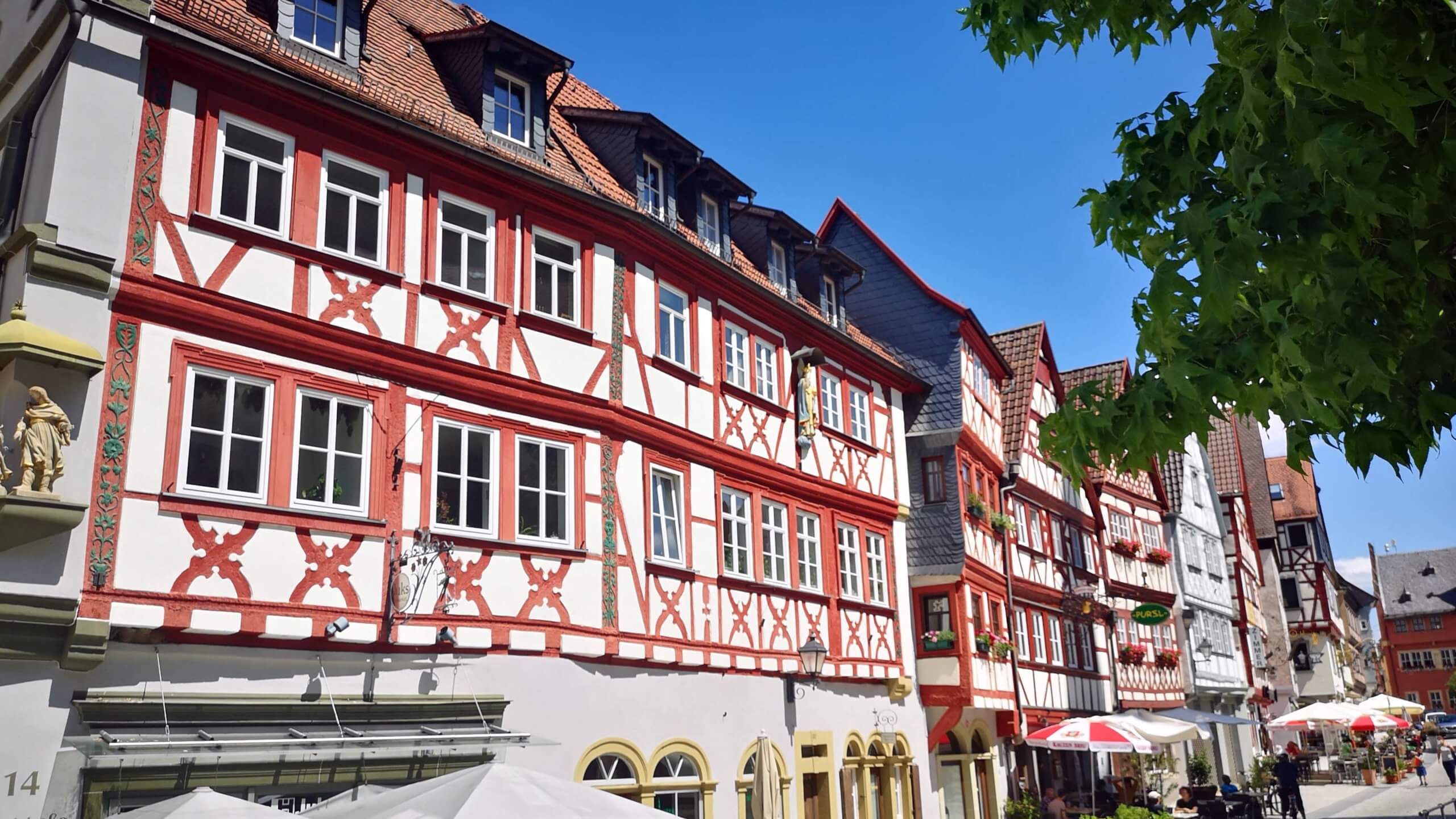 In ‚Ochsenfurt‘ schlendere ich durch die historische Altstadt, die fast vollständig von einer Befestigungsanlage eingerahmt ist. Das Neue Rathaus (1497) hat einen traumhaften Lanzenturm und die Stadtpfarrkirche St. Andreas ein beeindruckendes Kirchenschiff. Am besten aber gefällt mir die prachtvolle Fachwerkzeile.