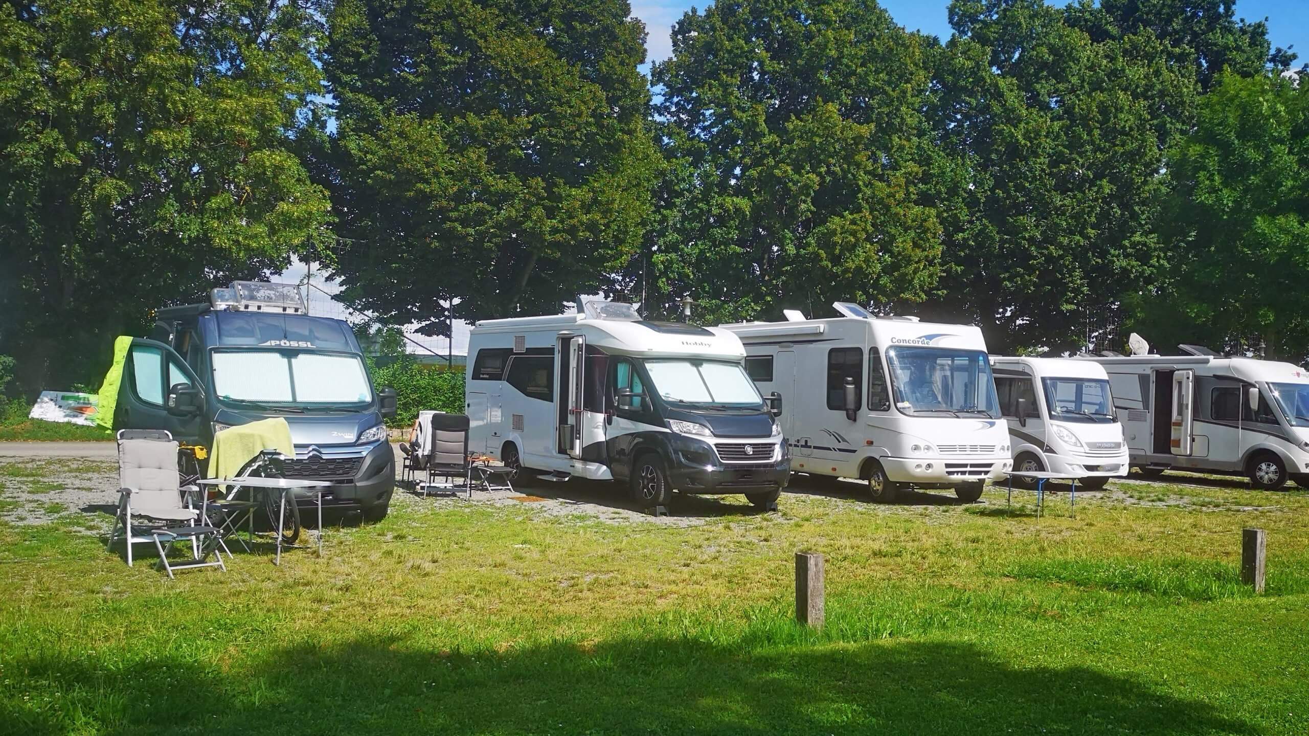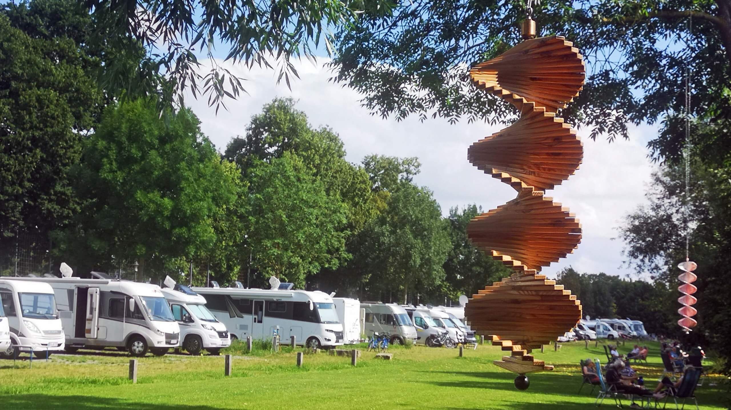 Direkt vor den Stellplätzen gibt es eine riesengroße Wiese. Manche Bäume sind mit Windspielen geschmückt. Ich hole meinen Stuhl aus dem Kofferraum, setze mich in die Sonne, atme durch und stelle zufrieden fest, dass ich die richtige Entscheidung getroffen habe. Kann es kaum glauben: Es ist warmes sonniges Wetter.