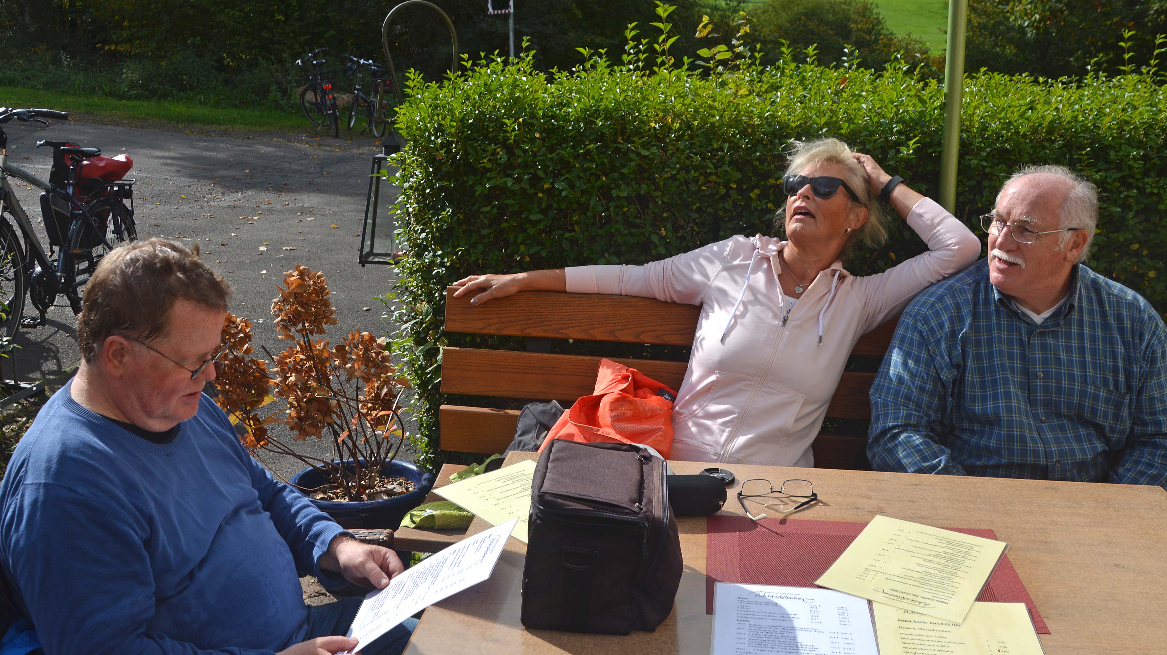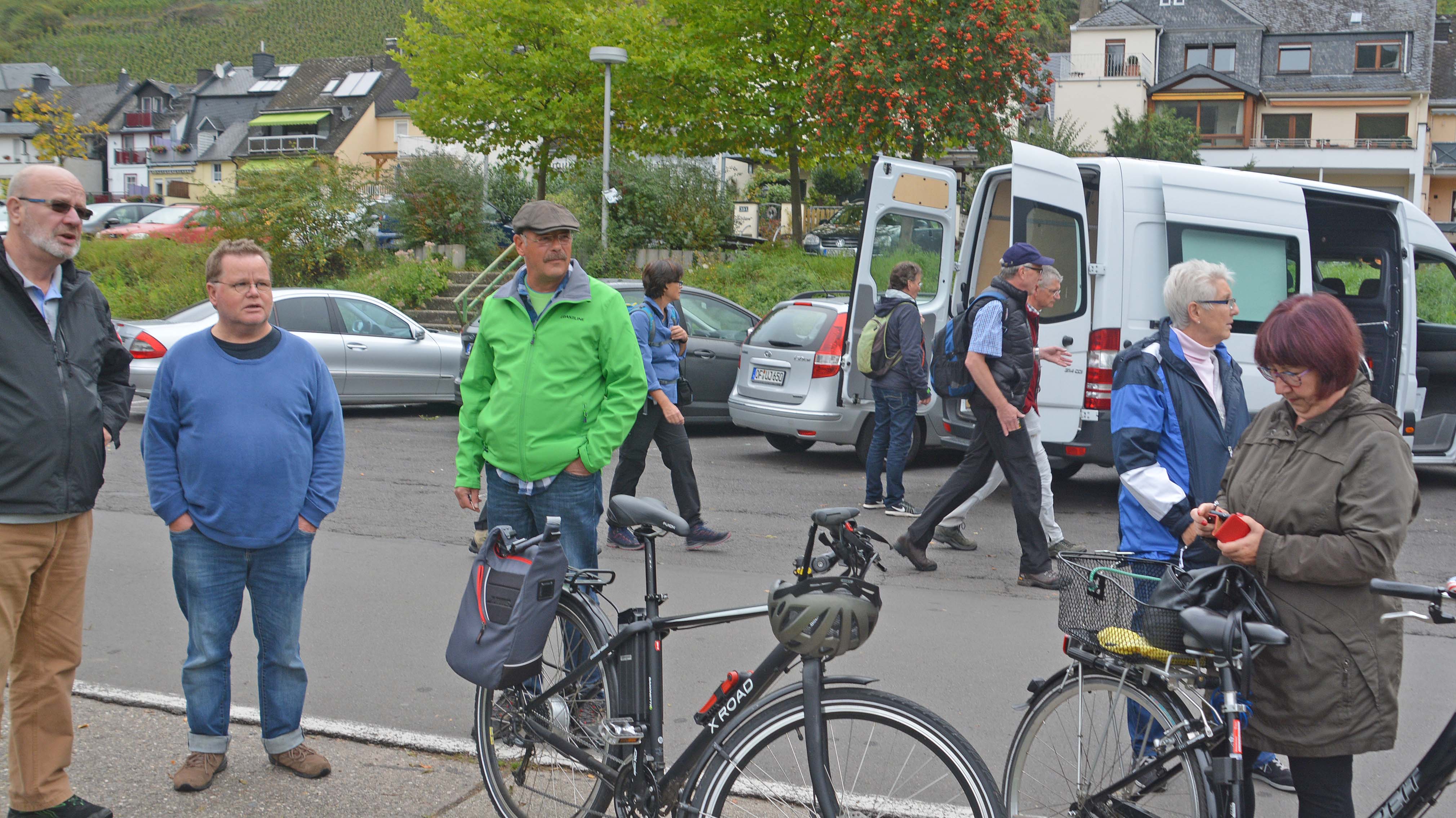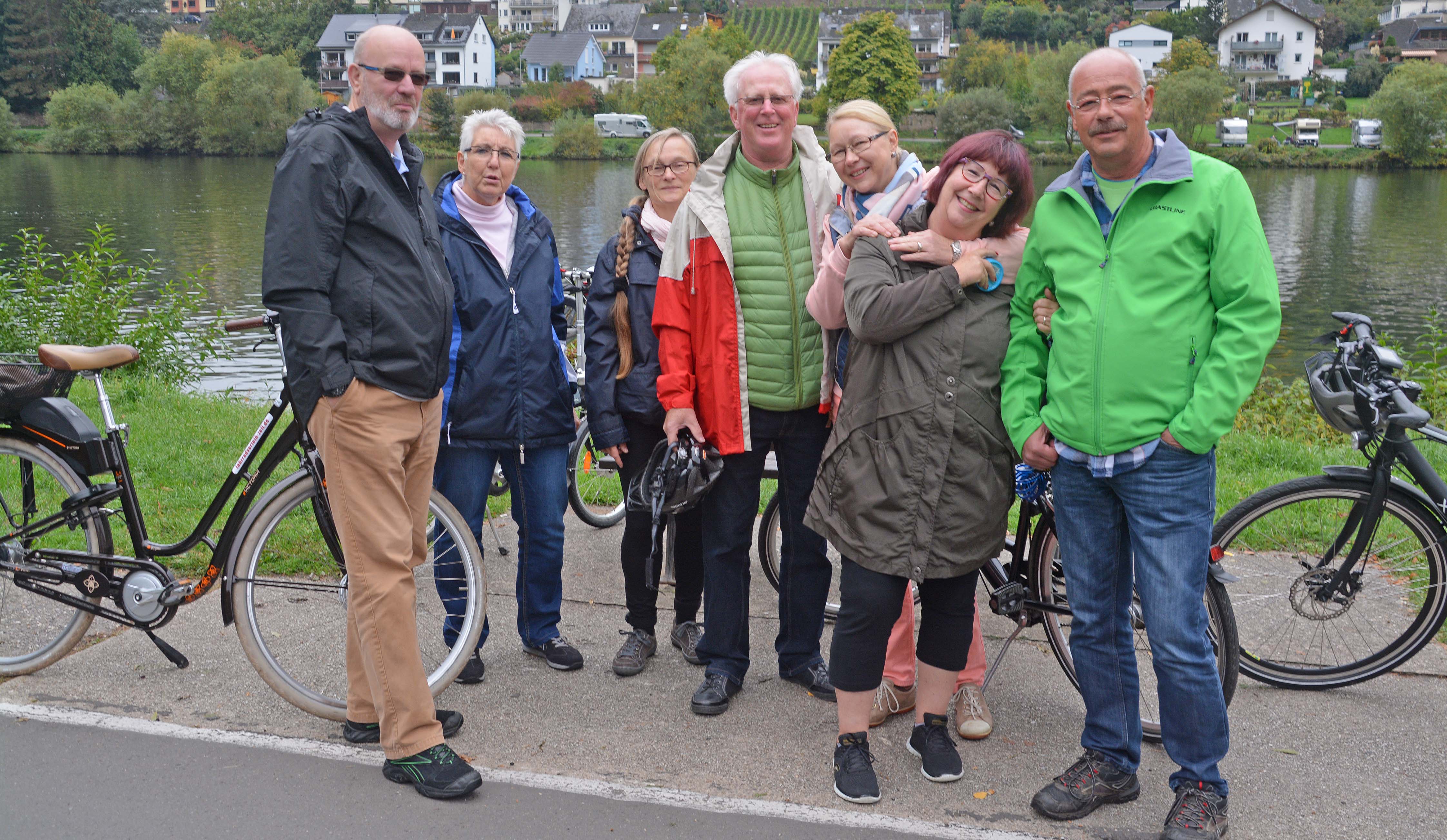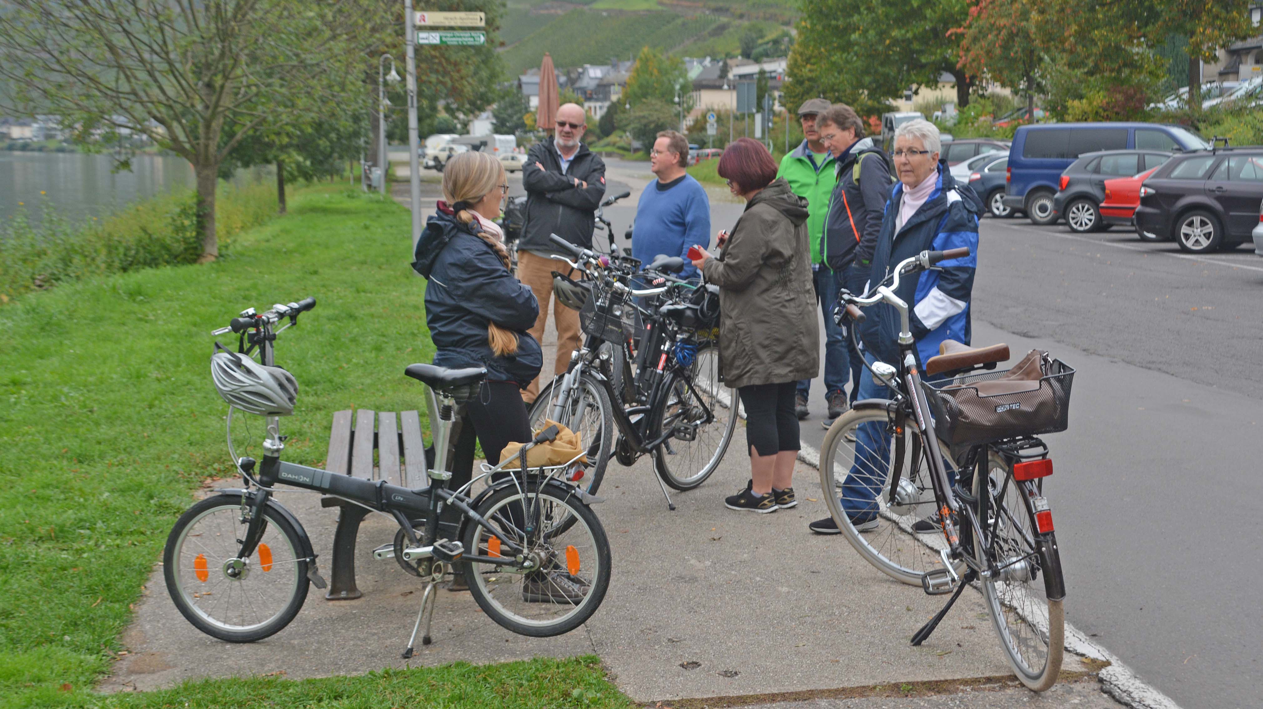 Rad fahren ist angesagt. Für die Maare-Mosel-Tour von Daun nach Wittlich entscheiden sich Thomas, Gerhard, Jo, Klaus und die Frauenquote Ingrid. Die zweite Gruppe mit Gitti, Ute, Gabi, Michael, Micha, Ursula und Eberhard fährt zu den steilsten Riesling-Terrassen an der Mosel nach Bremm. Und Helga und Kurt……., die fahren zurück nach Frankfurt.