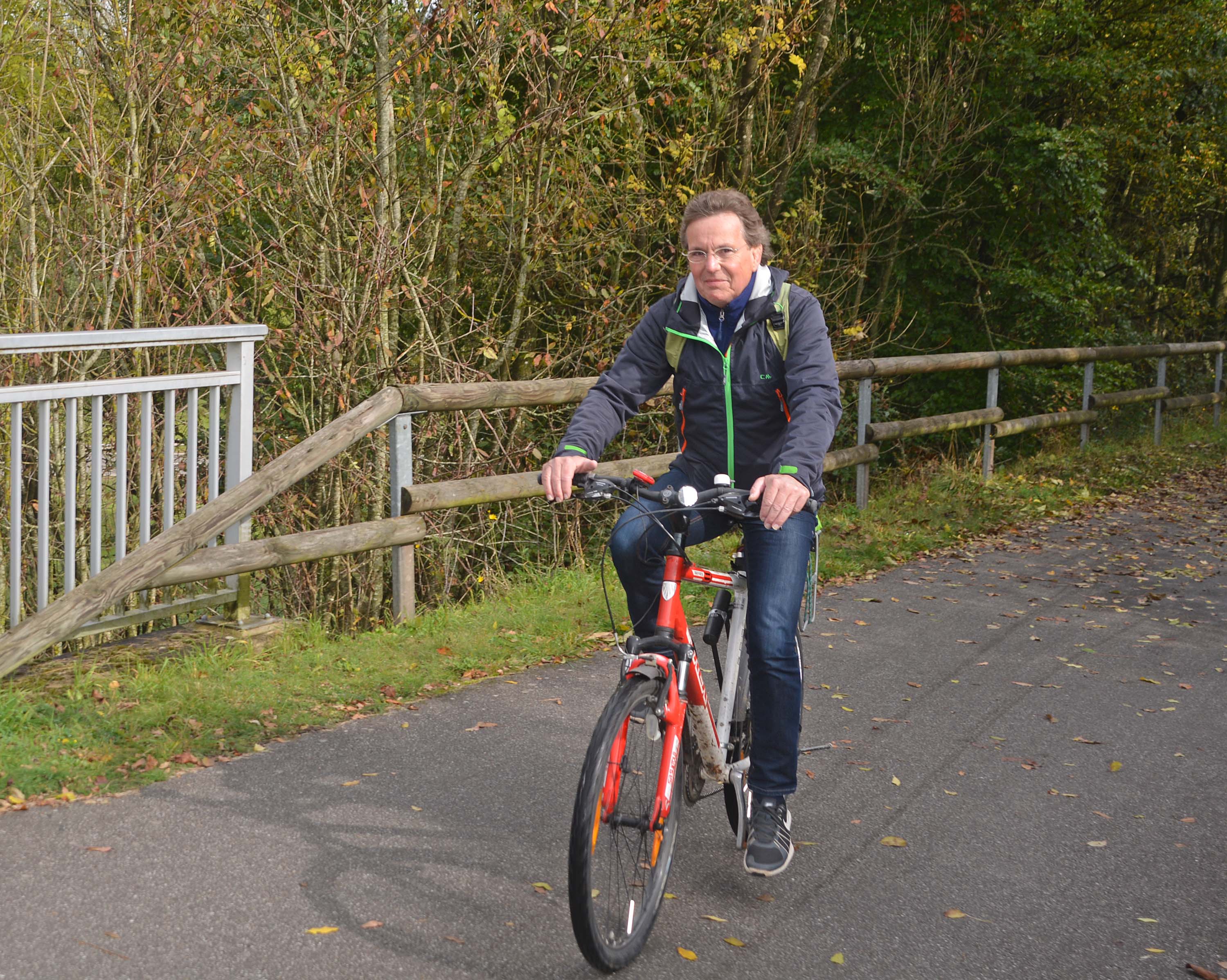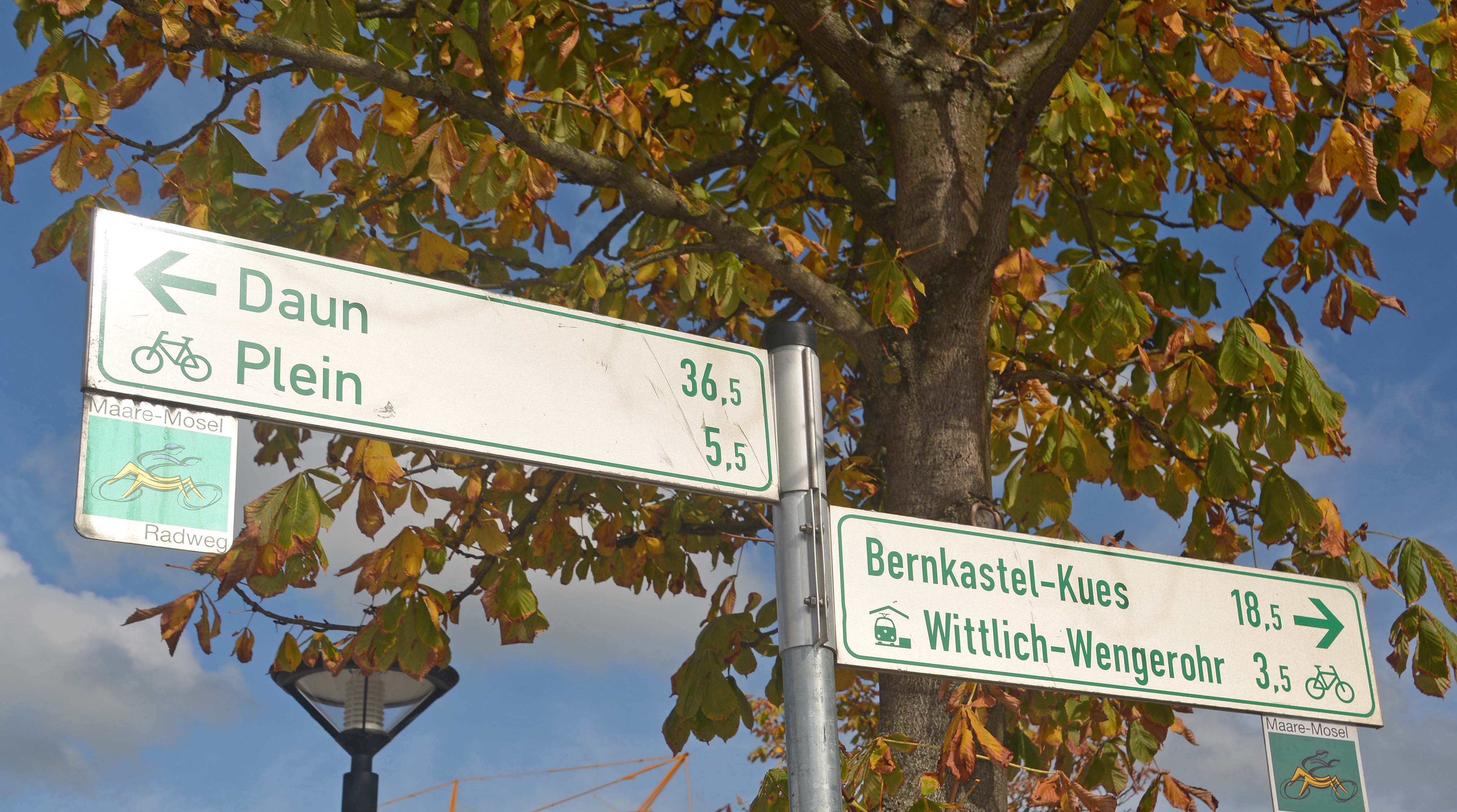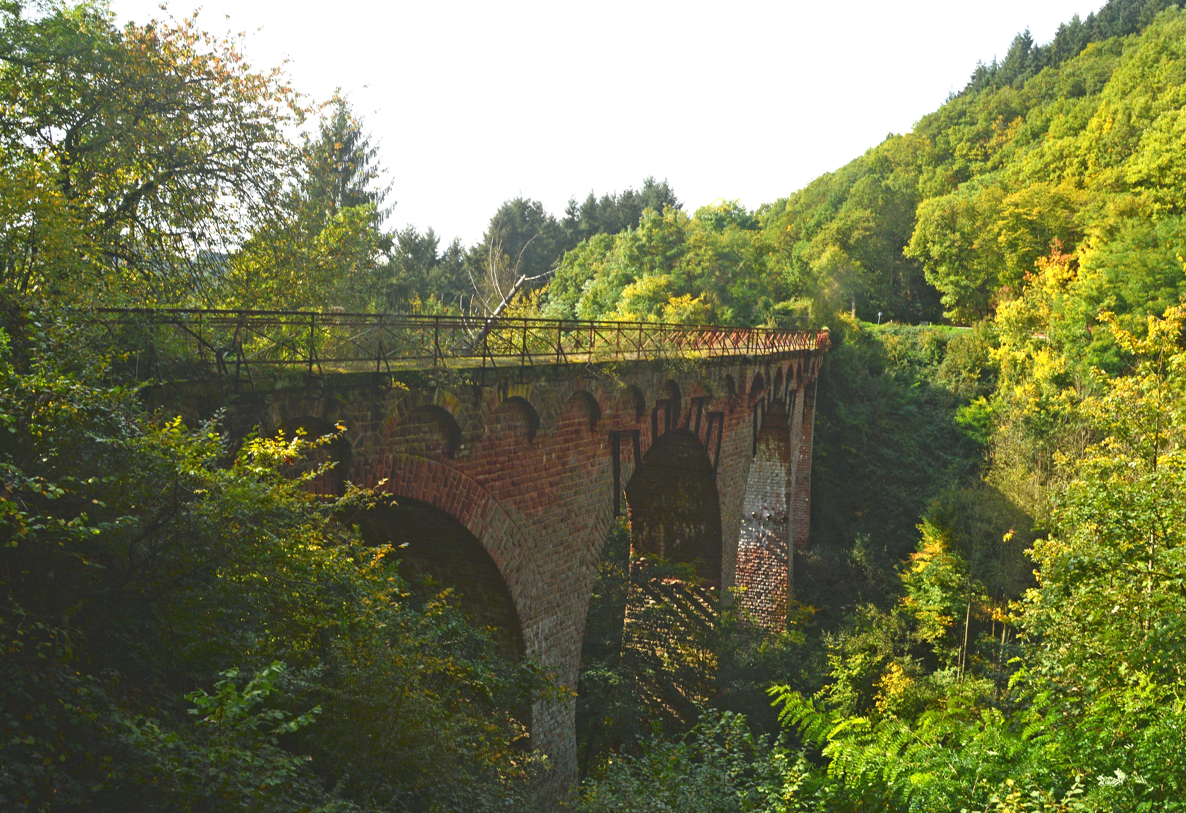 Der Maare-Mosel-Radweg wirbt zu Recht mit dem Slogan „ Das pure Radvergnügen für Jung und Alt“, denn er zählt zu den bekanntesten und schönsten Bahntrassen-Radwegen in Deutschland. Dort, wo früher Züge schnauften, radeln wir 35 von insgesamt 55 Kilometern auf der stillgelegten Bahntrasse. Wir fahren über gewaltige Viadukte, durch wunderschöne Landschaftsgebiete, lange, beleuchtete Tunnel und in Sichtweite an einem Maar vorbei. Den Tunnel ‚Großes Schlitzohr‘ durchfahren wir gleich zu Beginn. Es geht weiter bis Gillenfeld, dann hügelig bis Laufeld und abwärts nach Plein. Die regennassen Bäume schimmern in bunten Farben und es duftet Herbst. Die Sonne kämpft sich immer mehr durch und verbreitet diffuses Licht. Die stetigen Steigungen zu Beginn bewältige ich gut, nur bei der einzigen kräftigen Steigung bummelt sich meine Schaltung auf. Klaus repariert und es läuft wieder. Wir genießen die Fahrt.