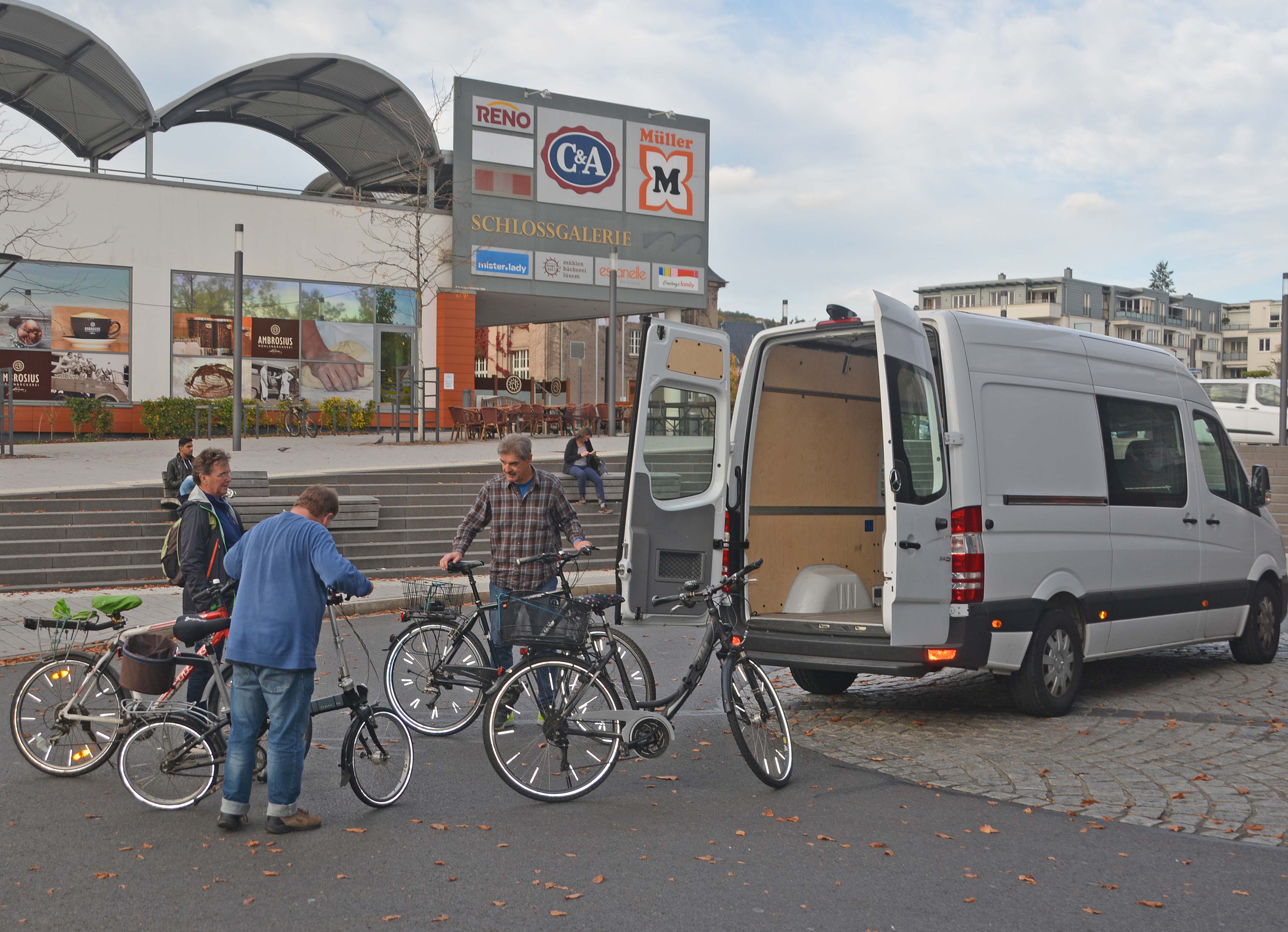 Gerhard verzurrt die Räder für die Eifel-Tourer im MC-Sprinter. Die Bremm-Gruppe startet zeitgleich. Eine Stunde später ist die Fünfer-Gruppe im Heilkurort Daun (400 Meter) in der Vulkaneifel und wird von einem Trödelmarkt empfangen.