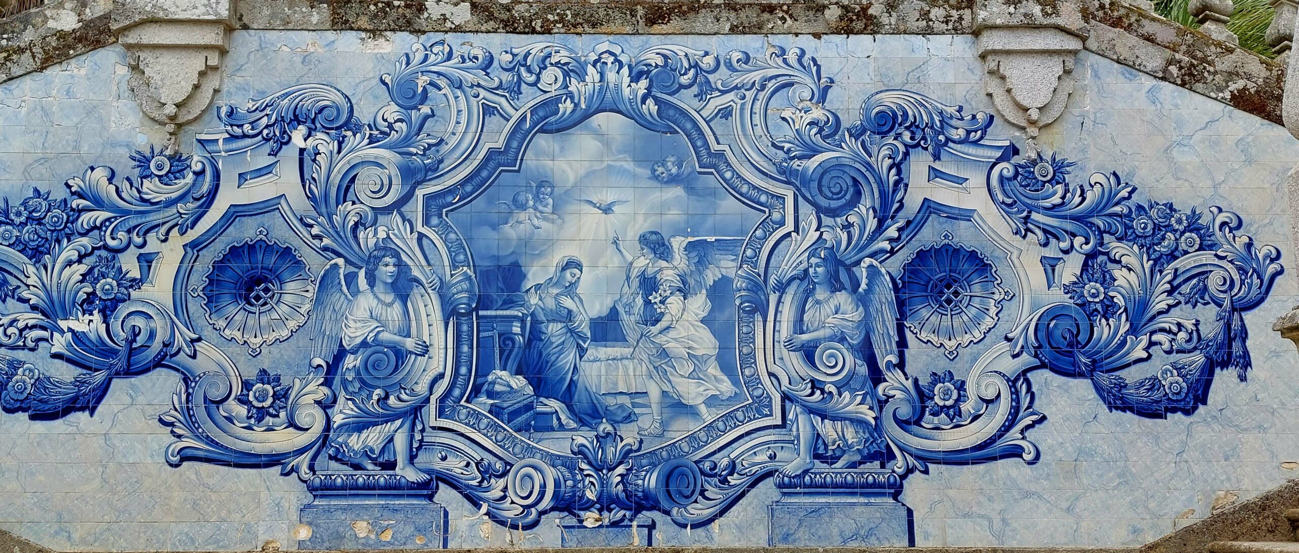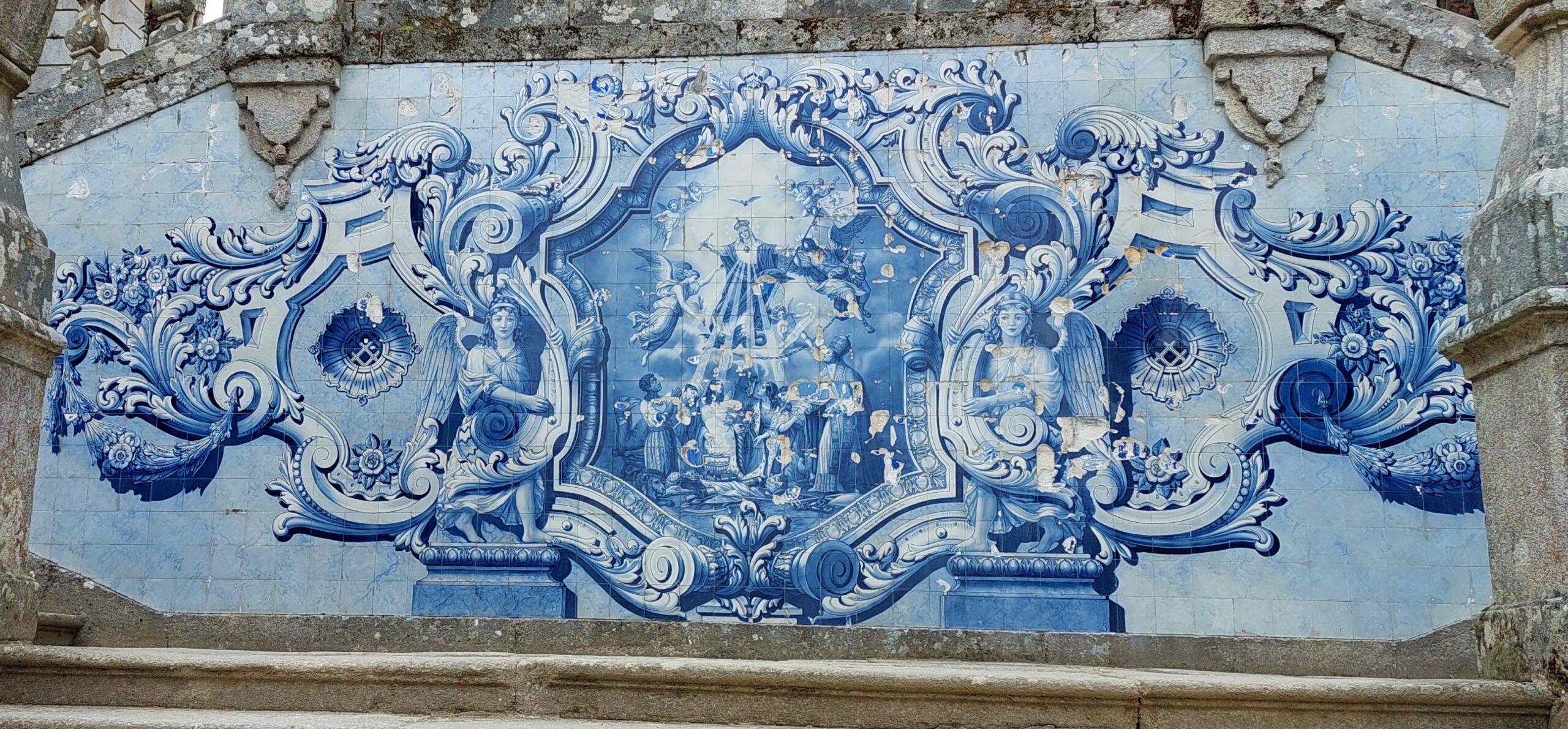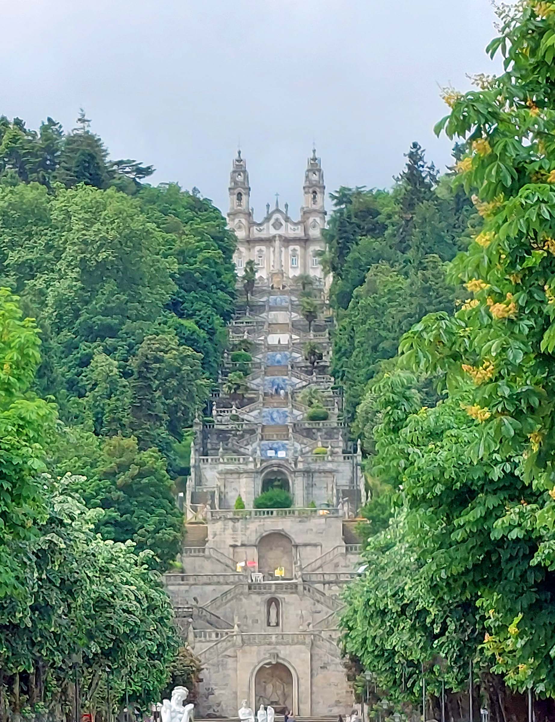 Dummerweise gibt es derzeit eine große Baustelle, so dass ich von der eindrucksvollen Freitreppe zur Kirche ‚nur‘ 512 von 686 Stufen erklimmen kann. Der Aufstieg führt mitten durch den dichten Wald des Parks Santo Estevao. Auf den neun Absätzen des barocken Treppenaufgangs bestaune ich vor allem die fantastischen Fliesenmosaike aus den typischen blau-weißen Azulejos.