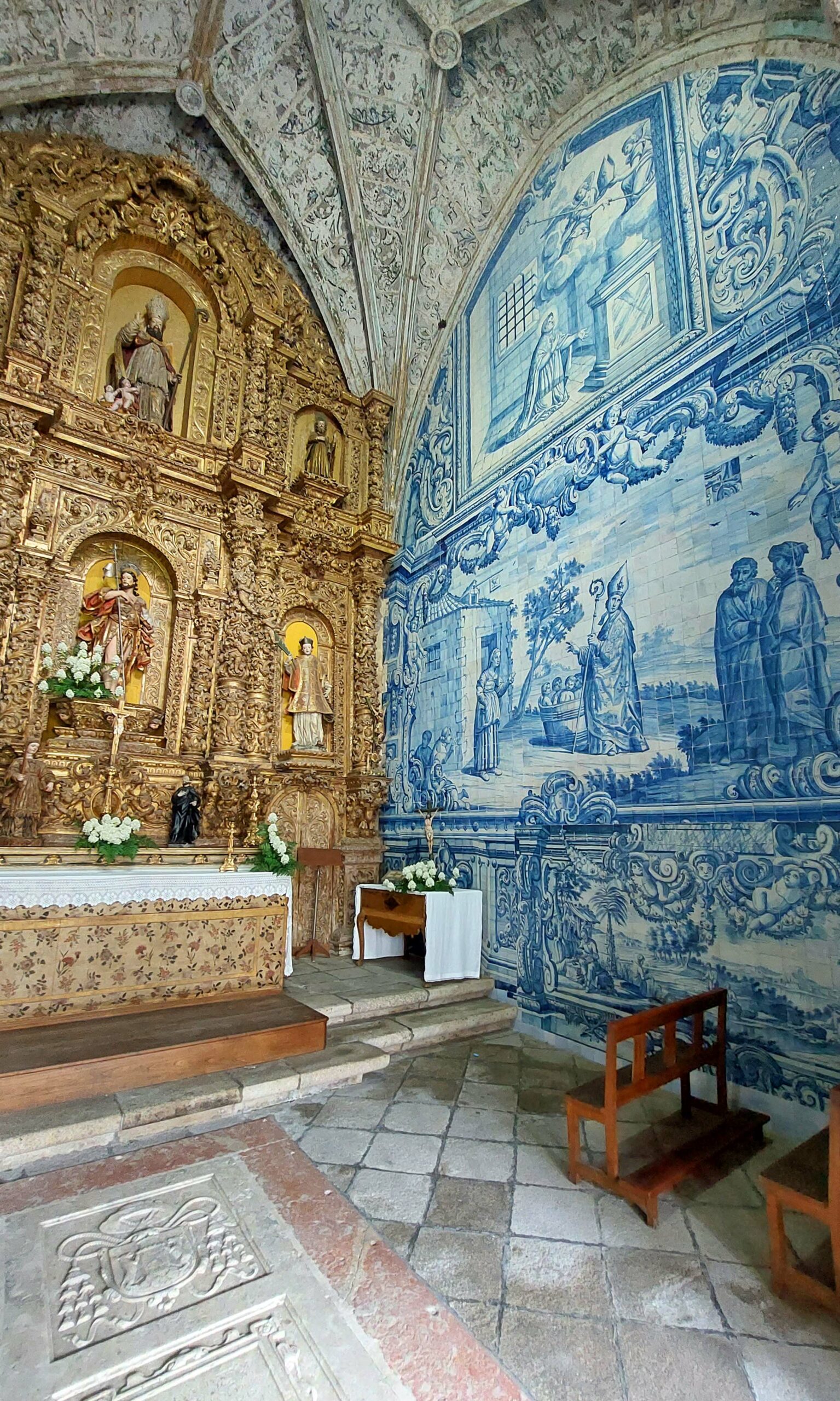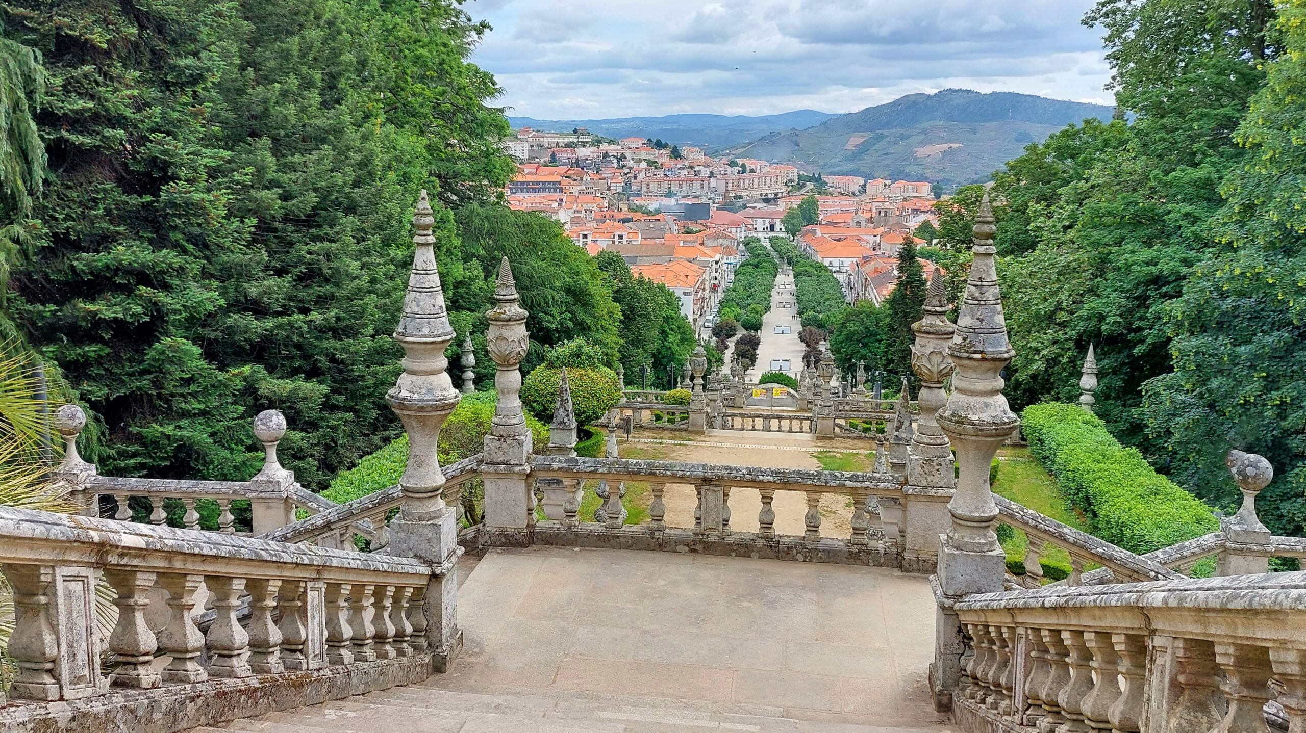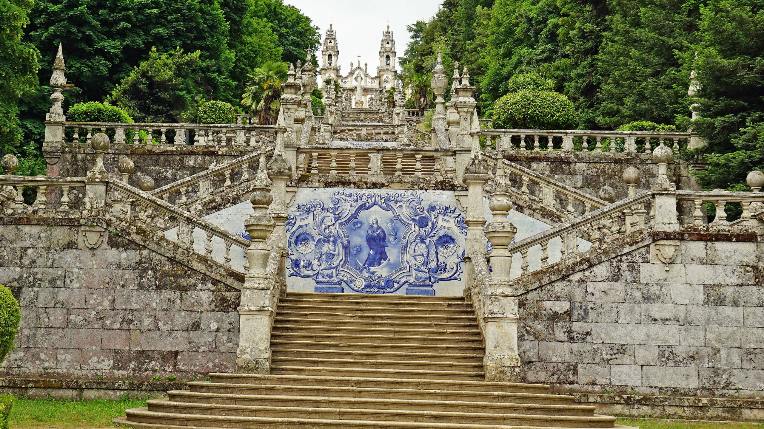 Dummerweise gibt es derzeit eine große Baustelle, so dass ich von der eindrucksvollen Freitreppe zur Kirche ‚nur‘ 512 von 686 Stufen erklimmen kann. Der Aufstieg führt mitten durch den dichten Wald des Parks Santo Estevao. Auf den neun Absätzen des barocken Treppenaufgangs bestaune ich vor allem die fantastischen Fliesenmosaike aus den typischen blau-weißen Azulejos.