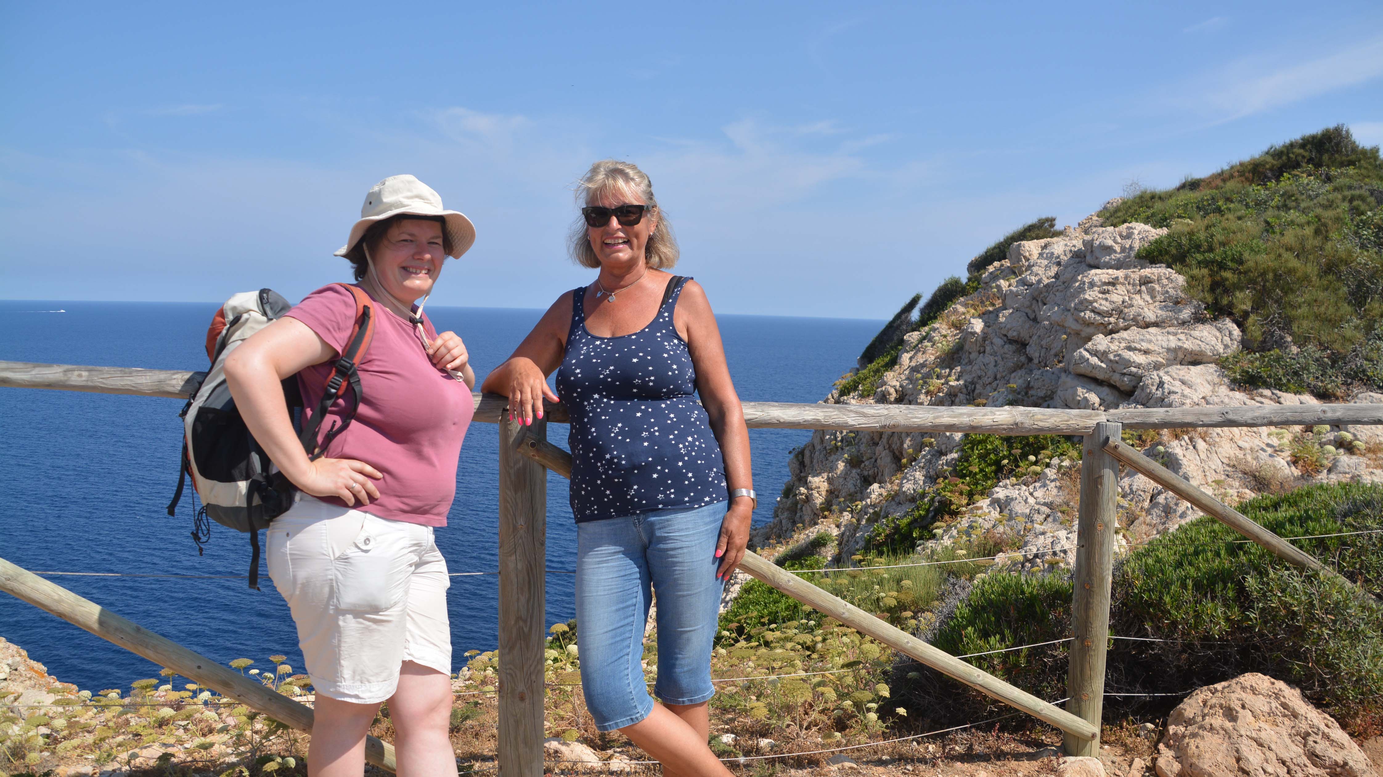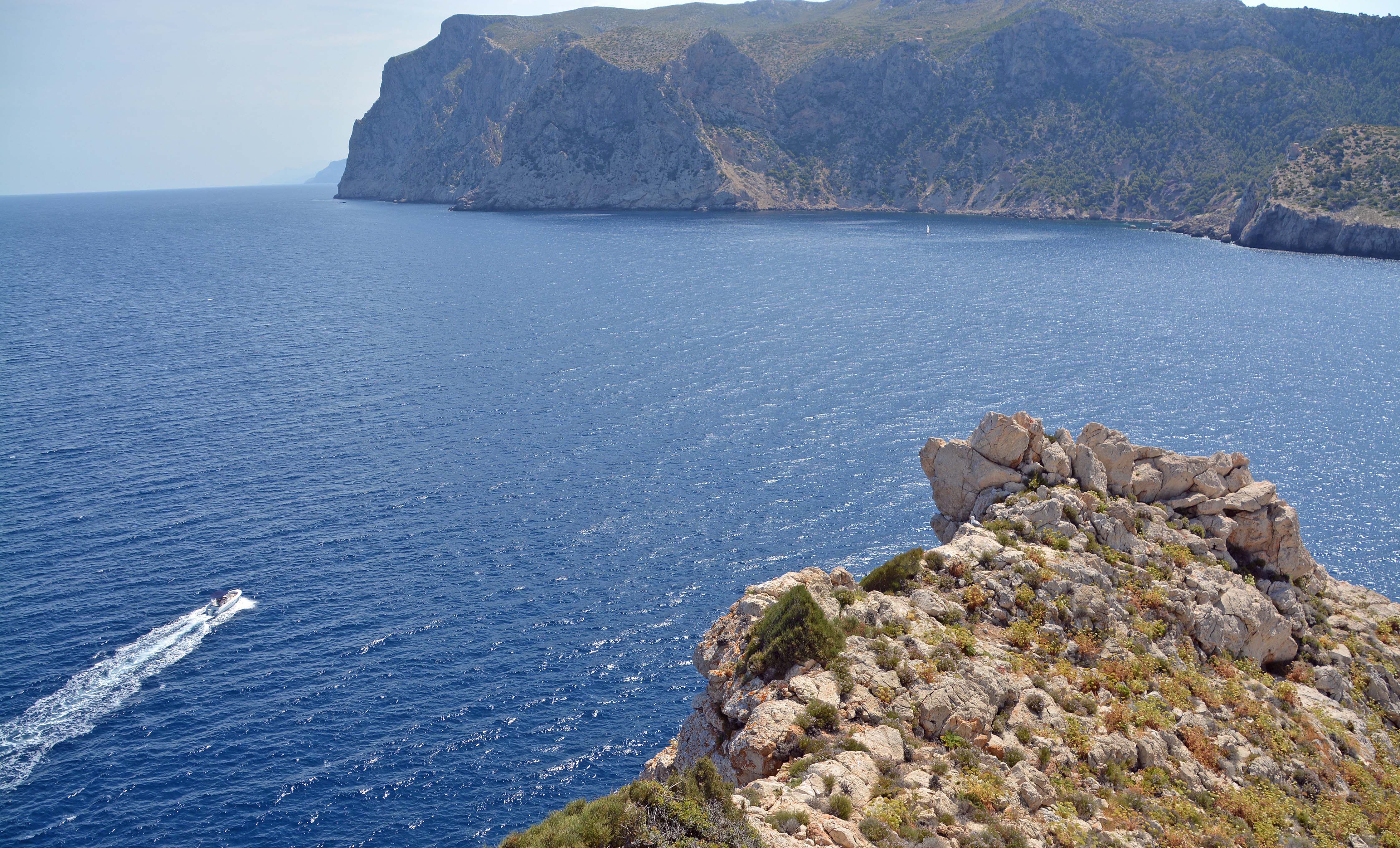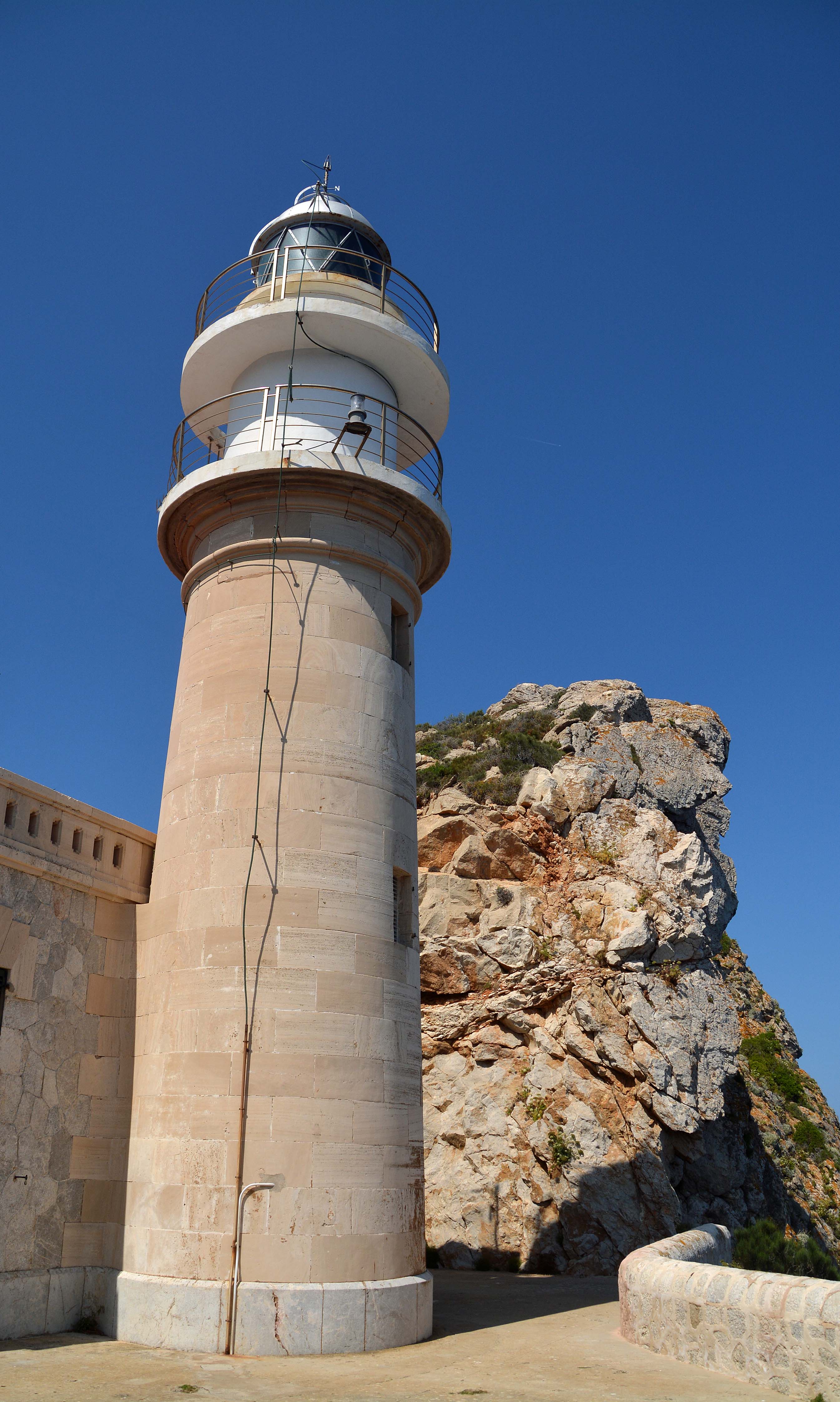 Wir entscheiden uns für Wander-Route 2 zum Leuchtturm am Cap de Tramuntana. Der steinige, aber breite Weg eröffnet uns herrliche Ausblicke auf die gegenüberliegende Steilküste, das sagenhaft tiefblaue Meer und die schaukelnden klitzeklein wirkenden Segelboote und Yachten. Meist haben wir den Weg für uns allein, für ‚echte Touris‘ ist es einfach noch früh.