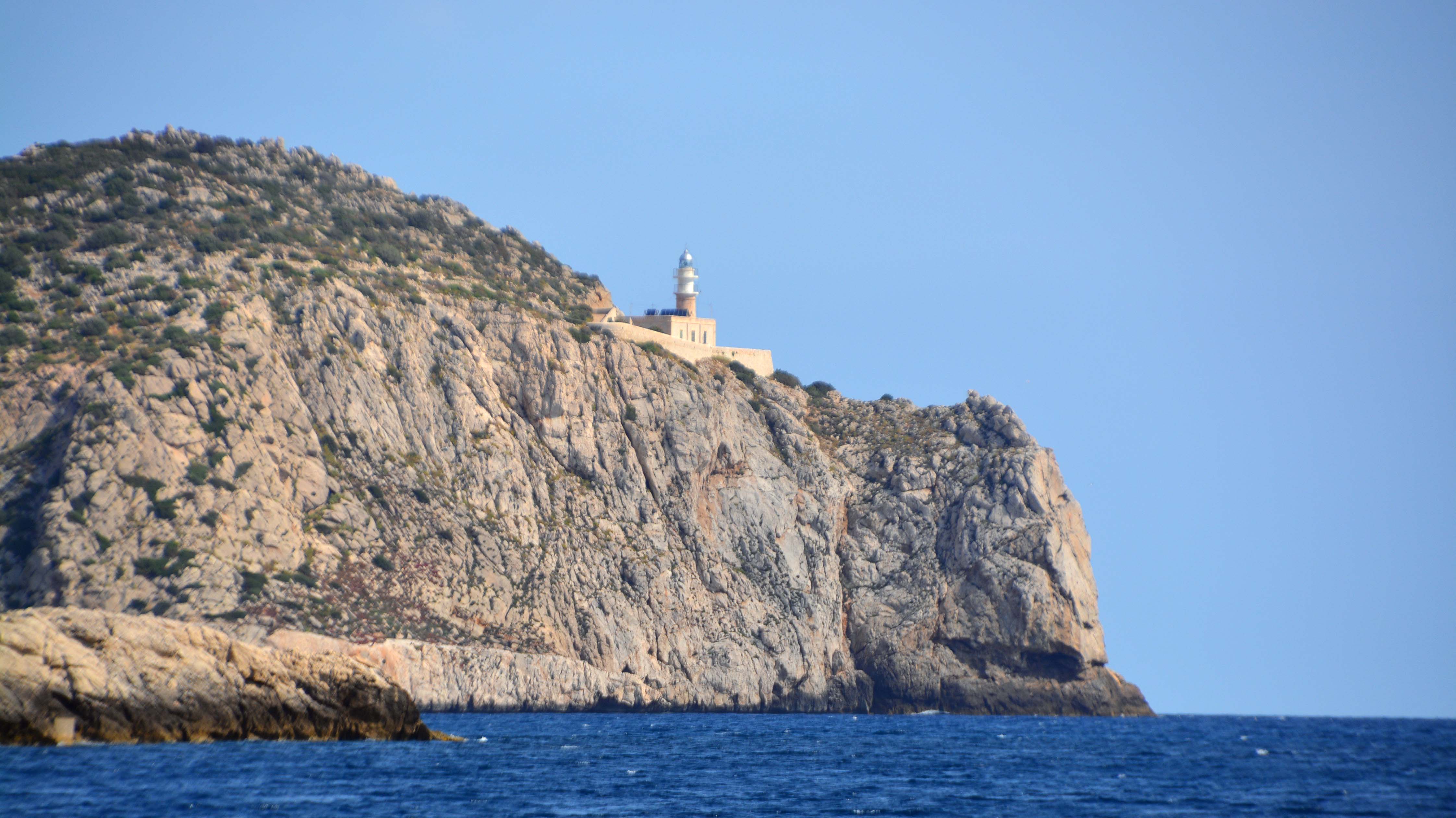 Erstaunlicherweise gibt es hier auch Zwergohreulen, meine Lieblingseule. Ihre Rufe haben mich schon auf zahlreichen Urlauben begleitet. Heute allerdings hören wir sie nicht. Dafür aber das ununterbrochene Kreischen der ‚gemeinen Mittelmeermöven‘. Sie kreisen unermüdlich um das steile Cap, so dass wir befürchten, Opfer ihrer Scheißerei zu werden. Am Leuchtturm haben wir einen tollen Blick auf die Cala en Basset und die Steilküste von Mallorca.
