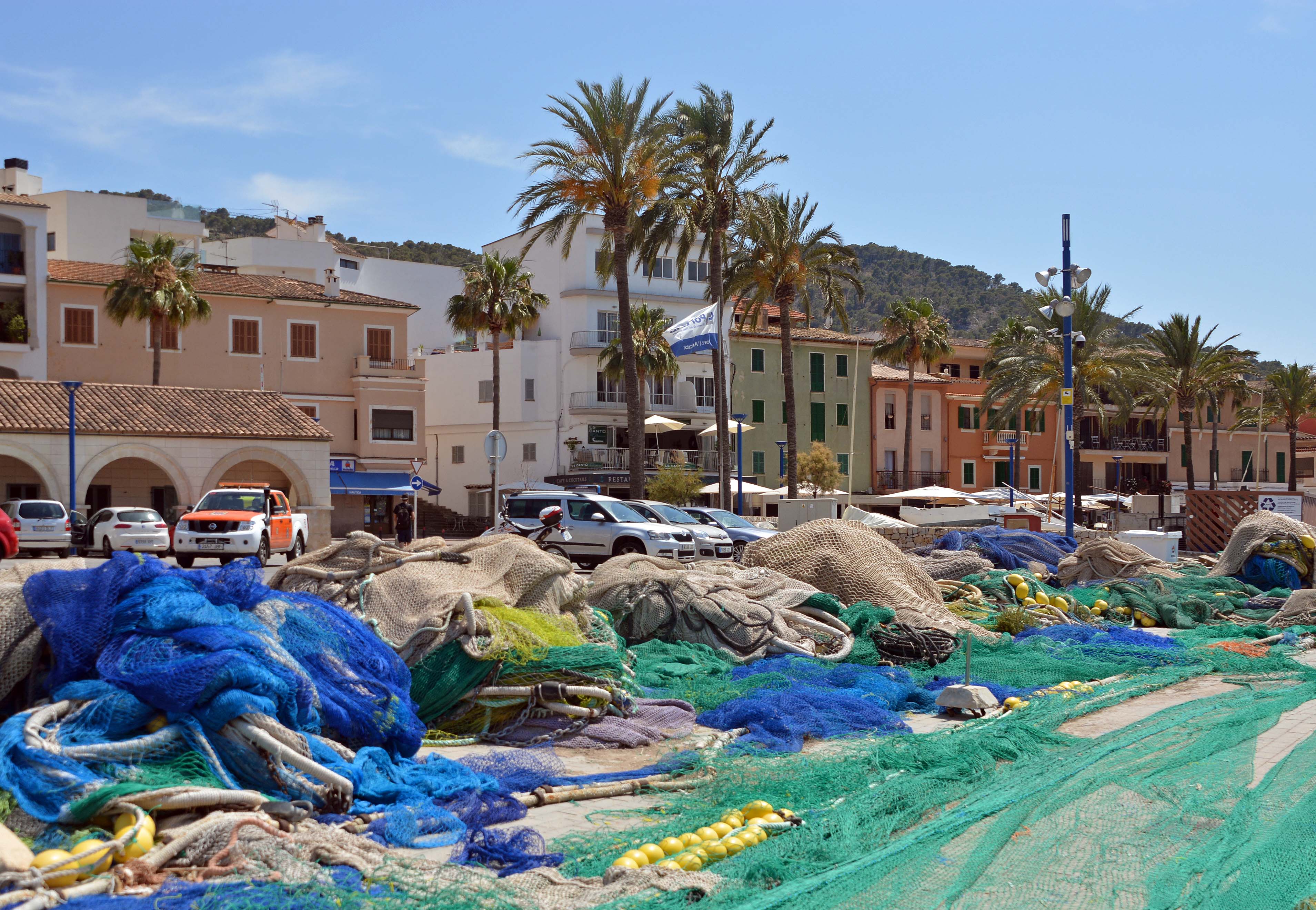 Jetzt knurren die Mägen. Wir suchen ein Restaurant, in dem wir ein letztes Mal mallorquinisch essen können. Die Lokale am Hafen haben stolze Preise für ihre Fisch- und Meeresfrüchte. Der echsenfreie Blick auf Sa Dragonera hat seinen Preis.
