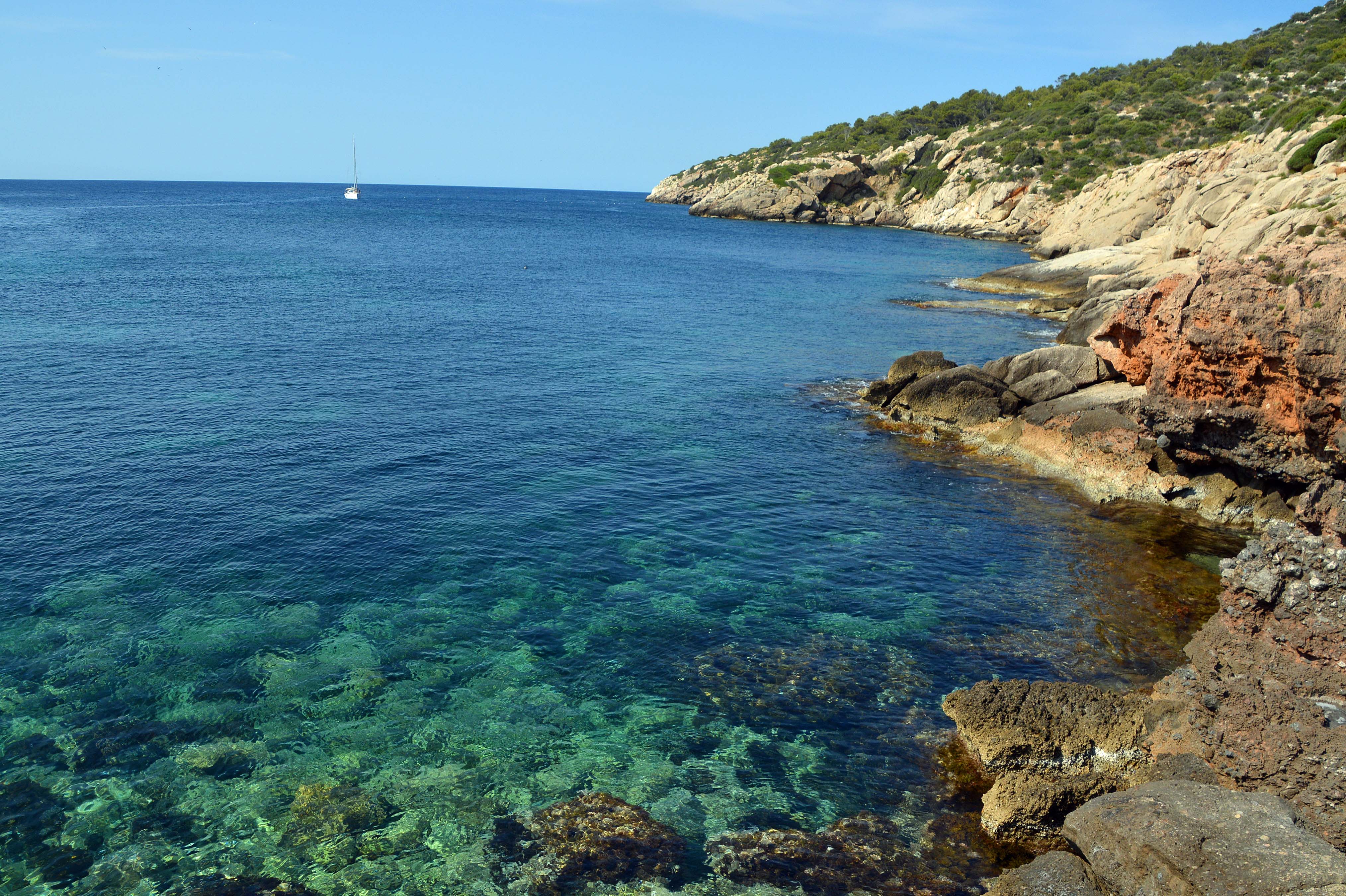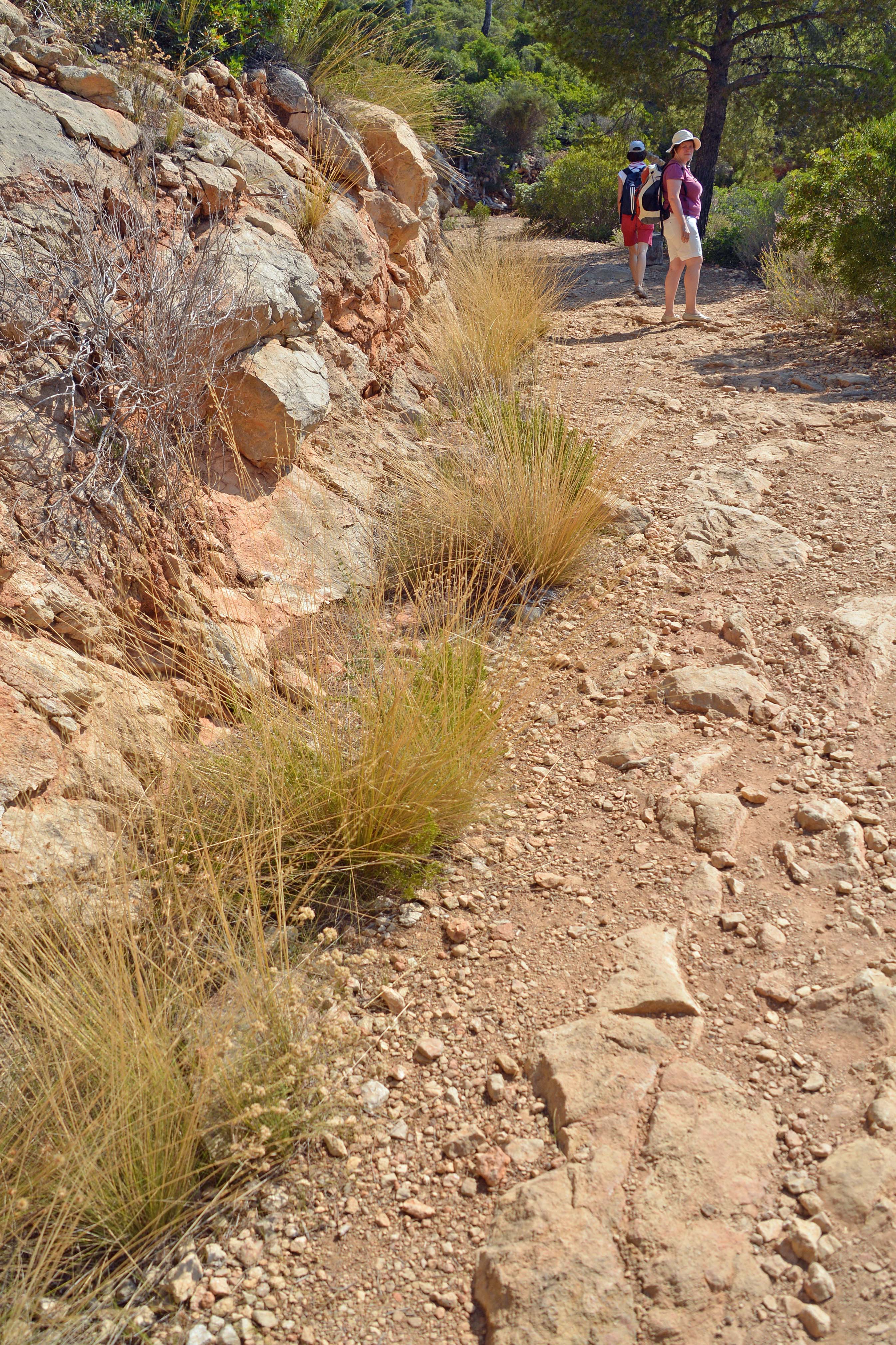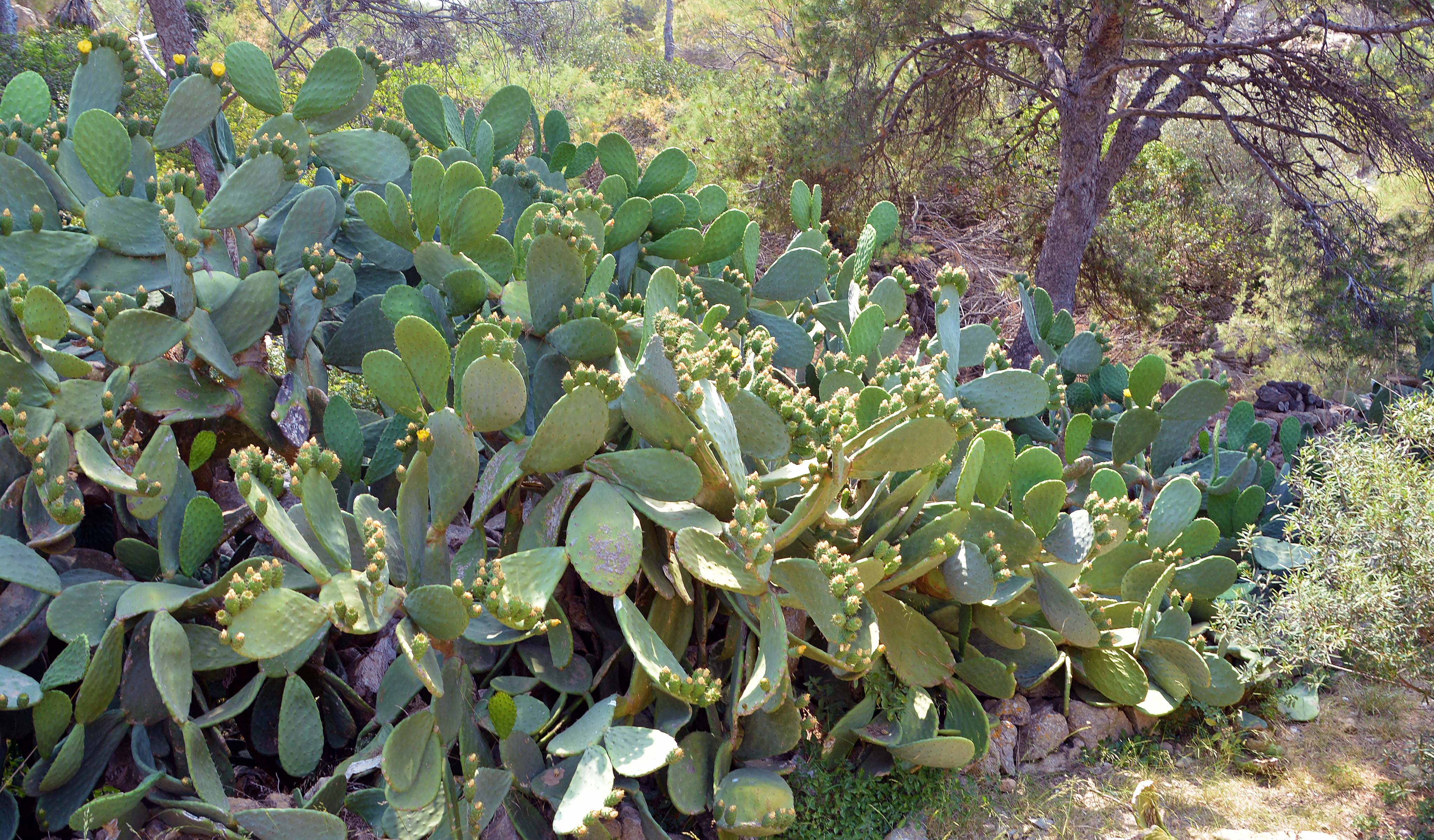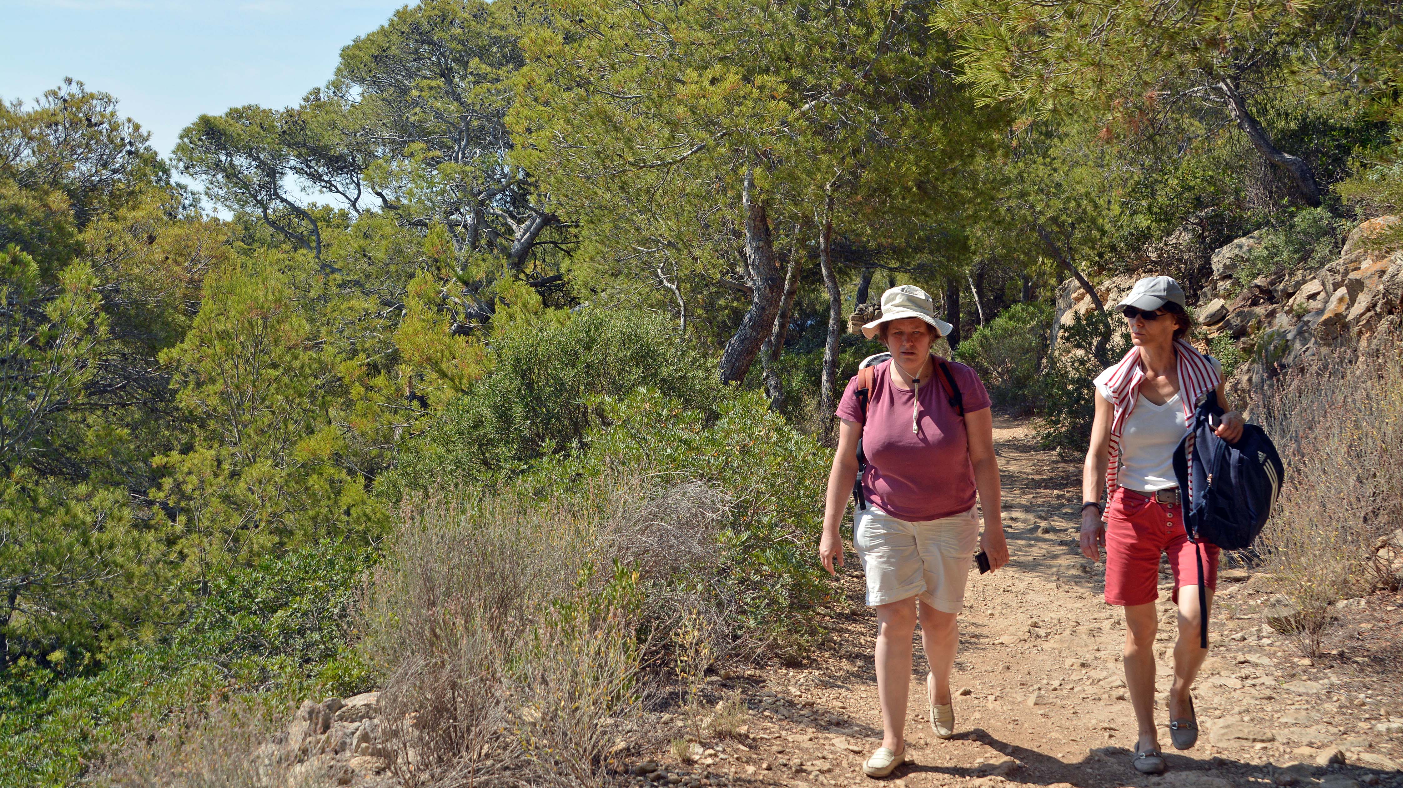 Es ist schwül und sonnig. Der Duft von Rosmarin, Pinien und Kiefern steigt uns in die Nasen und Zikaden machen Musik. Abgesehen von einigen wilden Olivenbäumen und Mittelmeer-Pinien macht die Insel au uns einen kargen Eindruck. Es wachsen vor allem, Kreuzdorn, Zwergpalmen und jede Menge Macchia.