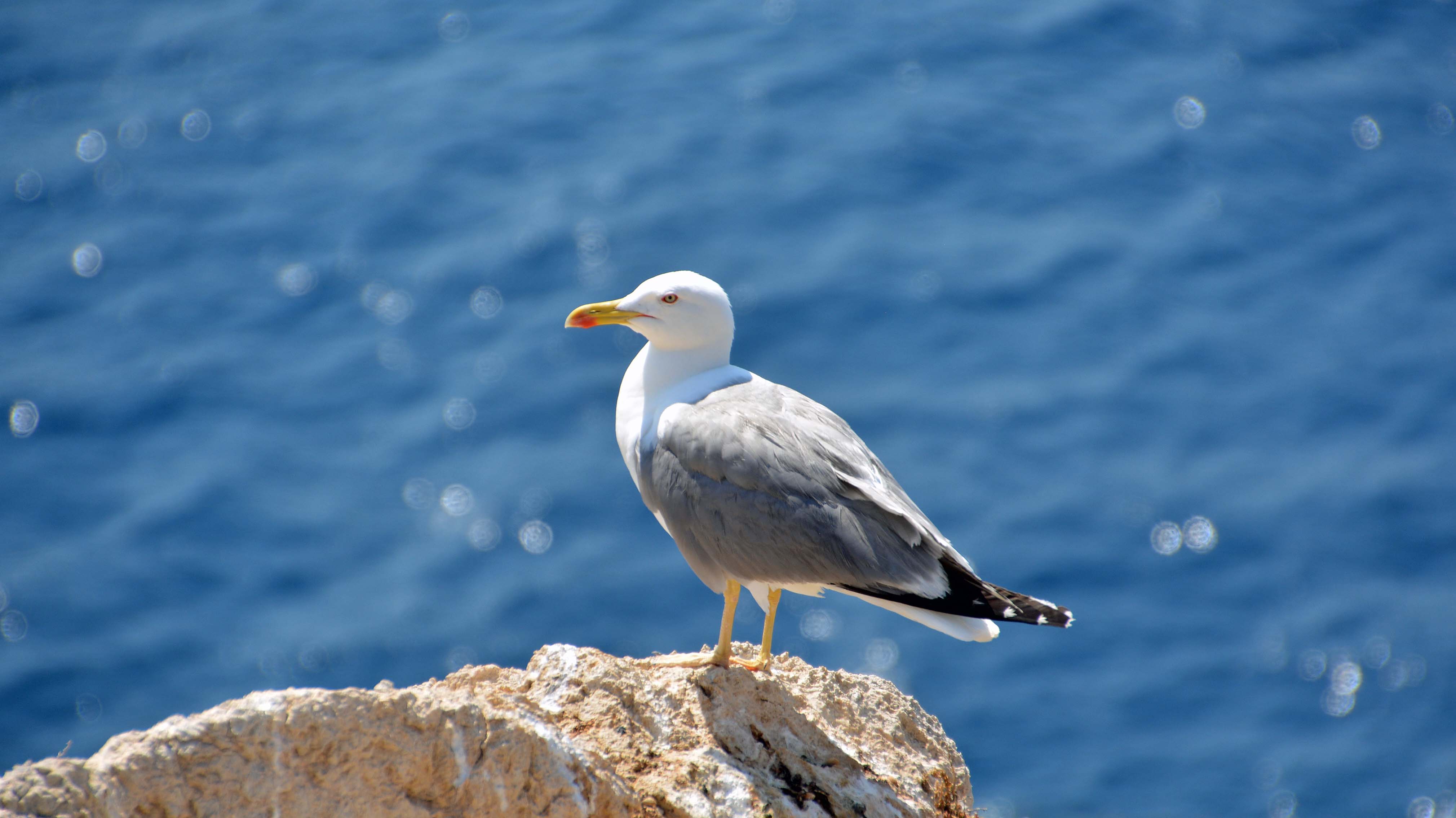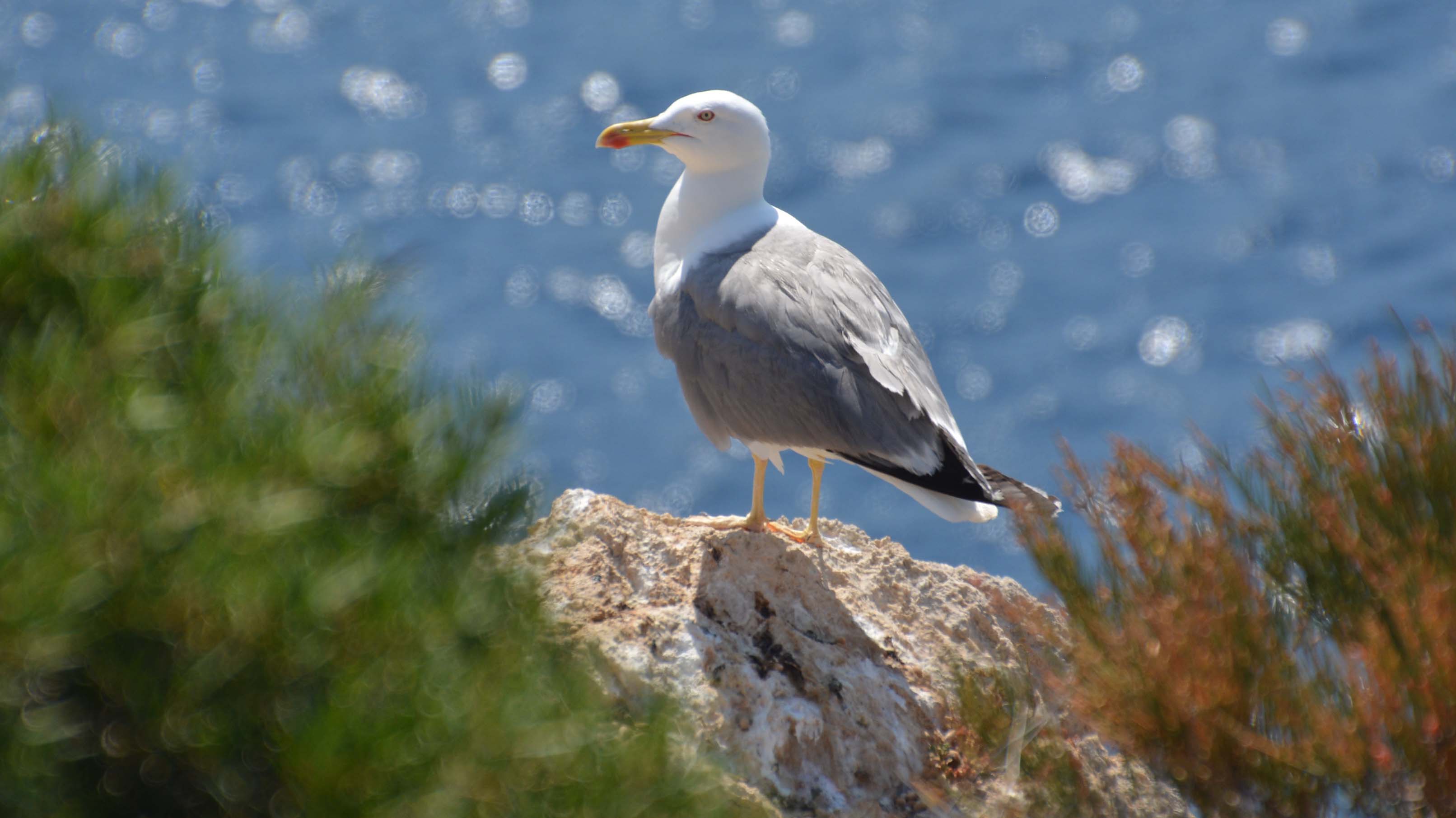 Erstaunlicherweise gibt es hier auch Zwergohreulen, meine Lieblingseule. Ihre Rufe haben mich schon auf zahlreichen Urlauben begleitet. Heute allerdings hören wir sie nicht. Dafür aber das ununterbrochene Kreischen der ‚gemeinen Mittelmeermöven‘. Sie kreisen unermüdlich um das steile Cap, so dass wir befürchten, Opfer ihrer Scheißerei zu werden. Am Leuchtturm haben wir einen tollen Blick auf die Cala en Basset und die Steilküste von Mallorca.