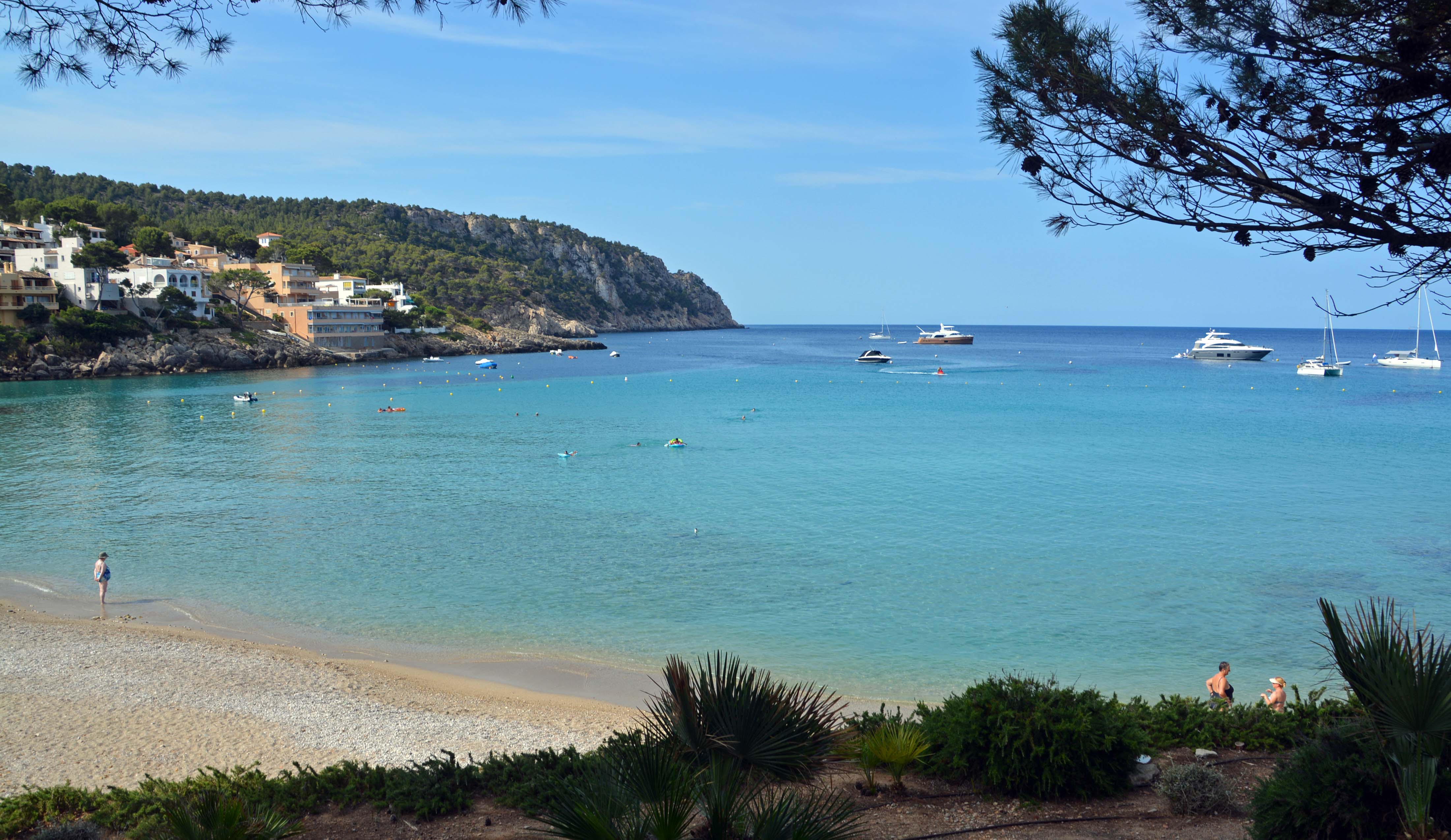 Wir gehen ins Restaurant des einzigen Hotels von Sant Elm und bekommen einen luftigen Tisch mit herrlicher Aussicht auf’s Meer. Glück gehabt, denn 20 Minuten später sind alle Plätze besetzt. Alle Drei entscheiden sich für das mallorquinisches Menü mit umfangreichem Nachtisch-Buffet, 1 ½ Litern Wein und Wasser im Überfluss. Pappesatt und beschwingt gehen wir ganz frech zum hoteleigenen Sandstrand, um das letzte Mallorca-Bad zu nehmen. Schon der Blick von der Hotel-Terrasse ins kristallklare Wasser und auf die in der Bucht vor sich hin dümpelnden Boote ist fantastisch. Wir planschen ein letztes Mal ausgiebig im Mittelmeer und schlendern zufrieden zurück zu unserem Tucson.