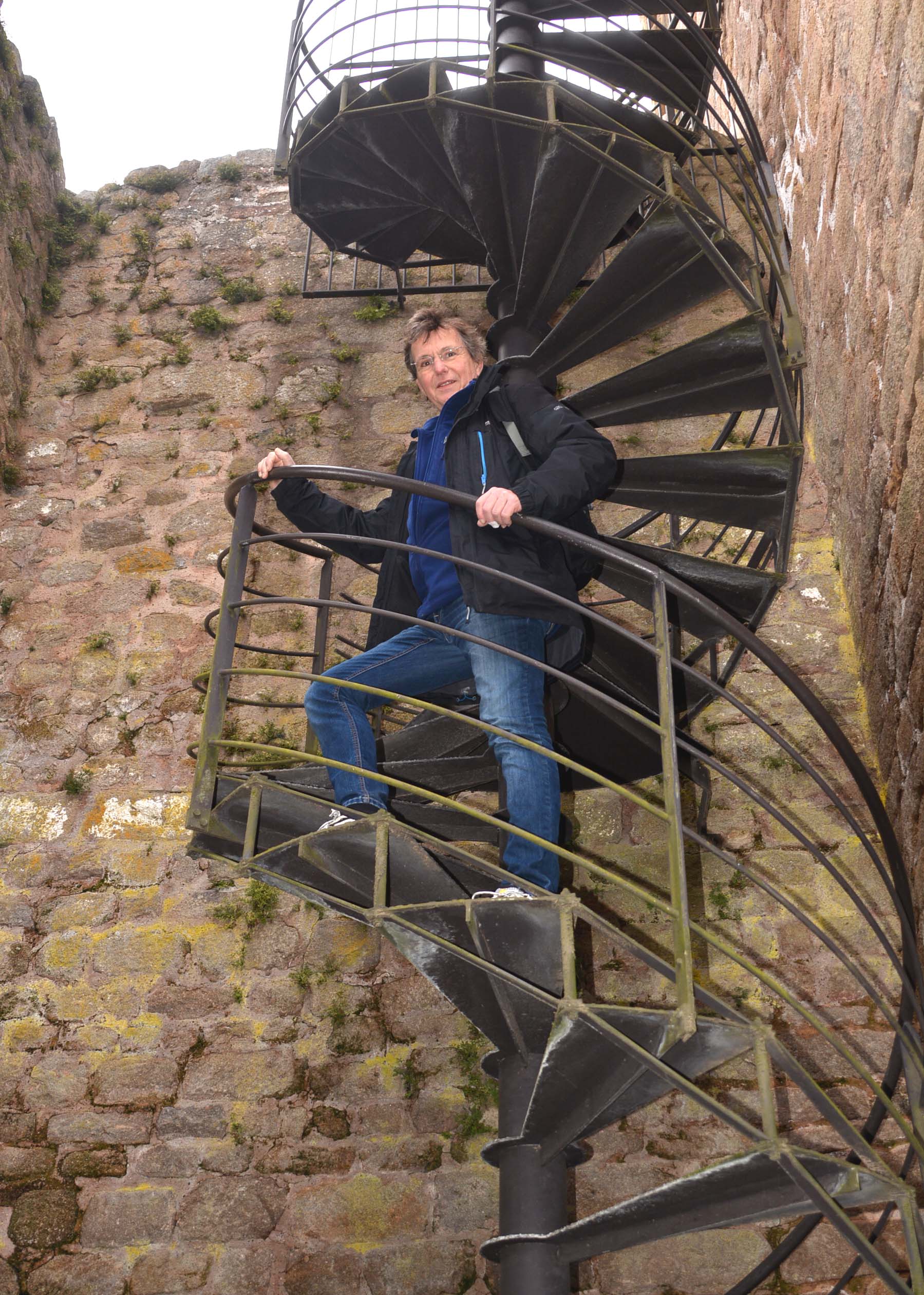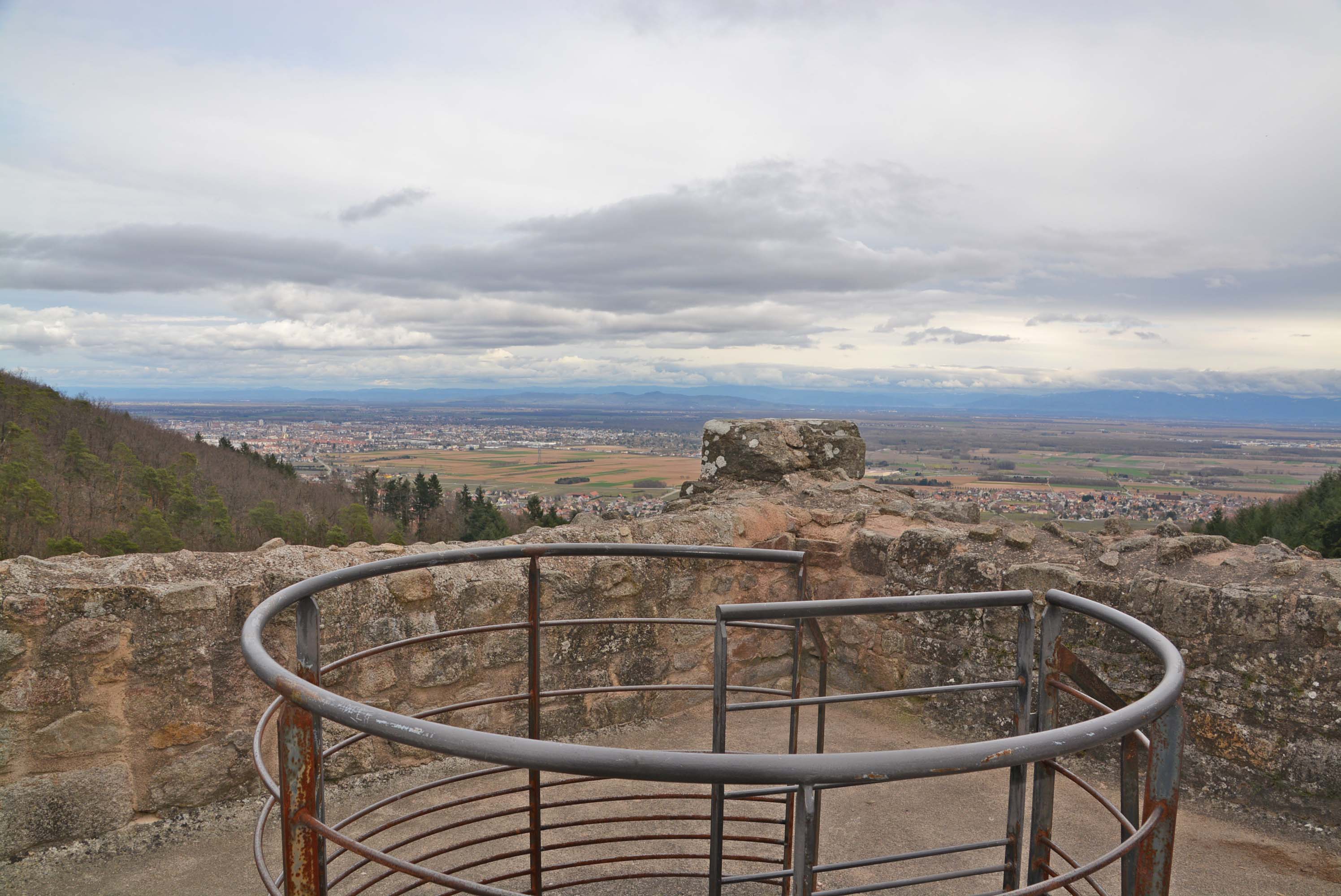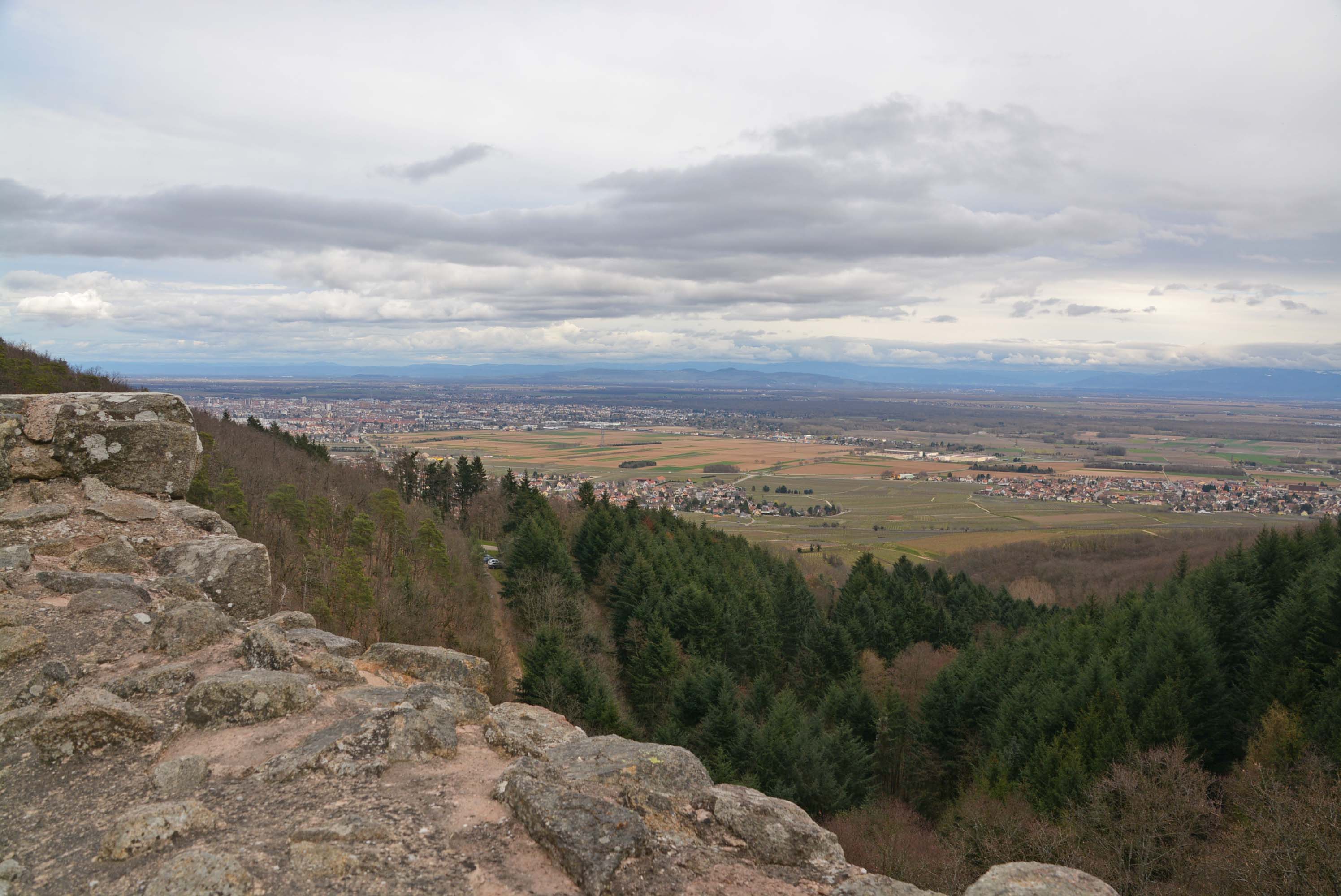 Wir starteten kurz nach halbdrei auf den sehr gut ausgeschilderten Weinbergspfaden. Es ging stetig bergauf. Am Horizont erkannten wir Schneefelder auf dem Grand Ballon der Vogesen. Wir erinnern uns, es ist Sommerzeit! Die Weinreben sind noch blätterlos und haben keinen Bock auf Wachstum. Die drei Egsen wirken in dem diffusen Licht gespenstig. Ein paar wild entschlossene Wanderer kreuzten unseren Weg, außerdem zwei Mountainbike-Fahrer. Respekt. Kurz vor der Burgruine ging es einen schmalen Pfad auf wunderbar weichem Waldboden steil hinauf auf den Granitfelsen. Und da lag sie dann vor uns. Erstes Ziel erreicht.