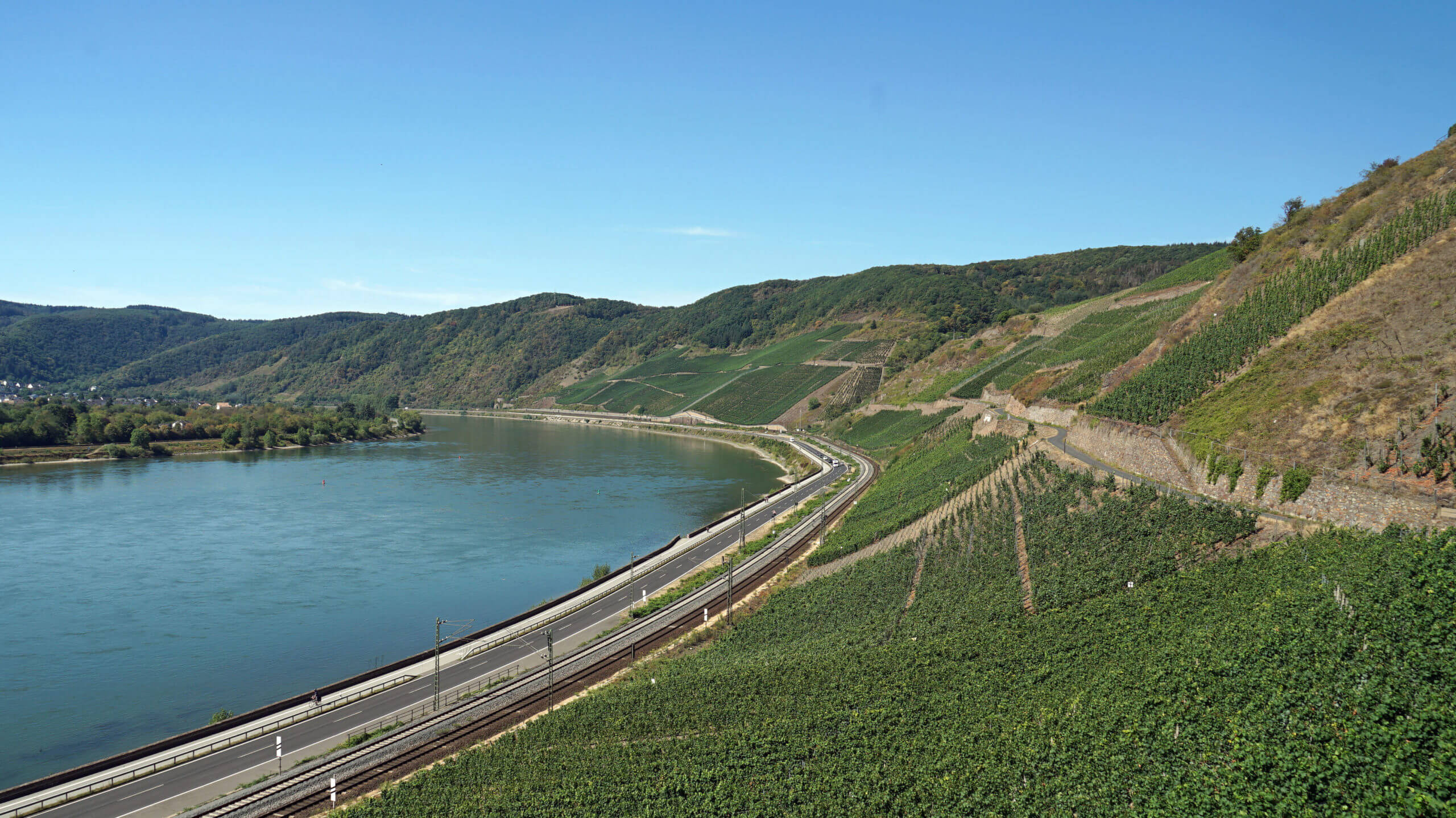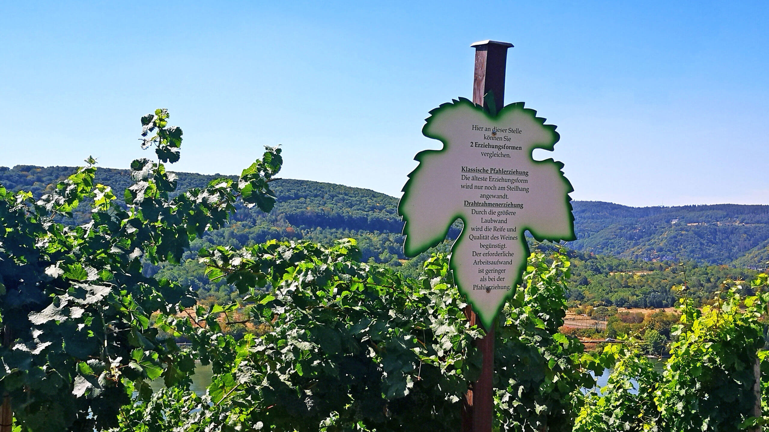 Die Wege führen durch verschiedene Lagen mit unterschiedlichen Reb-Erziehungsmethoden und vielen Informationstafeln. Ich bleibe fast ununterbrochen stehen, um die majestätischen Panoramablicke auf den Rheinverlauf und die Städte Osterspai, Filsen und Boppard auf mich wirken zu lassen. Es gibt genug Rastbänke und Plätze – leider alle in der prallen Sonne – wo man seine Gedanken schweifen lassen und die fantastische Natur bewundern kann. Leider muss ich meinen verletzten Zeh verarzten und finde dazu tatsächlich einen schattigen Unterstand. Mittlerweile ist es brütend heiß und ich trinke, was das Zeug hält. Irgendwann auf dem weiteren Weg komme ich am Aussichtspunkt ‚Mandelstein‘ an. Von dort sehe ich klitzeklein mein Rad, dass ich unmittelbar am Weinfass abgestellt habe. Hier meldet sich der Bauch und vermittelt dem Kopf nach ca. 7 Kilometern die Wanderung abzubrechen. Diesmal gewinnt der Kopf.